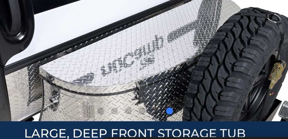 Adventure-Ready UpgradesAggressive off-road tires and pitched axle for rugged terrain Boondock entry handle, fenders, and aluminum utility platform Molded underbelly shield and diamond plate storage tub Alloy wheels and full-size spare included