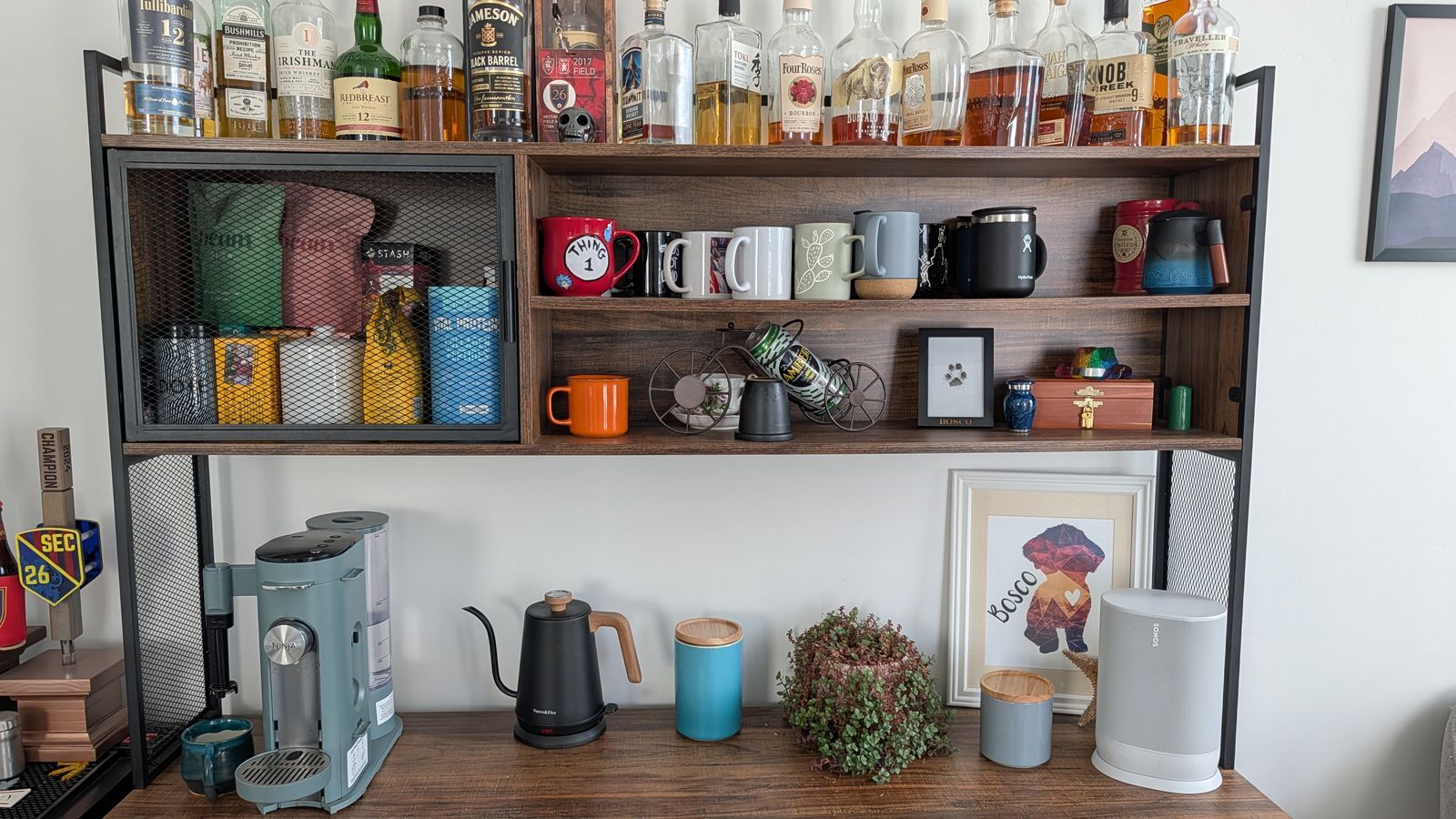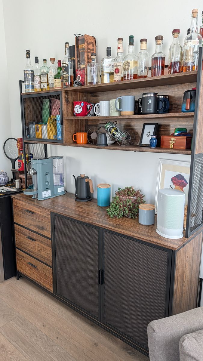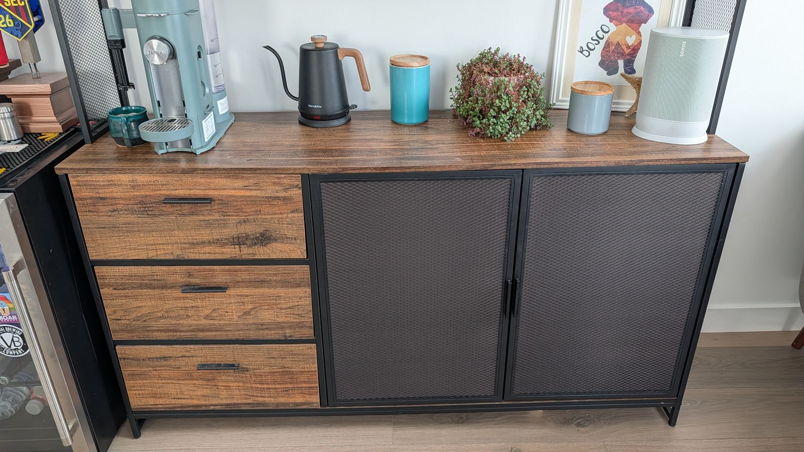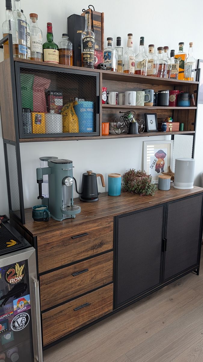 VenmoThis hutch is a perfect mix of rustic wood tones and sleek black metal, making it an ideal coffee station or home bar. It features a spacious countertop, a dedicated shelf for mugs or spirits, and a top gallery for additional display. With three deep drawers for organization and two large mesh-front cabinets for tucked-away storage, this sturdy and versatile piece offers plenty of room to your kitchen or dining space while adding a modern look.
