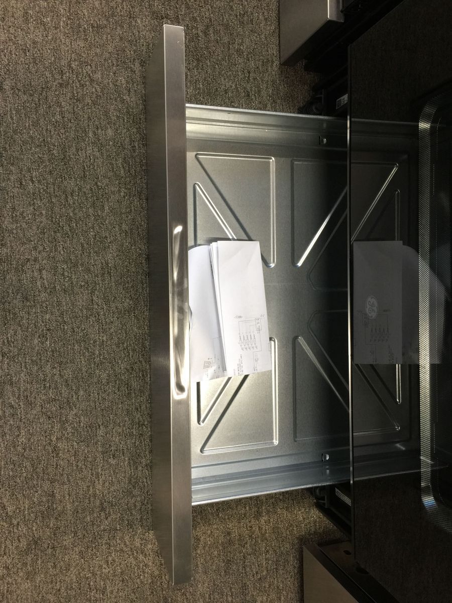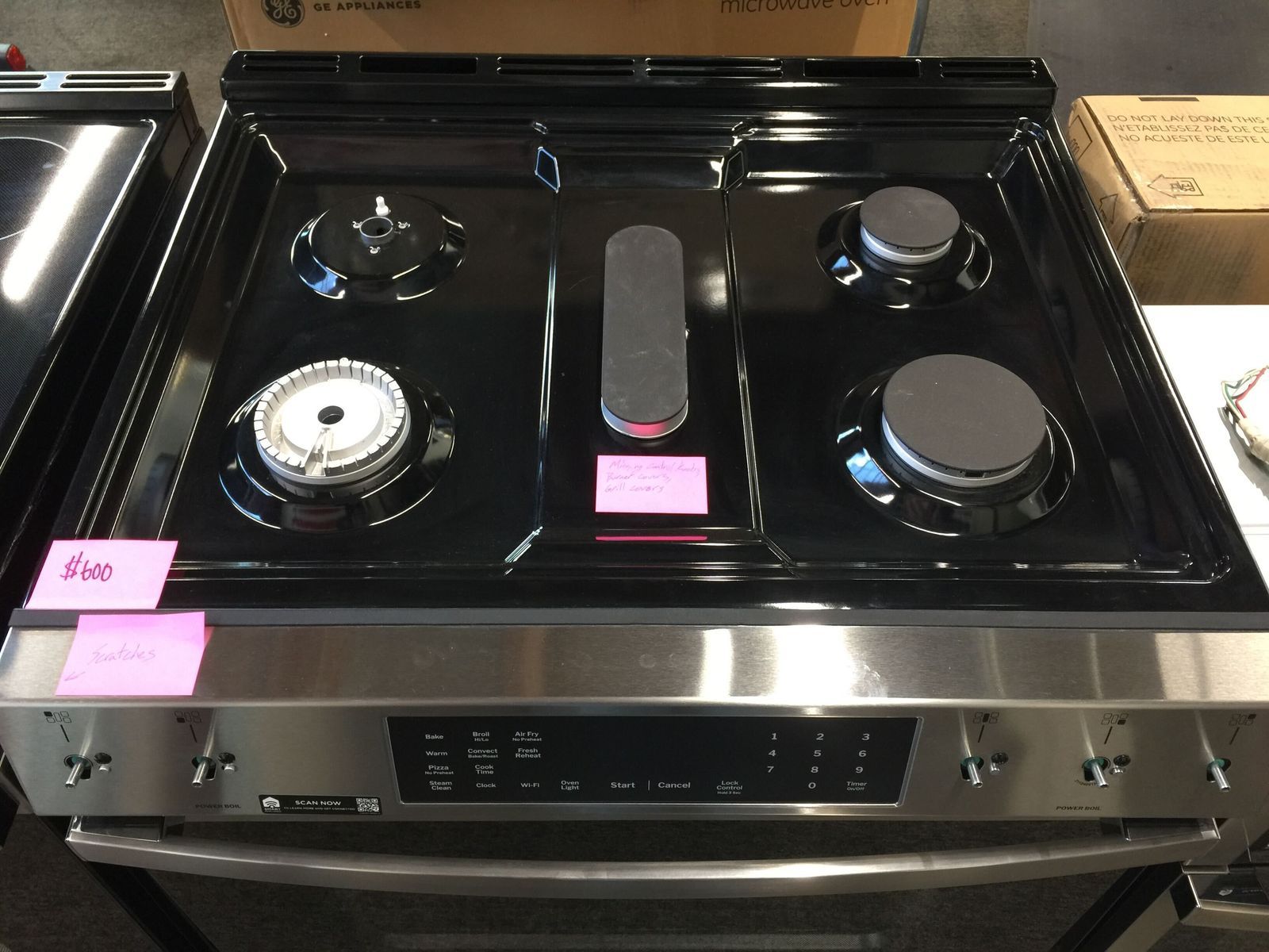 The unit is missing the front control knobs as well as the burner and grill covers on the range, but the oven is new, unused, and in proper working condition.