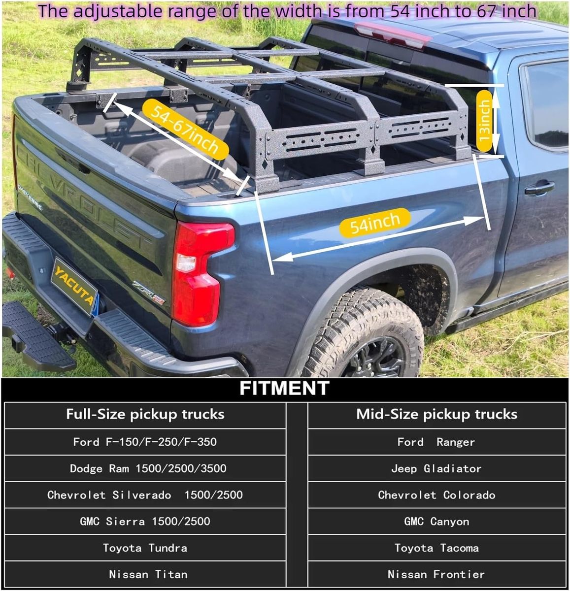 About this item - FitmentThis truck bed rack cross bars width is adjustable,The adjustable range of the width is from 54 inch to 67 inch.Perfect for all kinds Pickup Trucks.Such as Full-Size pickup trucks: Ram1500/2500/3500|F-150/F-250/F-350|Silverado1500/2500|Serria 1500/2500|Titan Tundra. Mid-Size pickup trucks: Jeep Gladiator|Tacoma|Ranger|Canyon|Colorado|Frontier.
