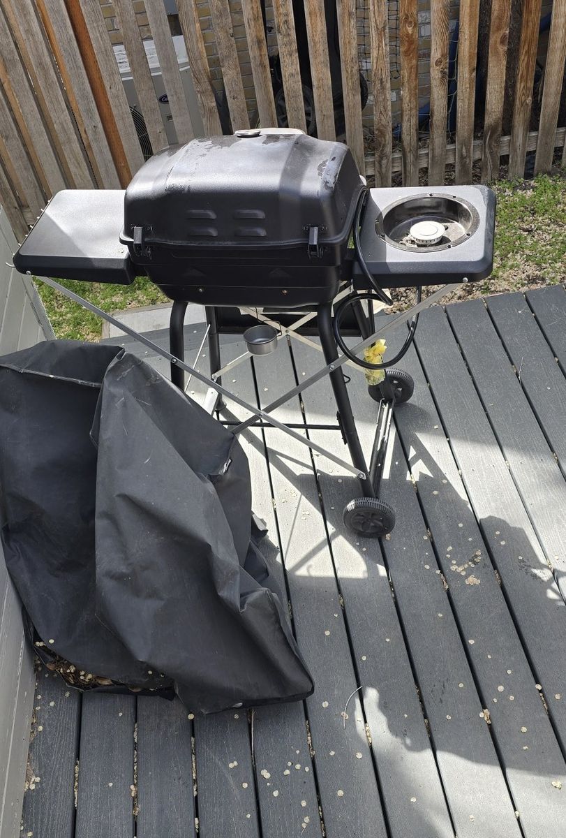 char broil dual burner and Side burner gas grill with cover, modified to make it more solid and stable. Propane tank not included