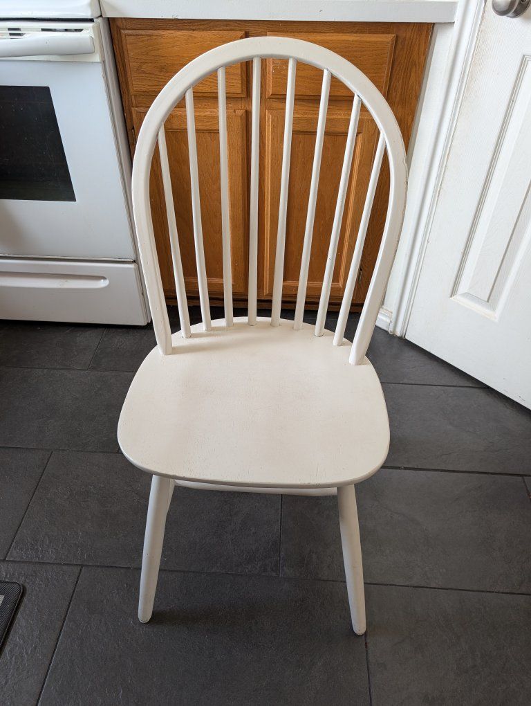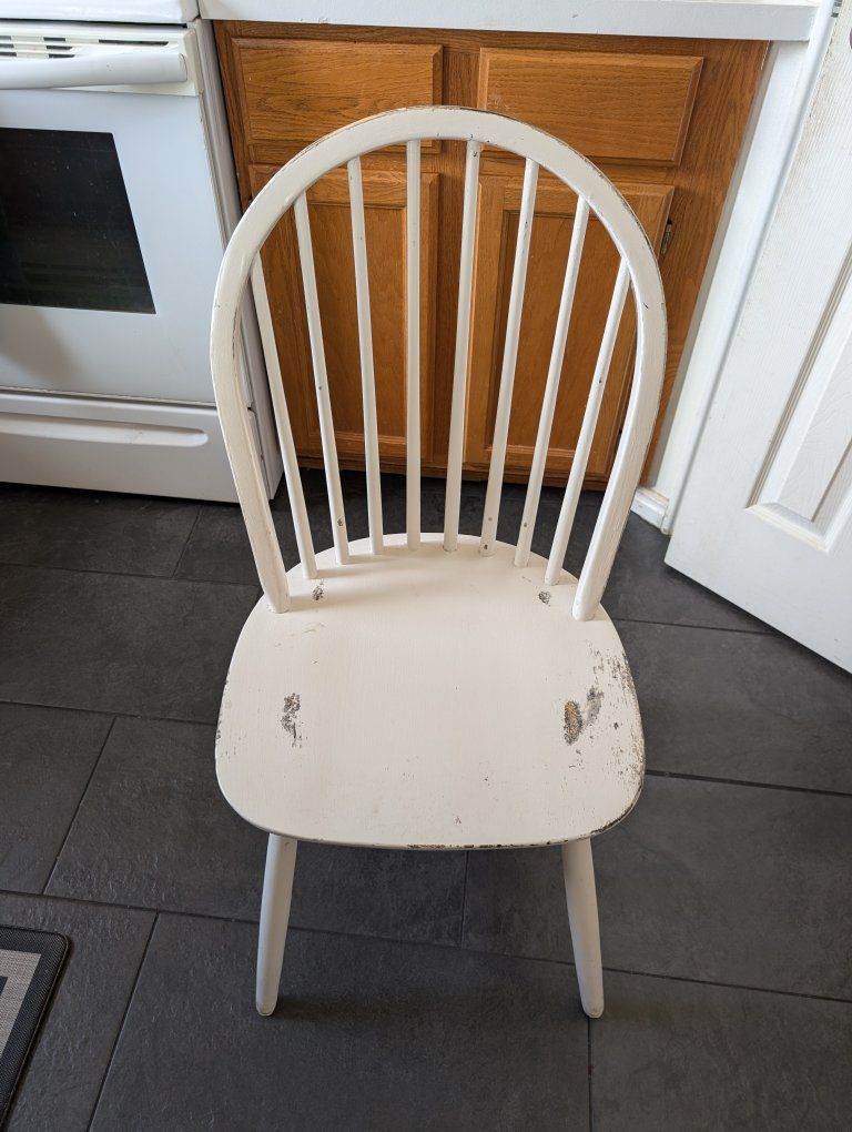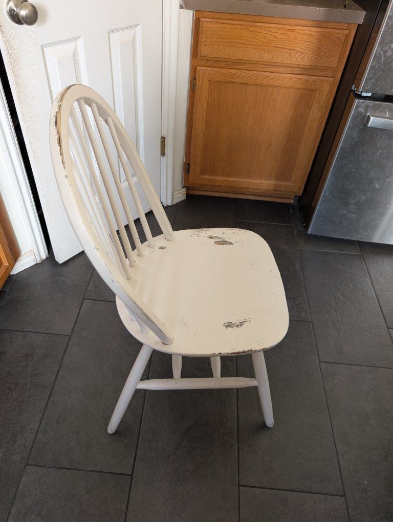 Venmo6 sturdy white dining room chairs. All of them have some worn out paint although the amount of scuffed paint varies with each chair. The chairs with the least and most scuffing are pictured. $100 for the set.