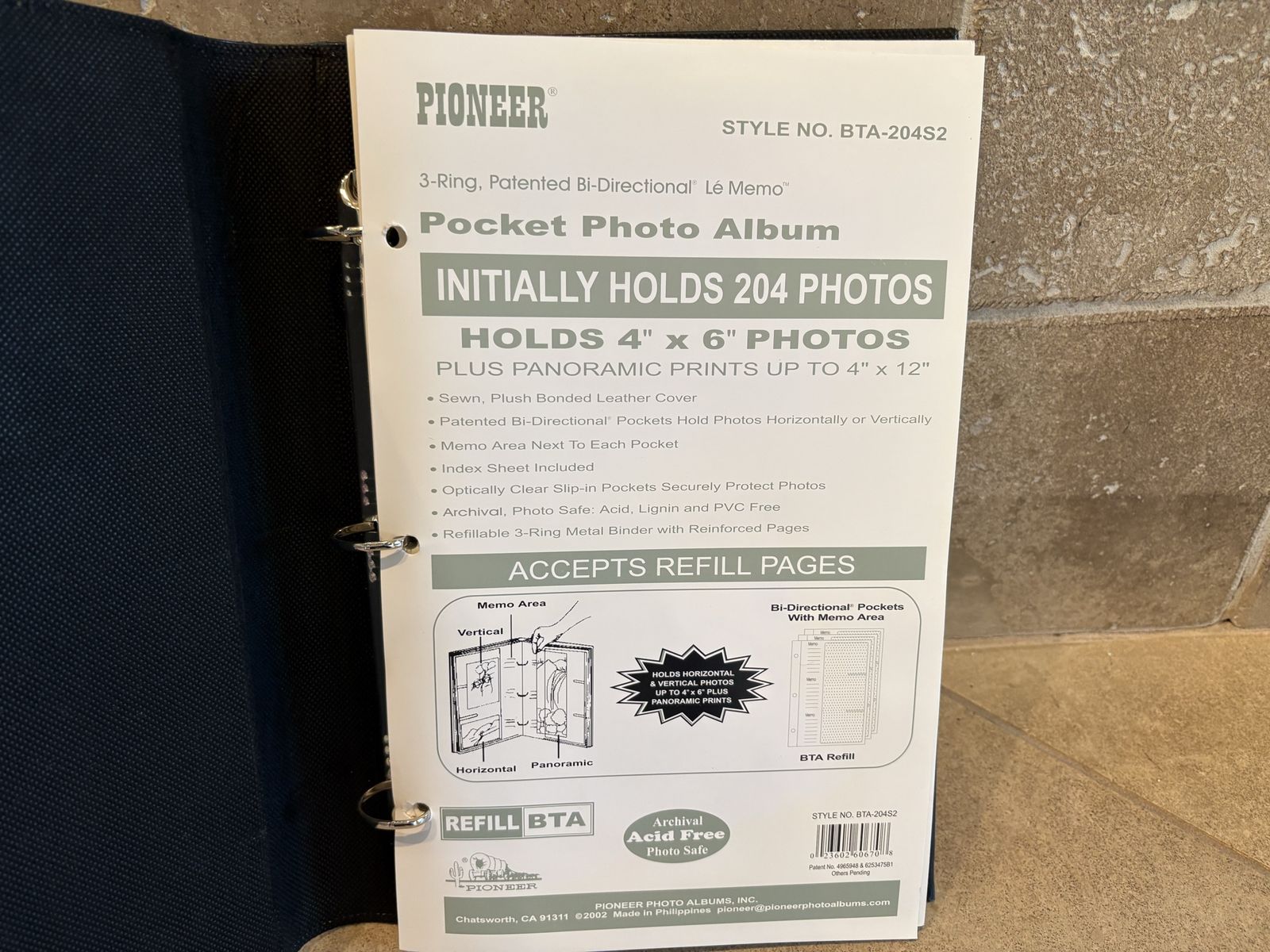I have a dark blue Pioneer with slip in pictures and space to write next to them. It holds 204 pictures but you could add more pages. It is 14 inches tall and about 9 1/2 inches wide. It’s in good condition but on the back cover there are a few marks that are like little dents (see the last picture). See my other ads for jewelry, artwork, home decor and more.