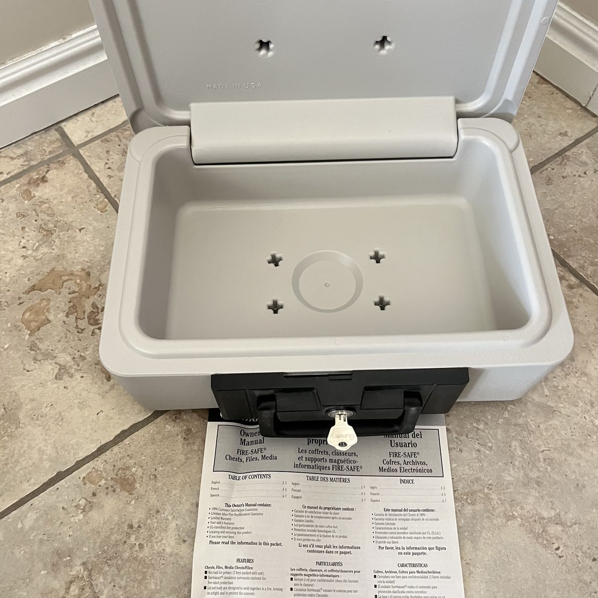 Smaller home safe in good working condition. Comes with one key.