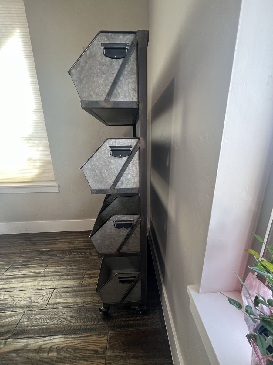 26.5” wide, 10.5” deep, 51” tall Great shape. Used it for a retail shelf to hold essential oils. Can be used for produce, tools, crafts or whatever your heart desires.