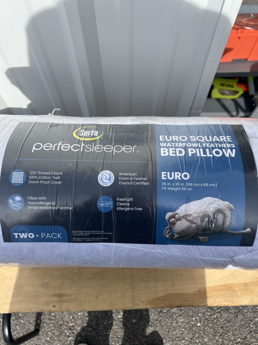 GooglePaySerta Perfect Sleeper Euro Square Waterfowl Feather Bed Pillow 2-Pack. Size: 26 in. x 26 in. (66 cm x 66 cm) Fill: Hypoallergenic small waterfowl feather, 50 oz fill weight Cover: 230 Thread Count 100% Cotton Twill Certification: American Down & Feather Council Certified
