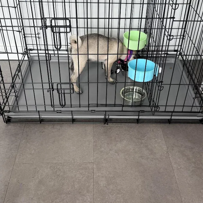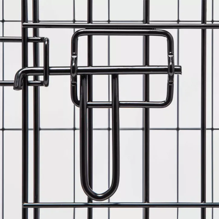 Set up a comfortable, airy home for your fur baby with the Wire Collapsible Crate from Boots & Barkley™. Featuring an open, fence-style design that lets you easily see your pooch, this crate has a metal frame that is easy to set up, and it folds flat for easy storage when not in use. The plastic floor tray is easy to clean if they happen to have any accidents, and the latched door ensures they stay where they're supposed to be. Also includes a divider panel. Just insert the divider panel with the hooks facing the back of the crate. Attach the hooks to the vertical wire on each side. Ensure the divider panel is straight and allows the puppy room to enter the crate, turn around and lie down. Adjust as the puppy grows. Toss in their favorite squeaky toy and blanket to create a space they'll feel safe in.
