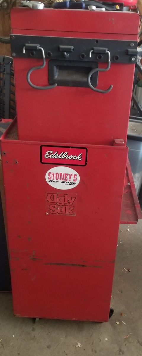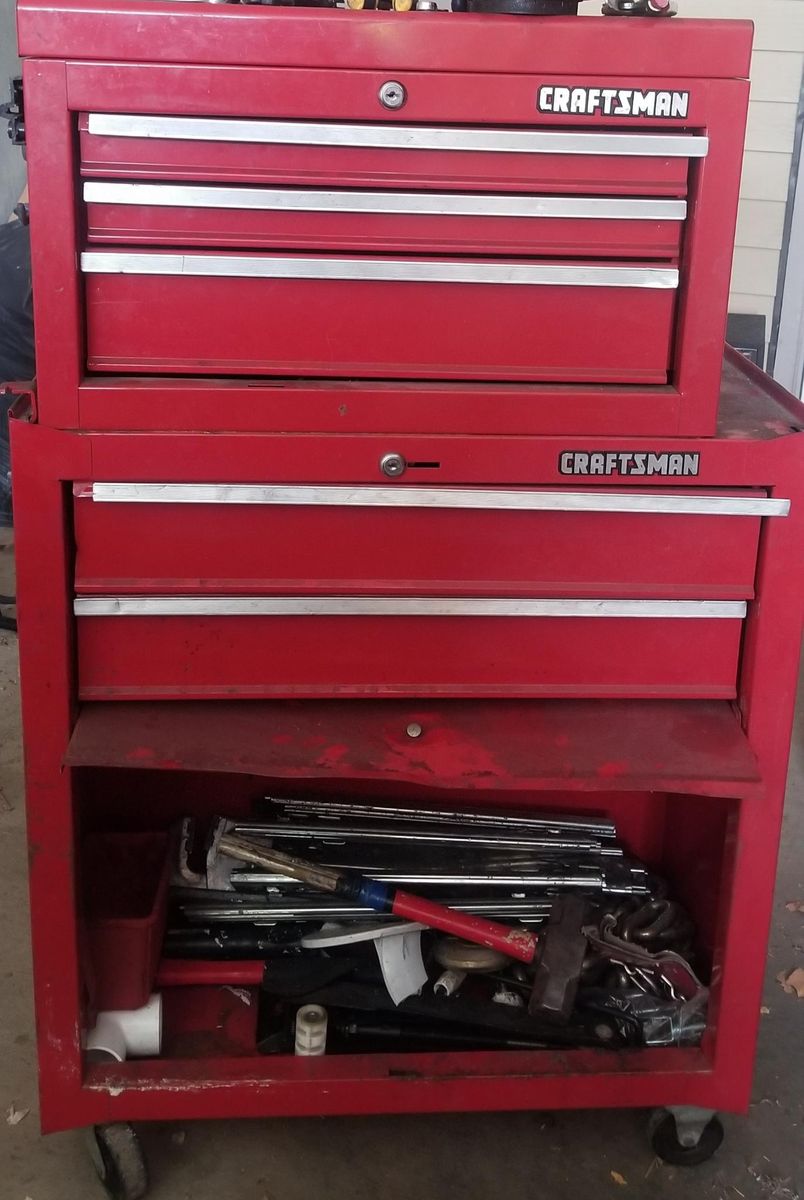 5 drawers with large storage cabinet *Rust free. This Craftsman served me well for a long time and now needs a new home. It's seen better days I lost the keys years ago, but new keys can be purchased online for $9. I will degrease it before I send it off so if you need to stuff it in your car it will be clean. $100 O.B.O
