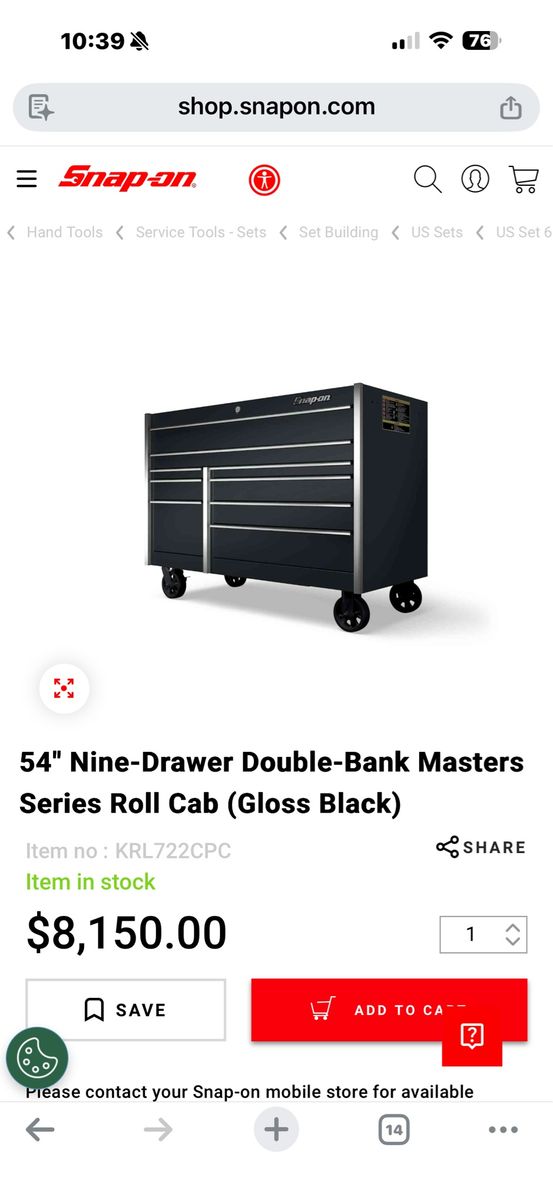 VenmoIt’s Priced on Snap on for $8100. Brand new never used. Extended cab system features (2) extra-wide drawers (3 and 5" depth) that span the full-width of the roll cab • Corner gusset design strengthens the roll cab without reducing the storage capacity • Heavy-duty drawer slides support up to 227 lb per set • An additional set of slides can be added to any 4" or deeper drawer (standard on 5" full-width drawer) • Lock 'N Roll® System prevents drawers from drifting open when the unit is moved • 2" mounting centers for maximum drawer arrangement flexibility • Optional drawer control permits only one drawer per bank to be opened at a time reducing the chance of the unit tipping • Unit also includes non-slip drawer liners $4000 OBO