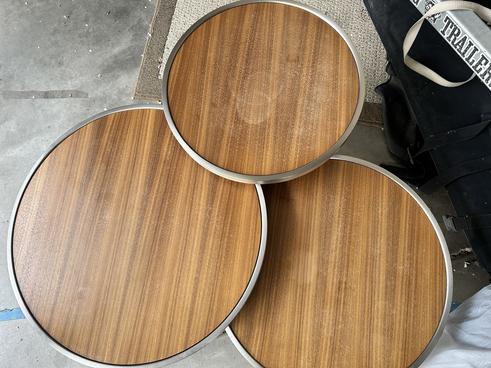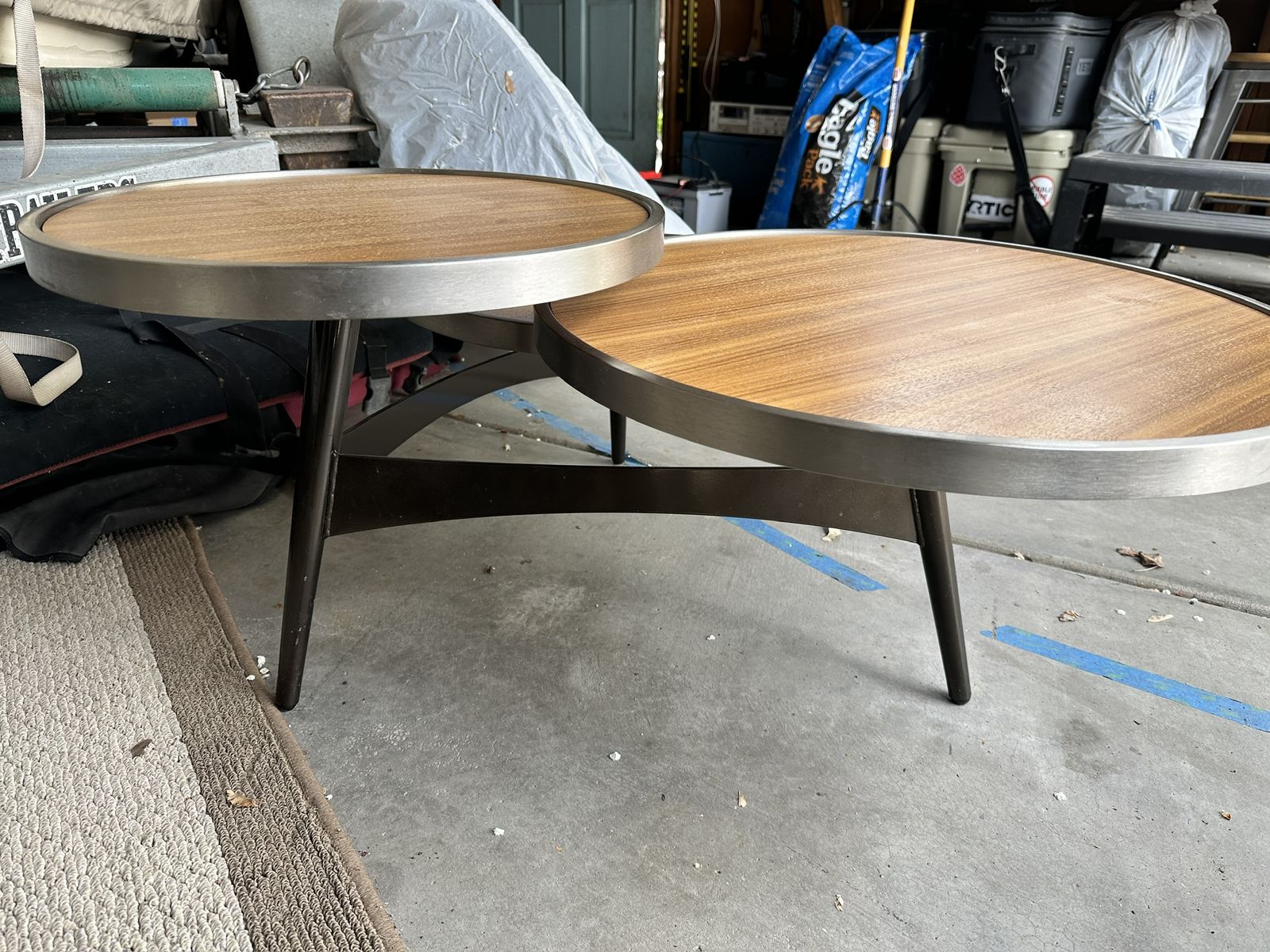 This is a very well-made coffee table that adds a unique touch to your space. It's solid walnut and metal, purchased for $769 from Copenhagen West in 2018. It has a water stain on it, unfortunately, which you can see from the pictures. It is 42" at its widest and 18" high at its tallest level.