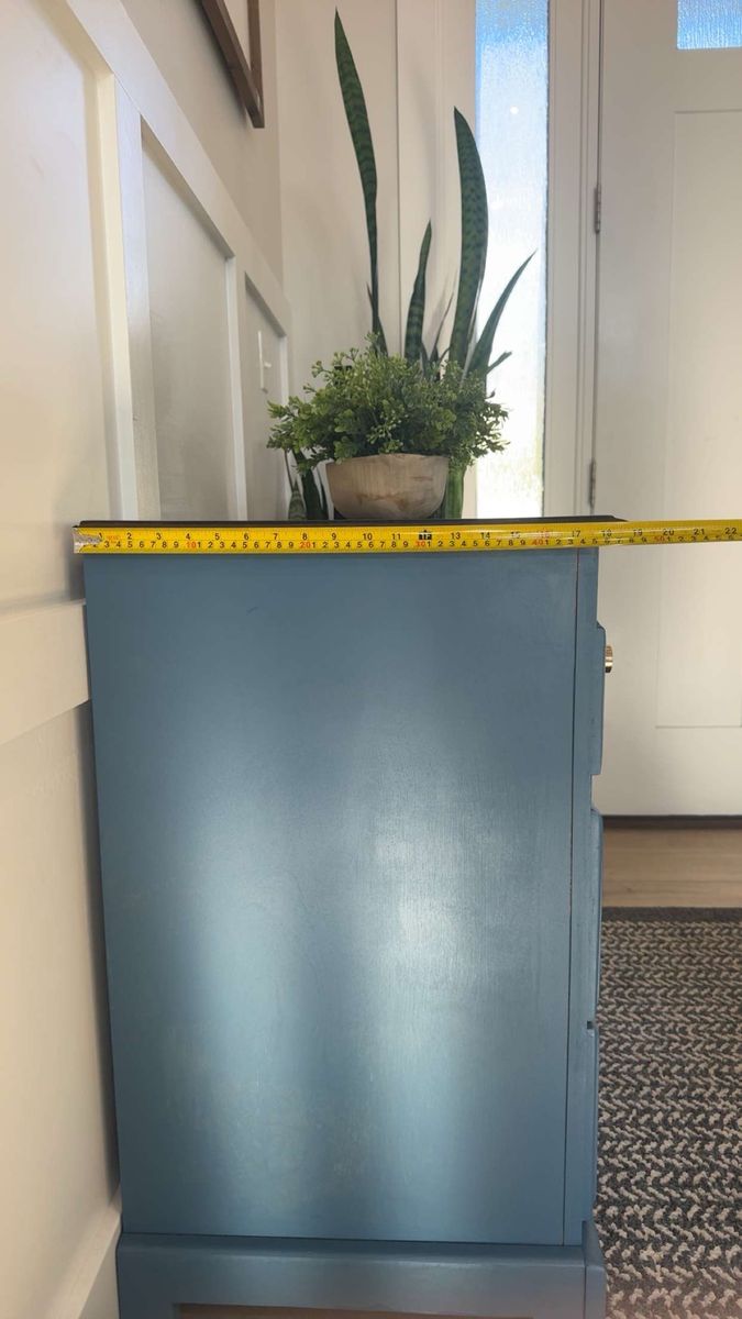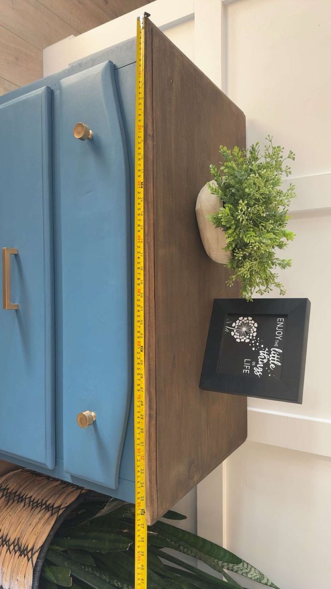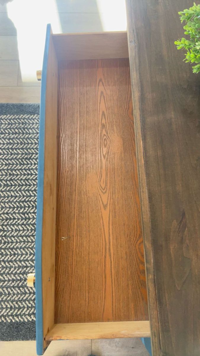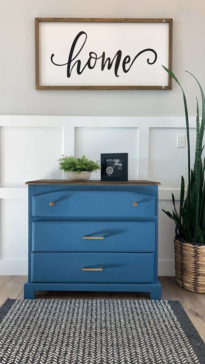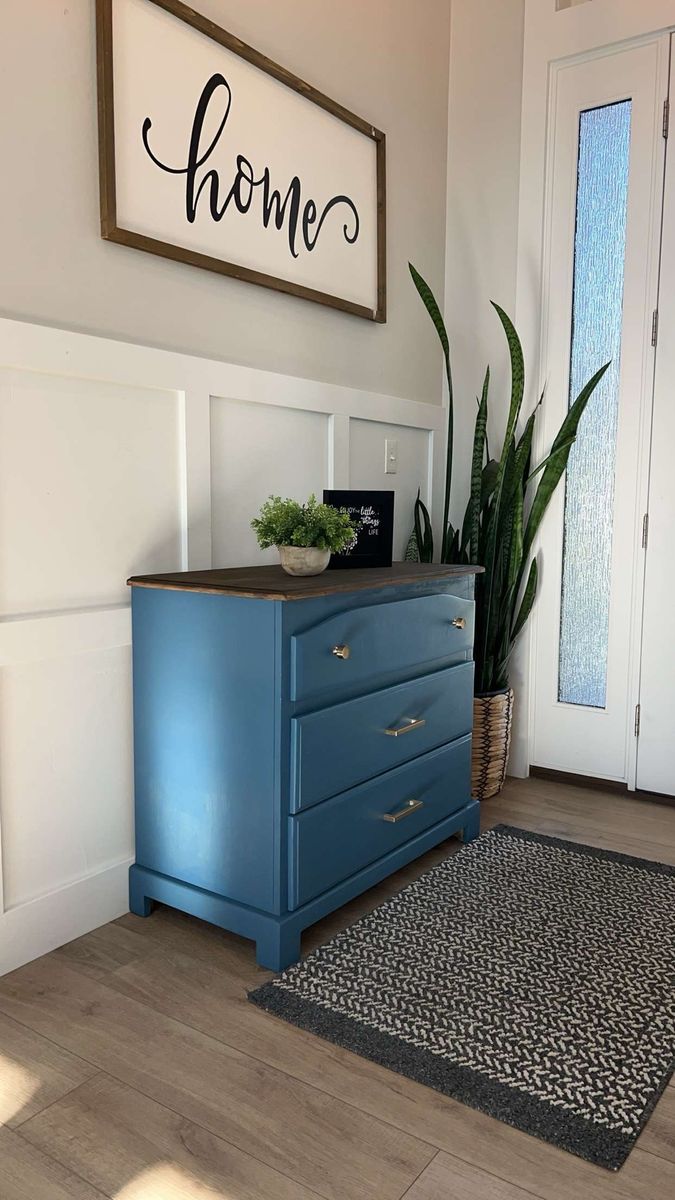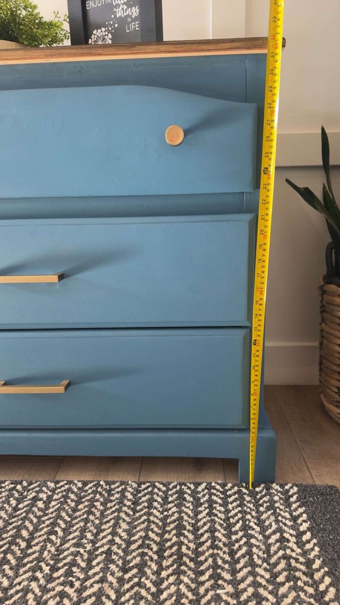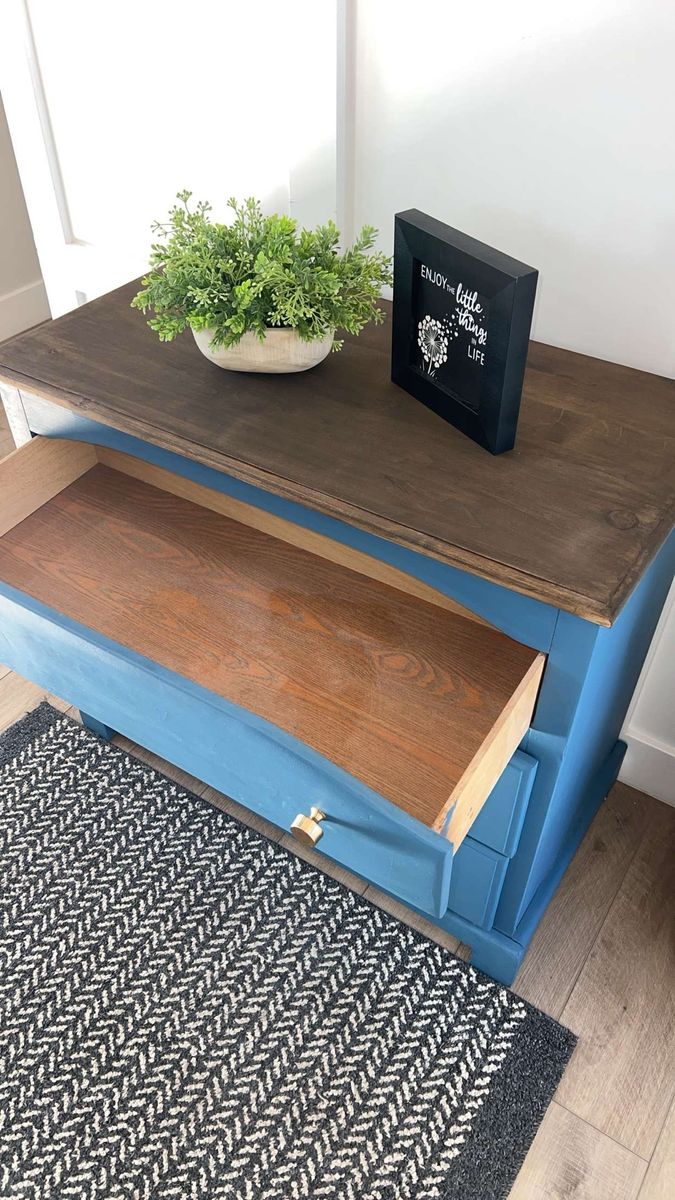 VenmoModern farmhouse accent piece Beautifully refinished 3-drawer dresser in a rich blue tone with a warm wood top and gold hardware. Perfect for a bedroom, entryway, or living space. Smooth drawers, sturdy build, and a unique pop of color that fits both modern and cozy styles. Great condition Stylish + functional storage Ready for its new home Message me if interested!