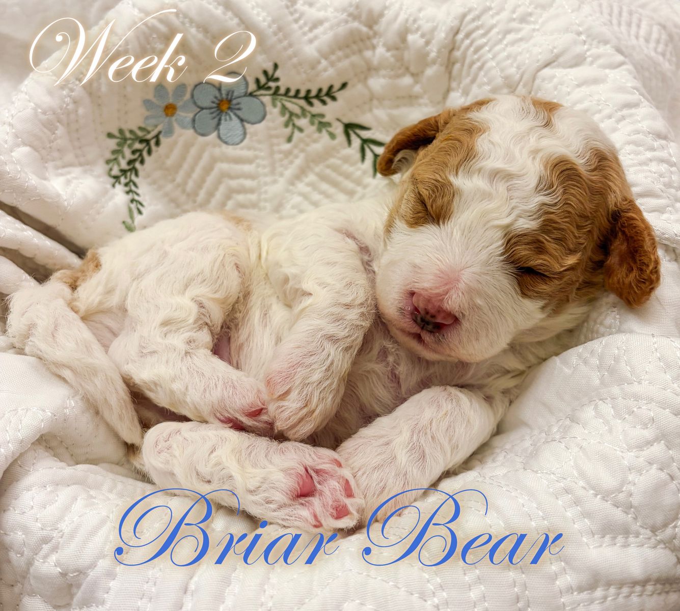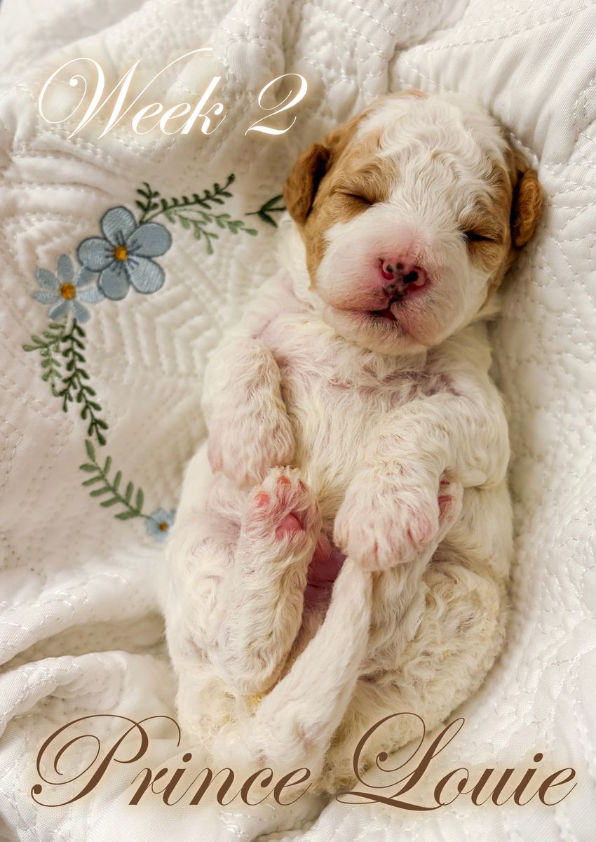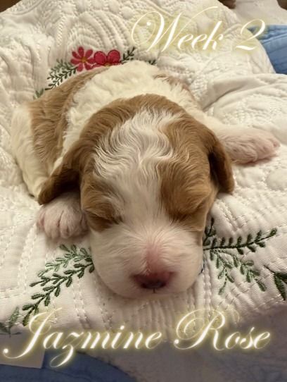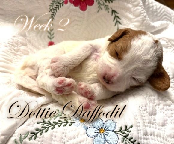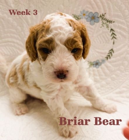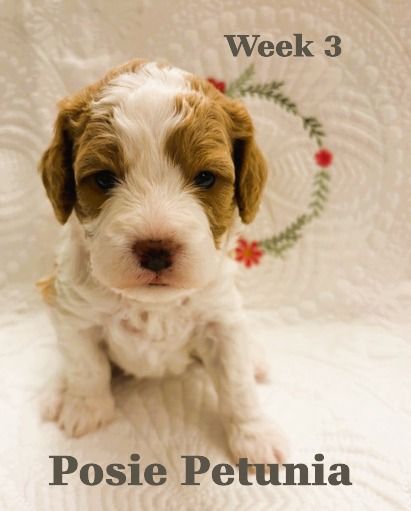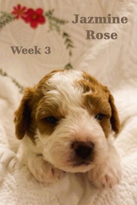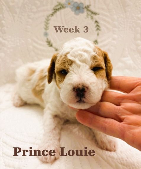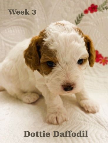 ZelleWe have 5 adorable puppies available for end of May. They were born March 22, 2026 to Daisy (Momma, Cavachon 13 lb) and Gunner (Dad, Mini Poodle 8 lb). All healthy and happy little pups with beautiful Blenheim coloring (White and Brown). 3 Female and 2 Male are available. If you want the pick of the litter, they are all still available and unspoken for. They will be ready in about 4 weeks for their forever home. Hypo-allergenic, dew clawed with 1st shots with deworming. Each will be sent home with it's own personalized embroidered blanket. If you want to come see them, we live in Cedar Hills. Just text me... but be prepared to fall in love. They are incredible little sweethearts and all seem to have really good temperaments. They love to be held and pampered already at 3 weeks old. Mom and Dad are pictured with their two and three week photo shoots. Happy doggy hunting!