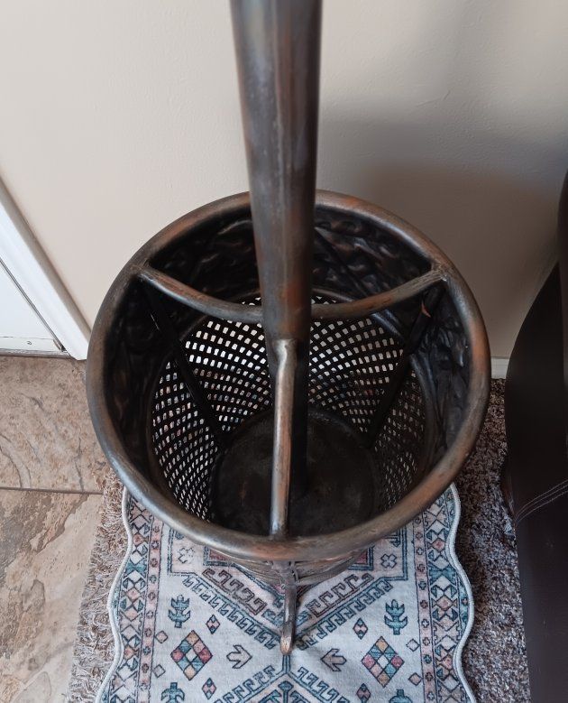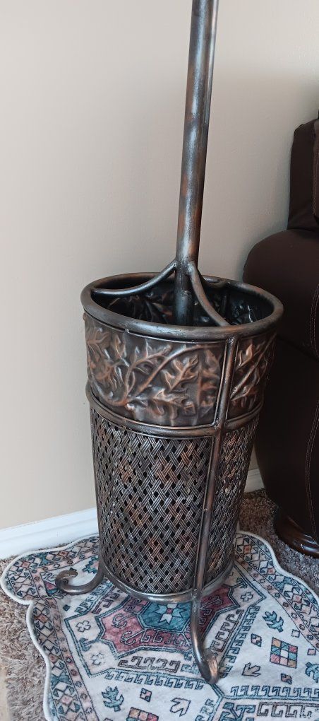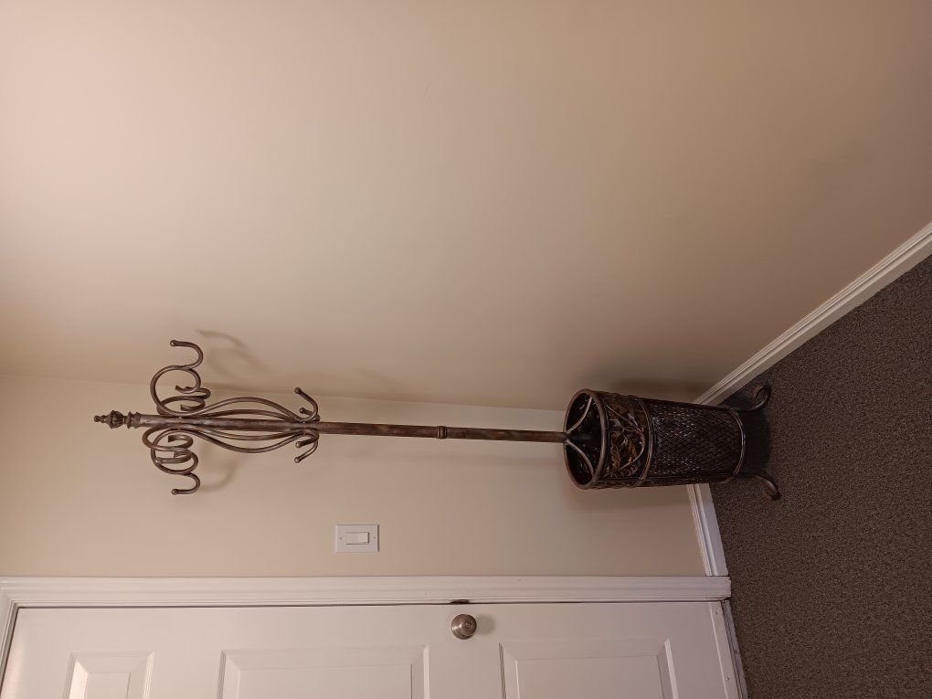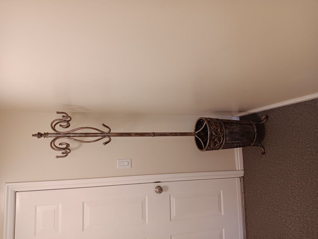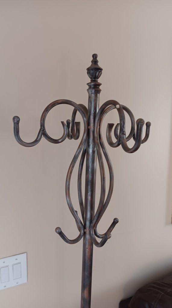 VenmoA free standing jacket/coat hanger and umbrella holder at the base. Made of light metal(aluminum possibly) with a sprayed metallic look to it. 6' 2" tall, umbrella holder is 12" across.