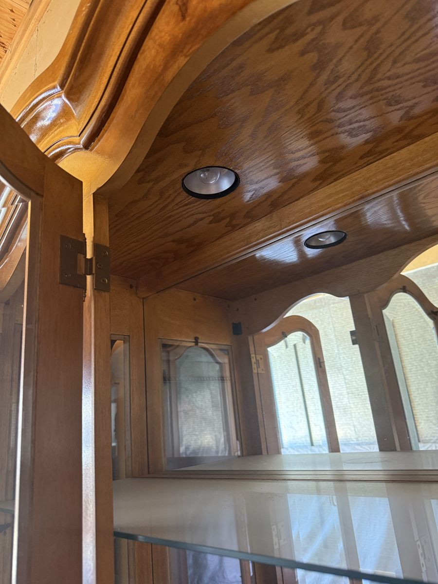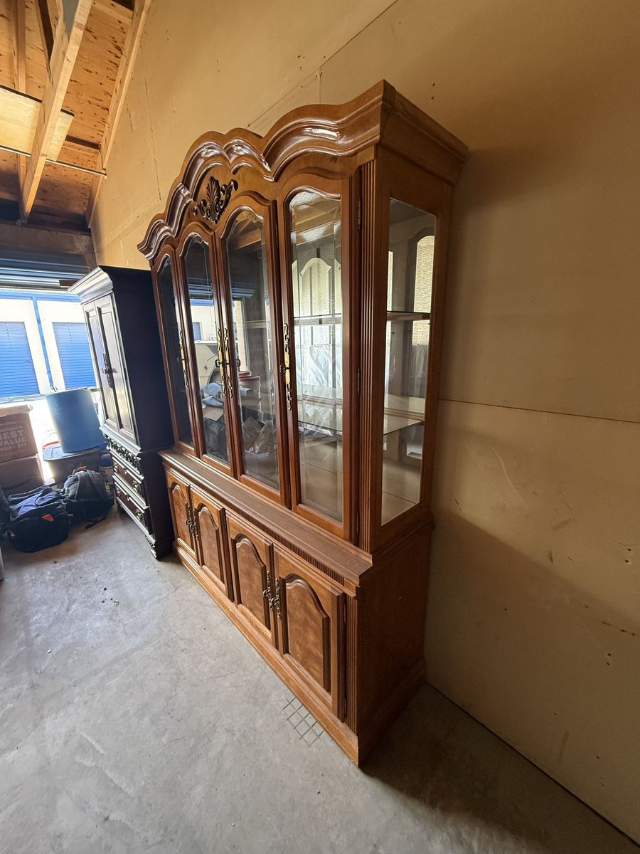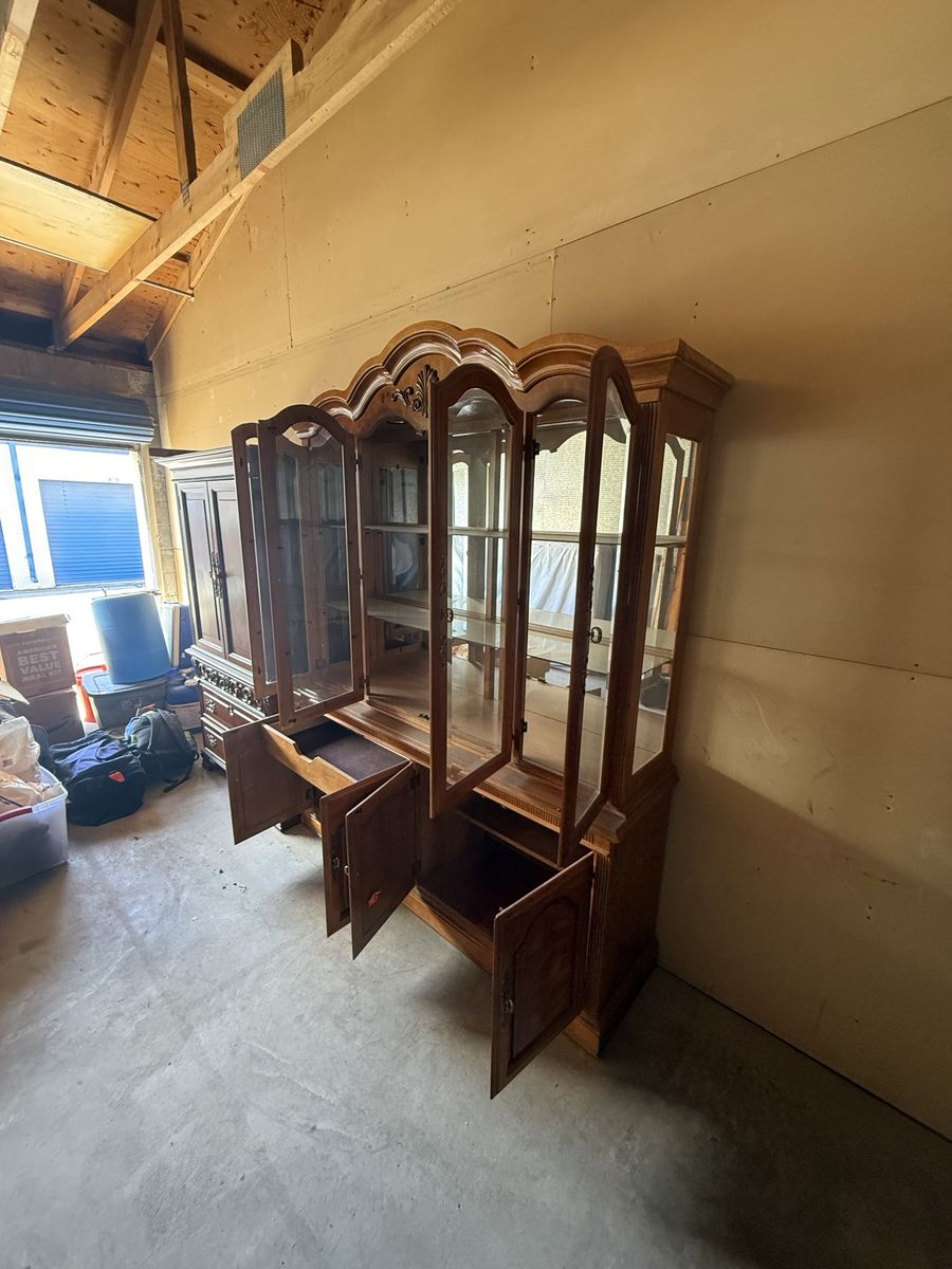 ApplePayBeautiful solid wood china cabinet in great condition. Features a classic arched top with glass doors for display and a spacious bottom cabinet for storage.