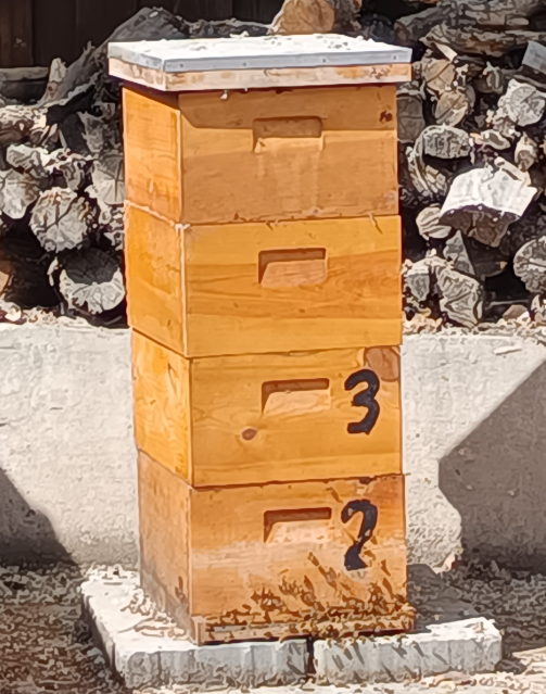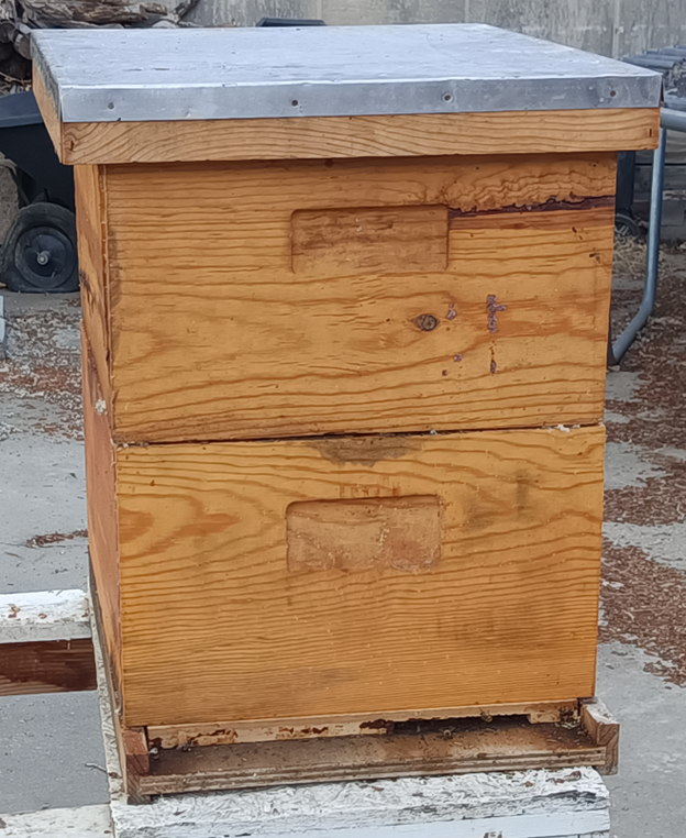 Complete hive 2 deep with telescoping lid, this hive is from a split. It is active, (see pic) but just getting started- $225