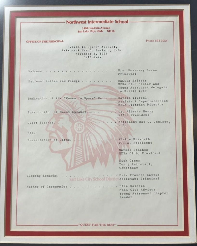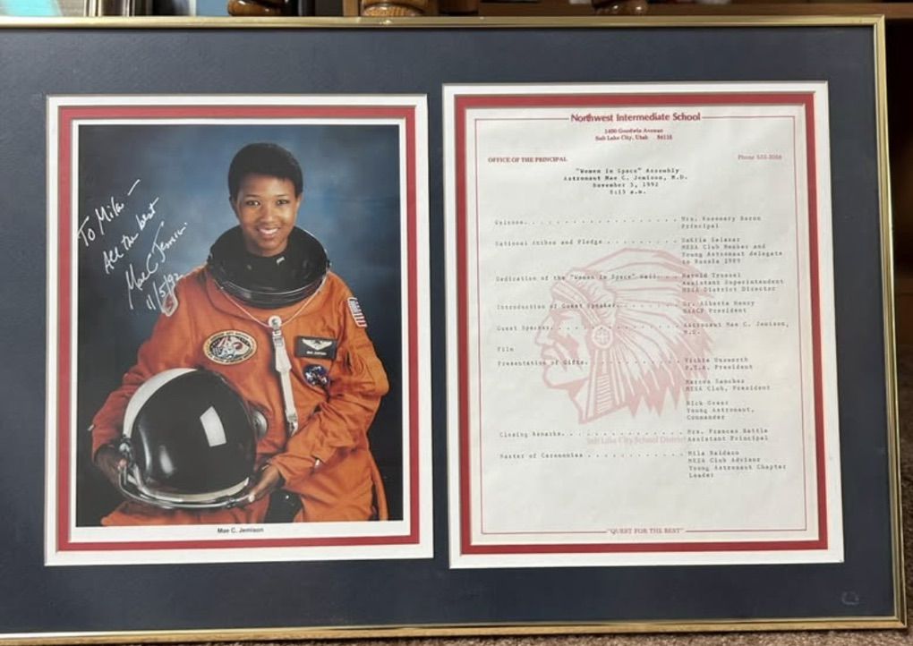 PayPalFramed display featuring a signed photo of astronaut Mae C. Jemison along with an original program from a 1992 “Women in Space” assembly in Salt Lake City.