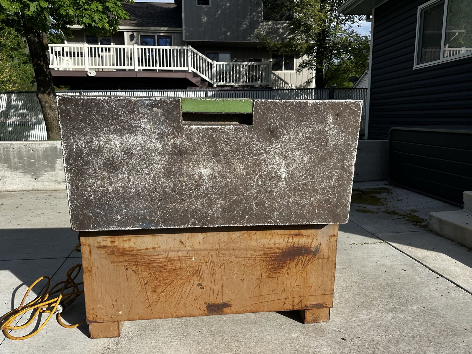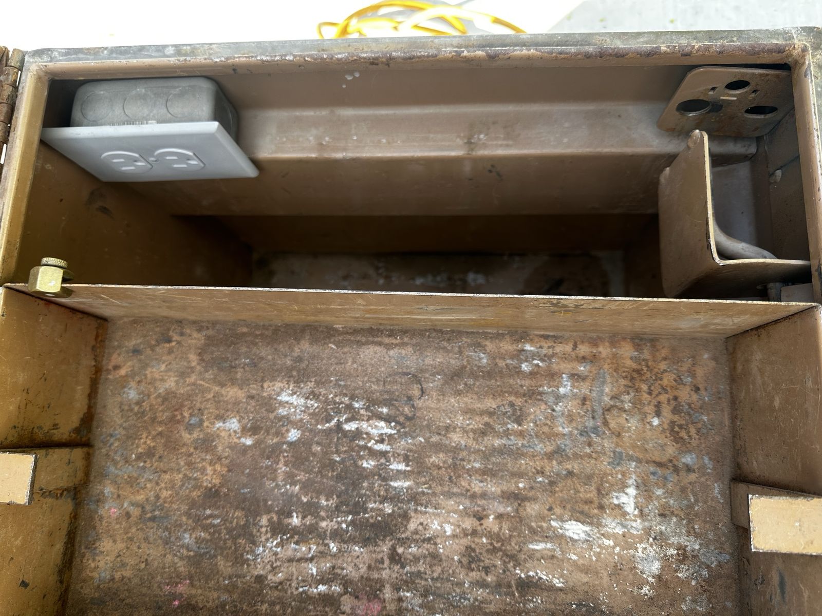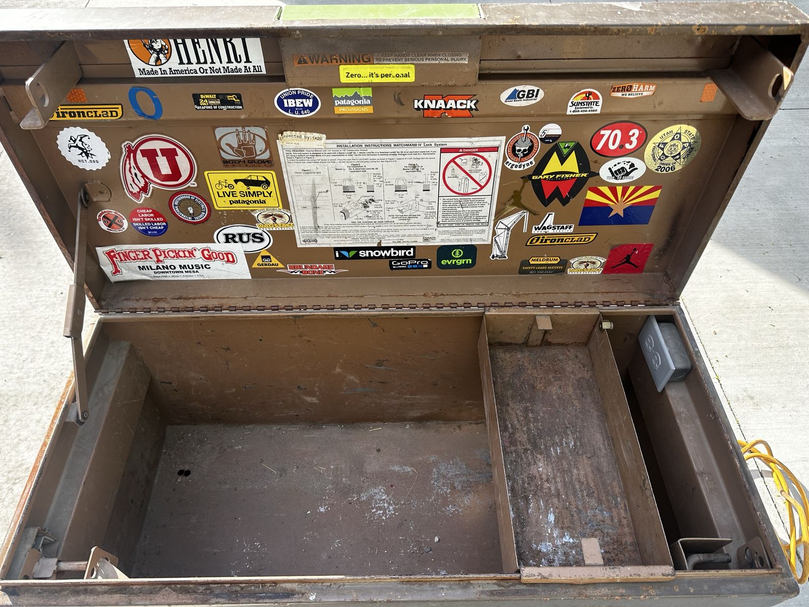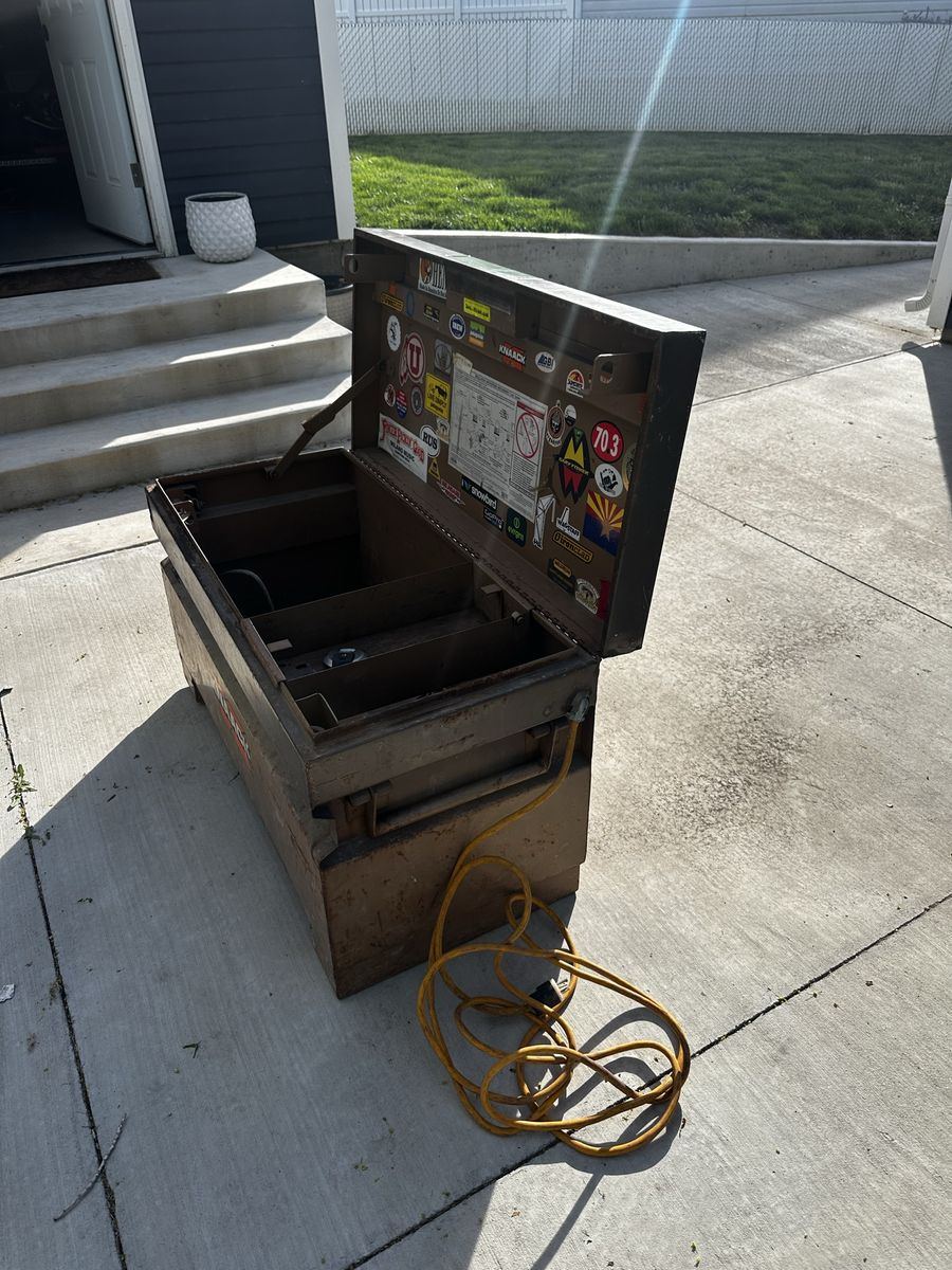 ZelleTool chest with extension cord and outlet on the inside. Comes with keys for the chest and an additional lock.