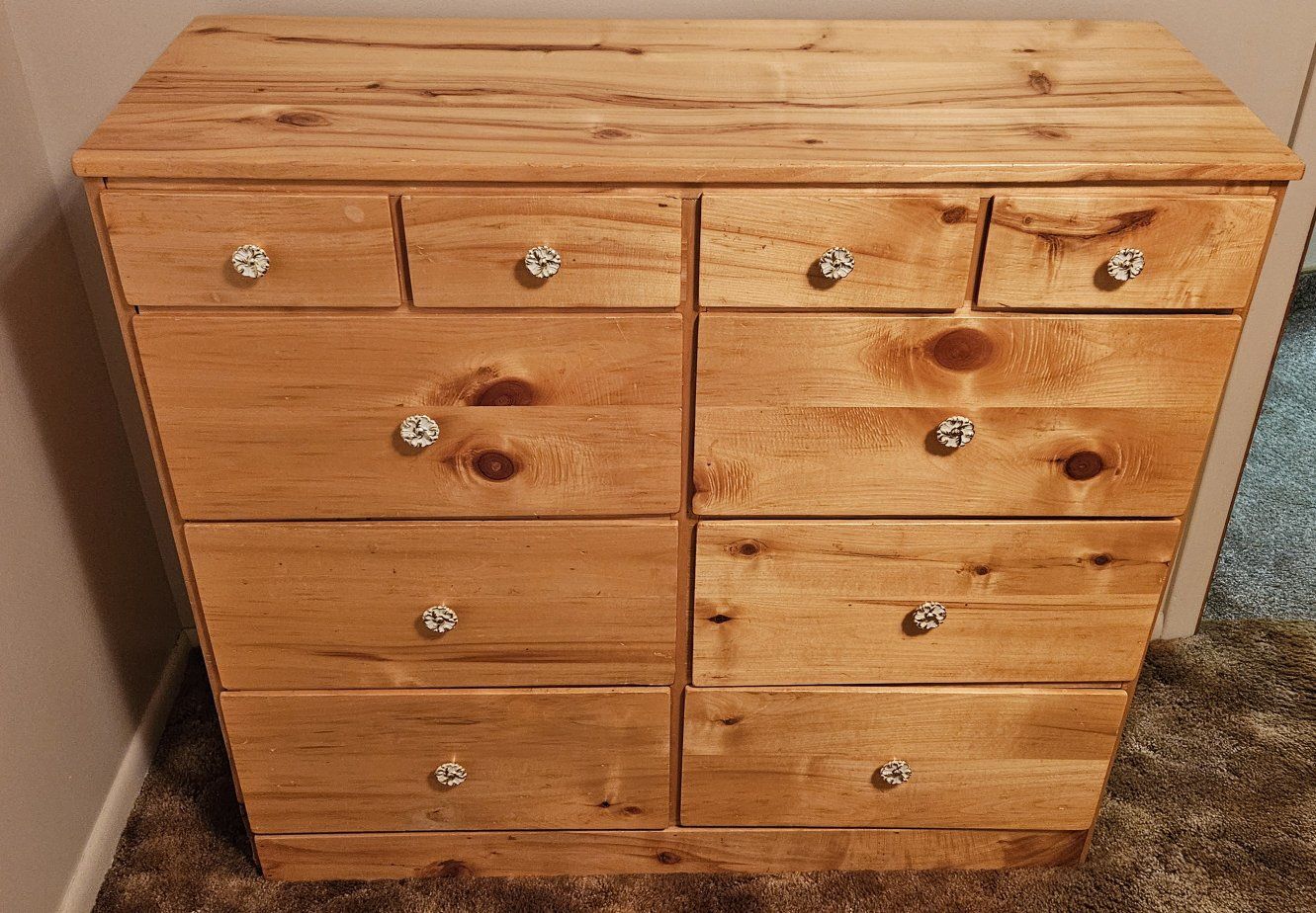 Solid wood dresser with rustic pine finish. This is a sturdy, well-built piece.