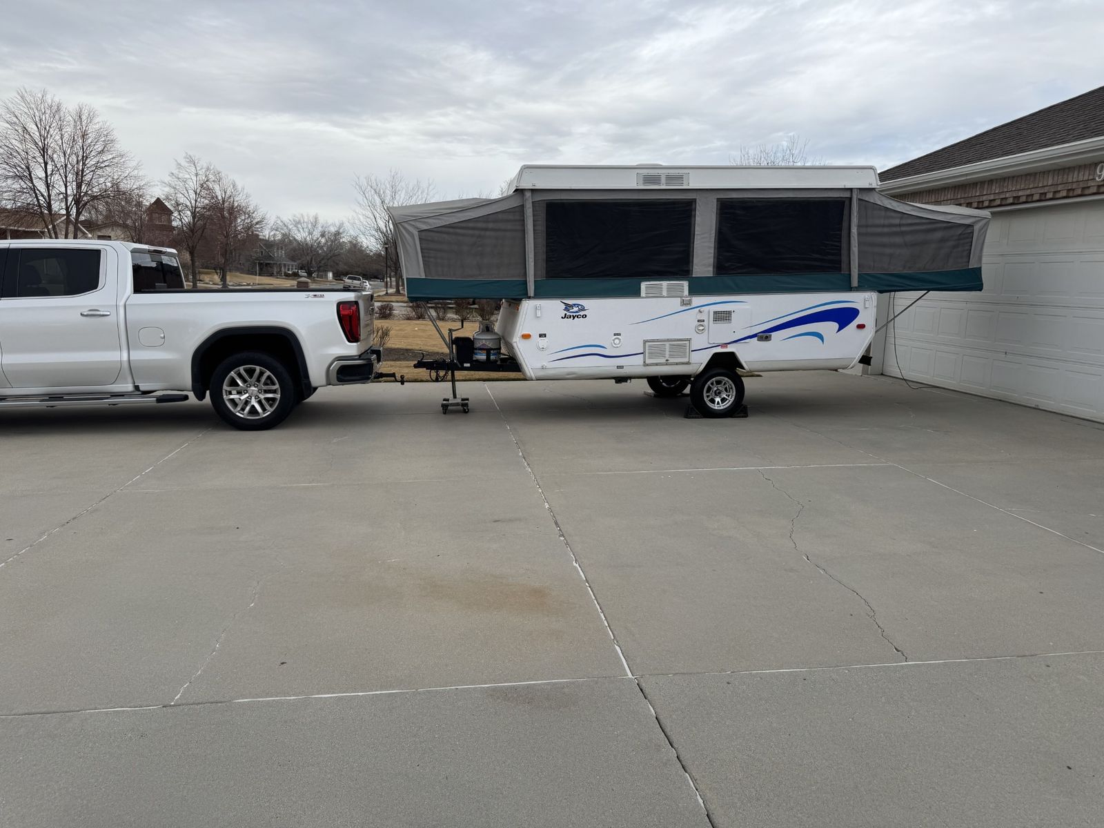 VenmoJayco Pop Up LOADED!! Large indoor Shower, Built in Toilet NOT a Porta Potti, Hot Water Heater, Gas/Electric Refrigerator, Forced Air Furnace, Upgraded New 3500lb Axel, Upgraded New 13" Tires, New Upgraded Aluminum Polished Wheels, Upgraded New Elect. Brakes, Upgraded New 2" Coupler, Crappy Surge Brakes GONE!! Upgraded New Tires, Upgraded New Spare Tire, New Battery, Upgraded New Dual LP Tanks, Upgraded New 14" Roof Vent. This trailer is just under 24' long when set up and folded out. The Upgraded 3500lb Axel is a straight axel so you now have TONS of ground clearance.