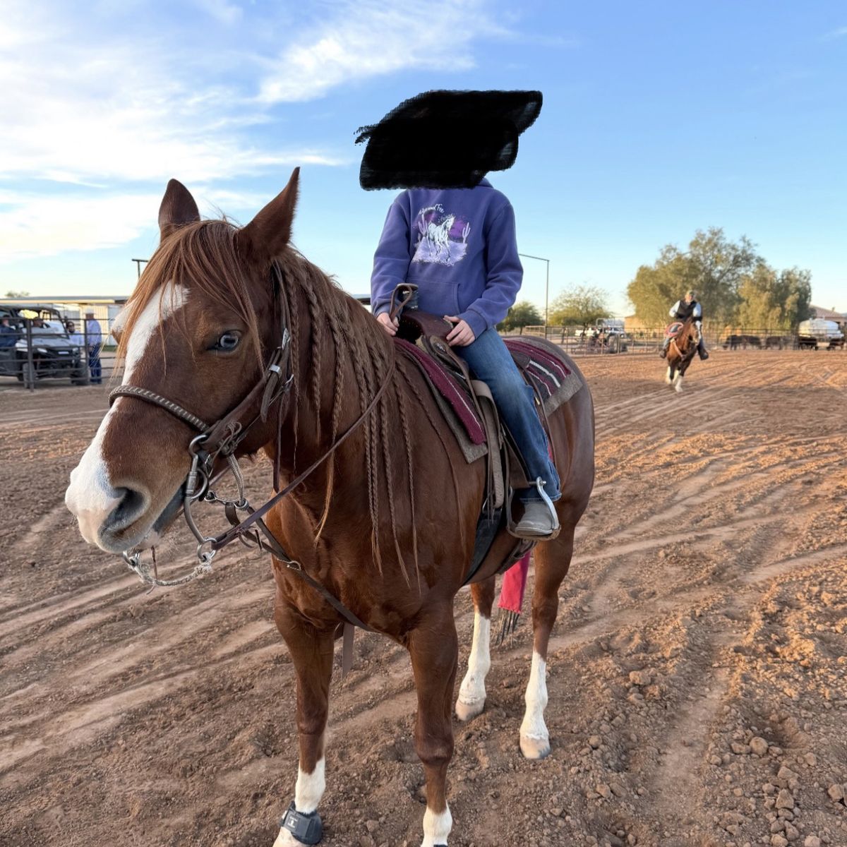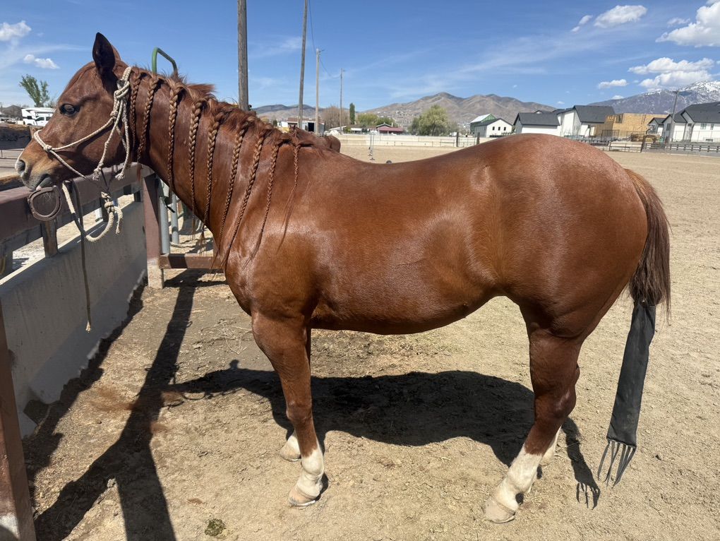 Tootsie Roll is a 2018 sorrel mare. Finished heel horse looks the part flashy, huge mane and tail, easy to ride, ready to win on! Would be a good family horse. Have more videos.