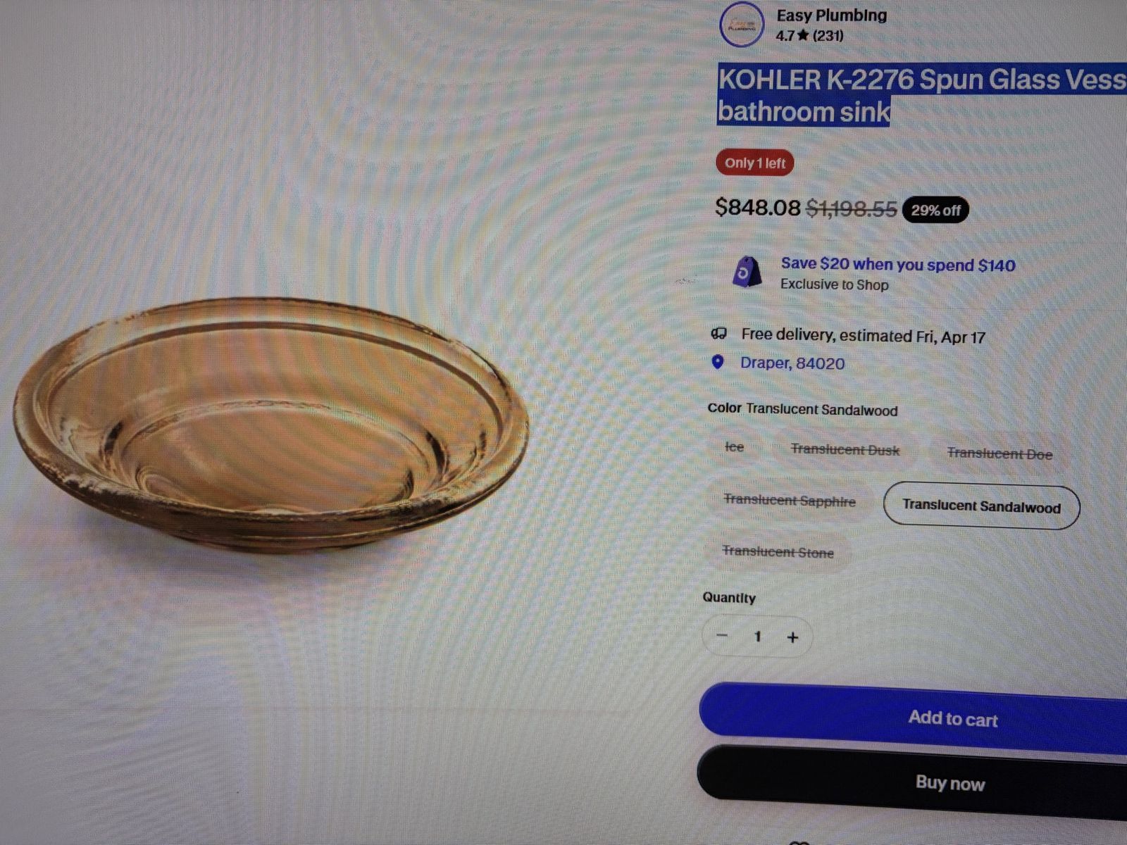 ZelleClear glass, blown glass bathroom sink. Pulled from a remodel. Retails at $1,198.55 currently on sale for $848.08 online. Take for $50. Kohler K-2276 spun glass vessel bathroom sink. Text is best.
