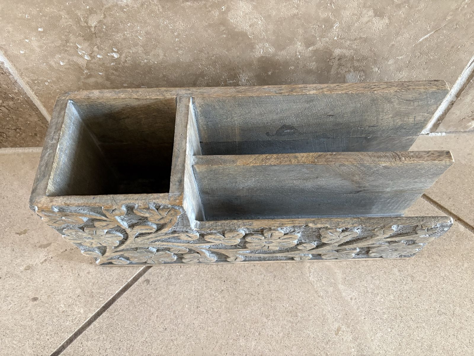 I have a beautiful carved wood mail and desk organizer. The carved pattern is flowers. The wood color is kind of gray. It is 12 inches long, 5 1/4 inches tall and 4 inches front to back. See my other ads for jewelry, artwork, home decor and more.