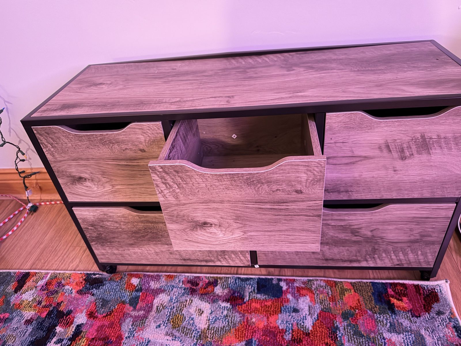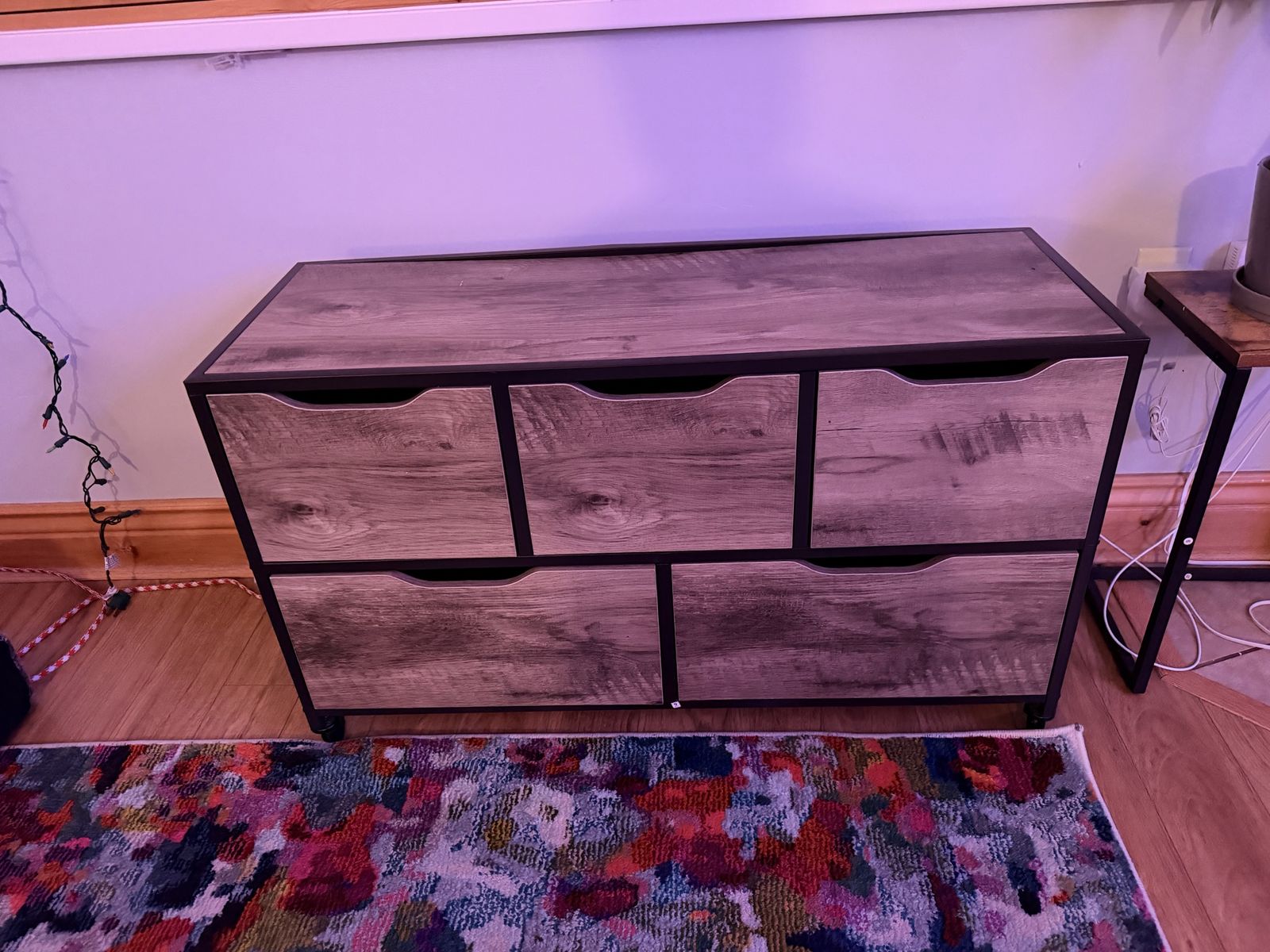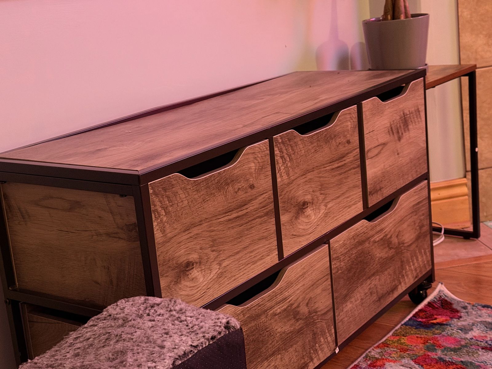 2 - Versatile storage cabinets. 37in wide X 22in high 13.5 in depth. Has 5 drawers with a cool wood-look front. On wheels and very useful for organizing stuff.