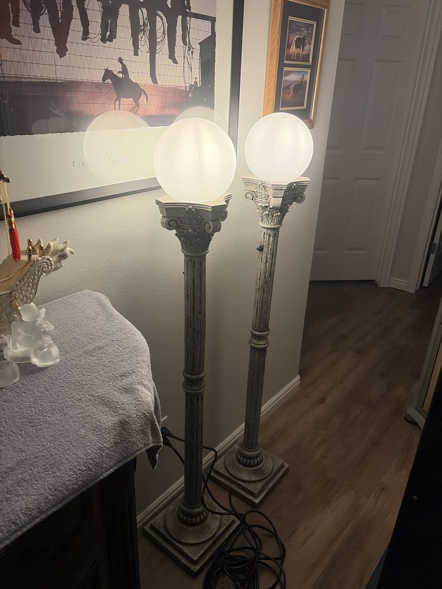 OBO. See all pictures.These is from my own personal stock. I’ve had them so long!! However I bought them & they just sat there & I’m decluttering. The Globes are actually plastic. And I remember they were enameled cast iron. Believe me when I say they’re heavy & in perfect condition!! Please see my other listings :) Thanks for looking :) NO CODES