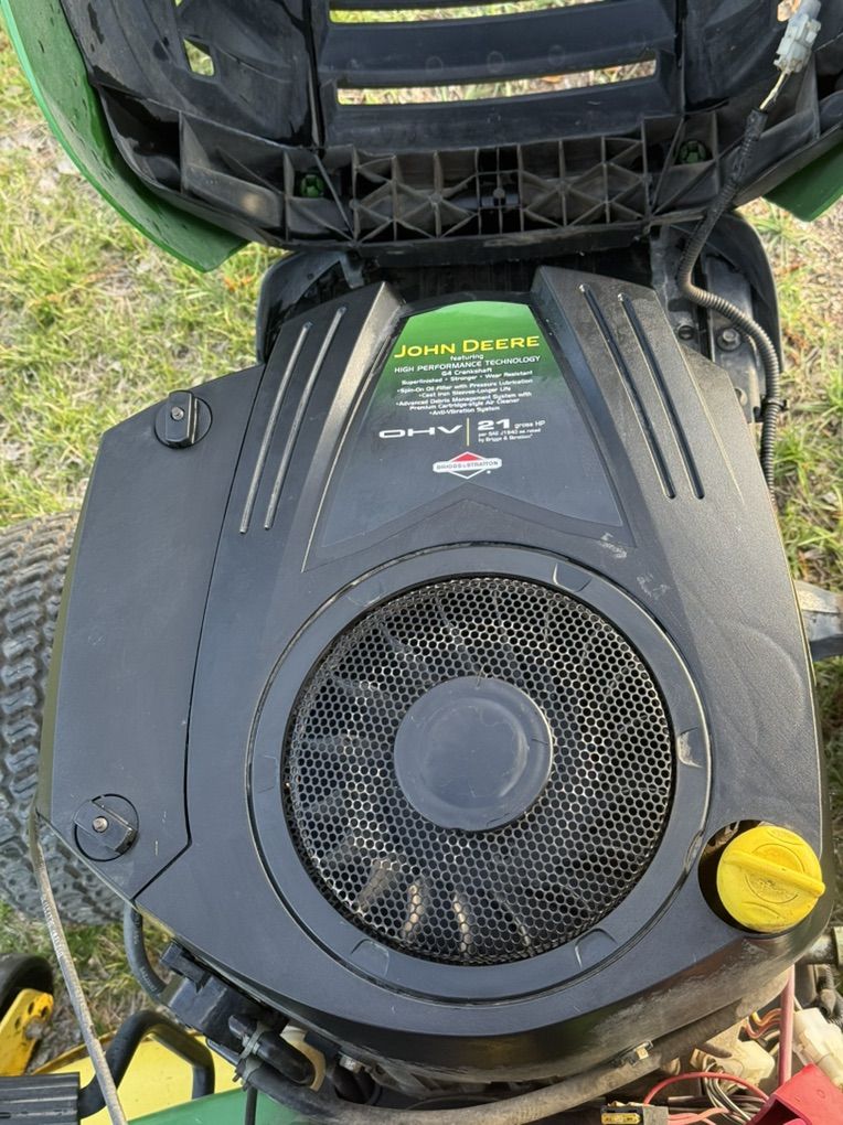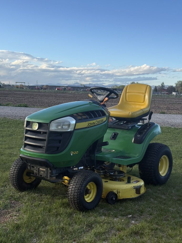 ZelleD-120 John Deere riding lawn mower. -fully serviced -Starts right up and leave a great cut. -hydro drive transmission -22hp motor Lots of life left in the machine. Let me know if you have any questions.