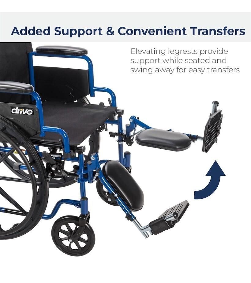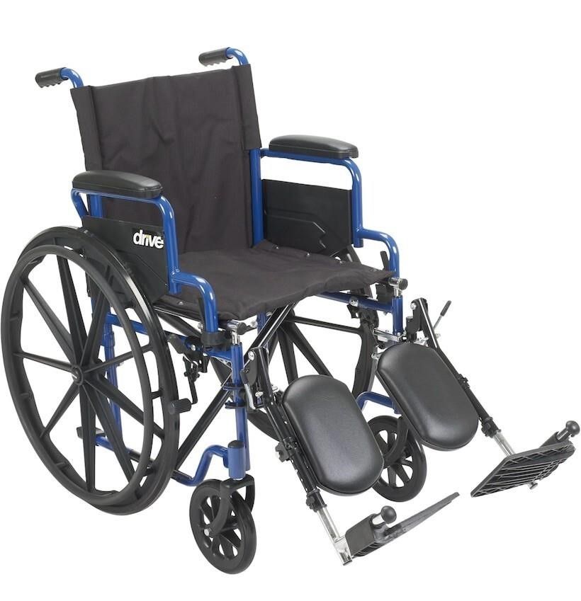 VenmoA Mobile Masterpiece of Class... durability and comfort the blue streak wheelchair with flip back desk arms from Drive Medical represents a new class of leading-edge mobility enhanced wheelchairs that have been engineered and structured, to not only meet, but exceed the growing demands and expectations of users who cherish independence, mobility and comfort. It arrives at your door loaded with features designed to enable and enhance your mobility and comfort. Arm rests are fully padded. The frame, Black cross brace and the nylon upholstery is durable, attractive and easy to clean. The tires which are made of solid rubber, give you an enormous amount of durability. If that wasn't enough, this leading edge mobility aid also requires little to no maintenance. Users also appreciate that the blue streak wheelchair comes with easy to operate push to Lock brakes, along with convenient elevating leg rests that allow you the user, too safely, effortlessly and with convenience, slide in and out of your chair. You'll also appreciate the padded desk arms which furnish you with unbeatable comfort, allowing you to slide up as close as you desire, and need to be to tables, and or desks.