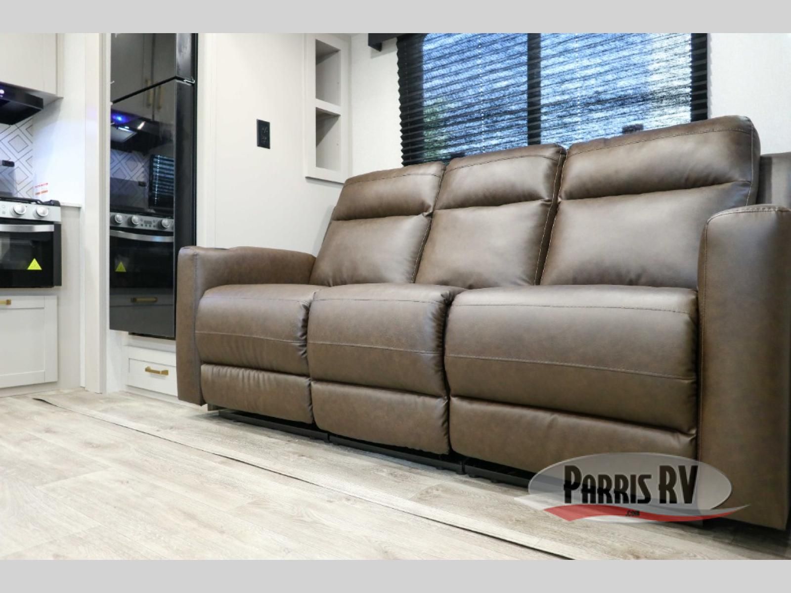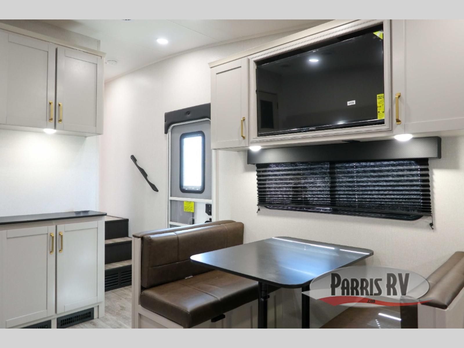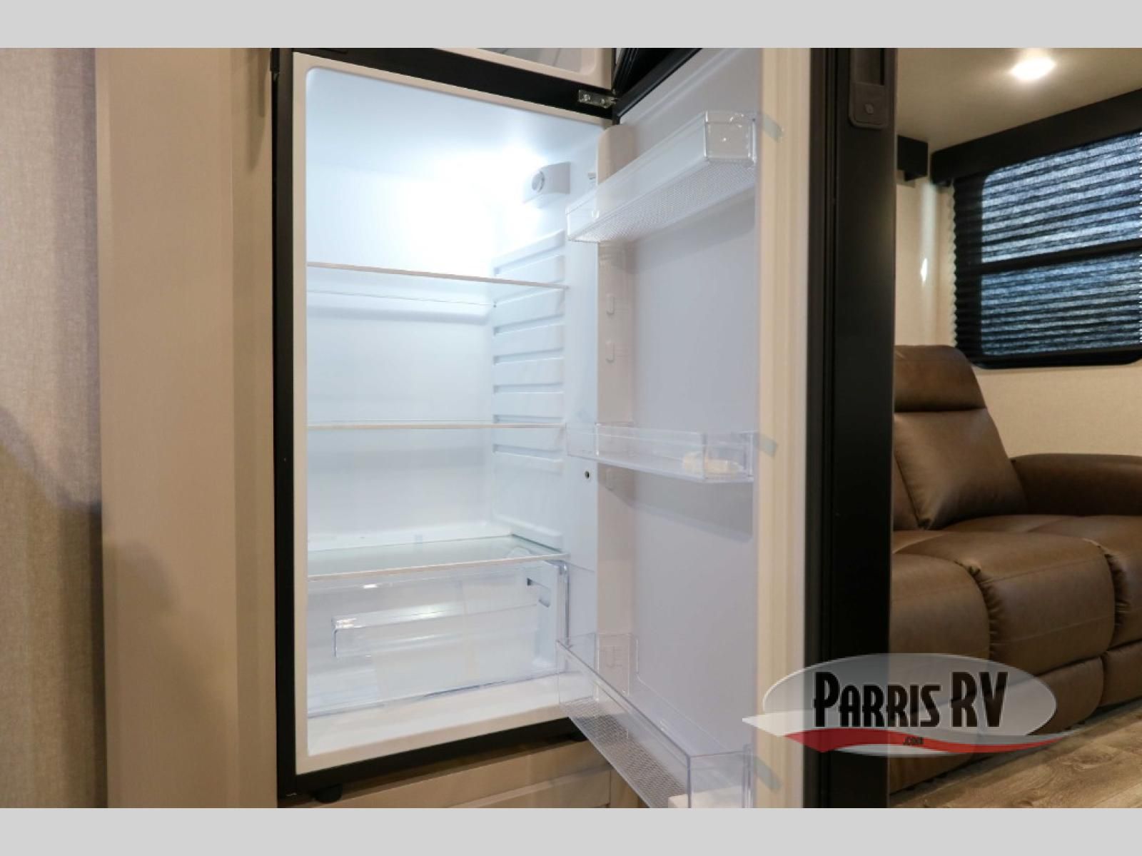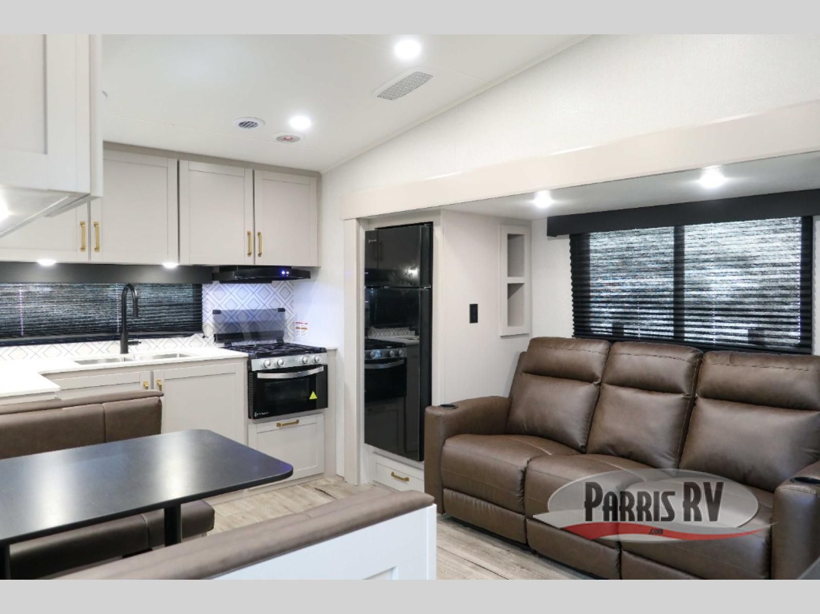 The fifth wheel you were waiting for! The spacious rear kitchen is equipped with a three-burner cooktop, microwave, booth dinette, 12V refrigerator, and sink, providing ample space for meal preparation. Overhead cabinets and a pantry provide ample storage for cookware, dishes, and other essential kitchen items. The living area features a trifold sofa, perfect for relaxation and entertainment. The full bathroom's thoughtful design ensures that everyone has their own space, and the front bedroom is a retreat from the world, featuring a plush queen bed, a spacious wardrobe, and a closet.
