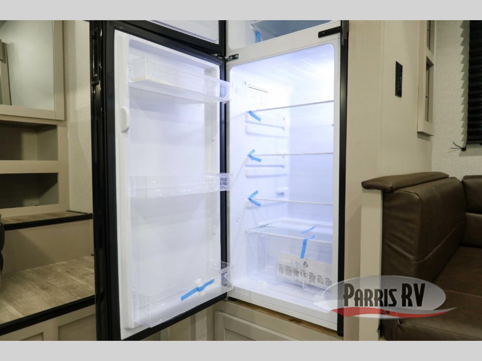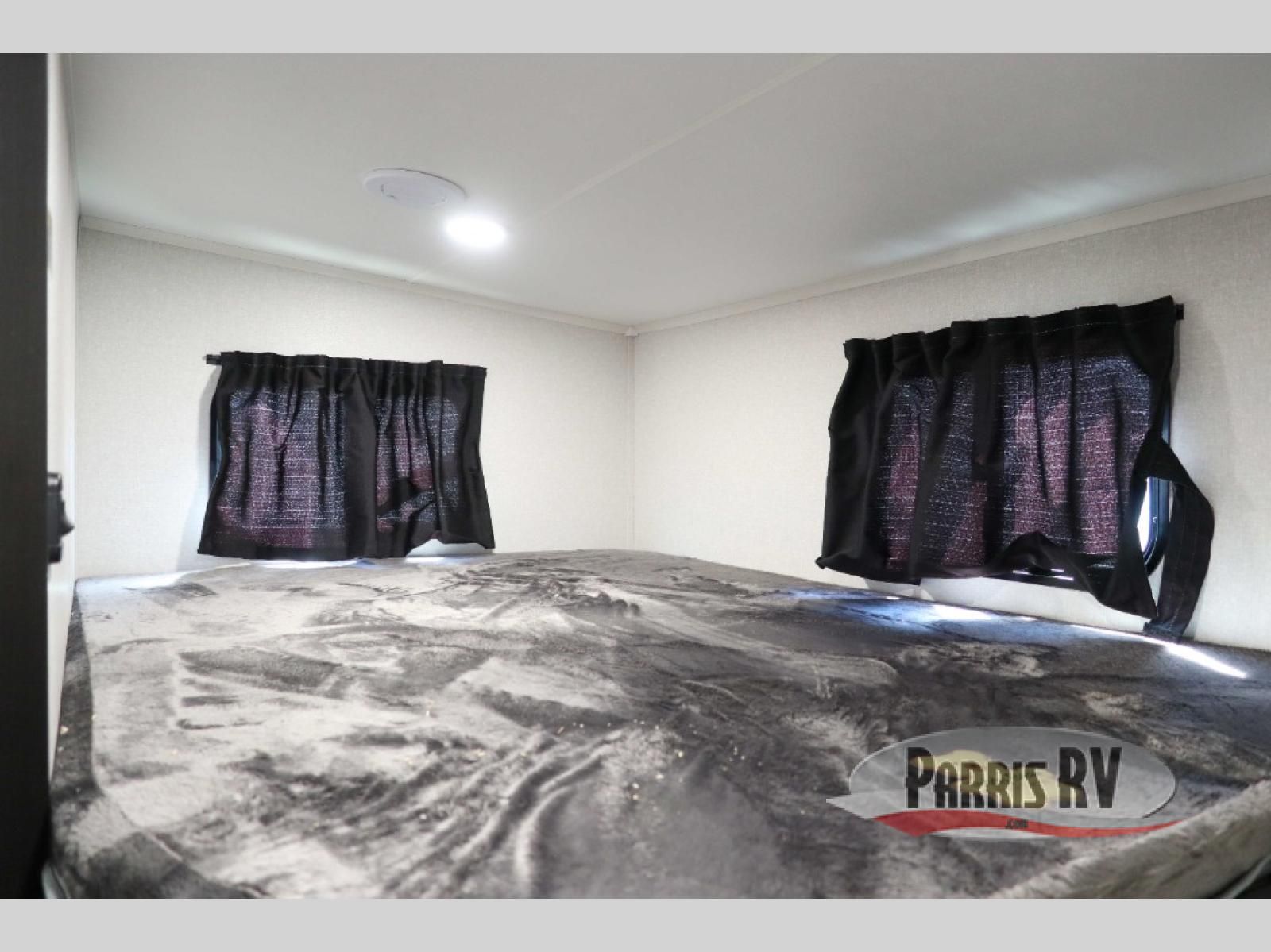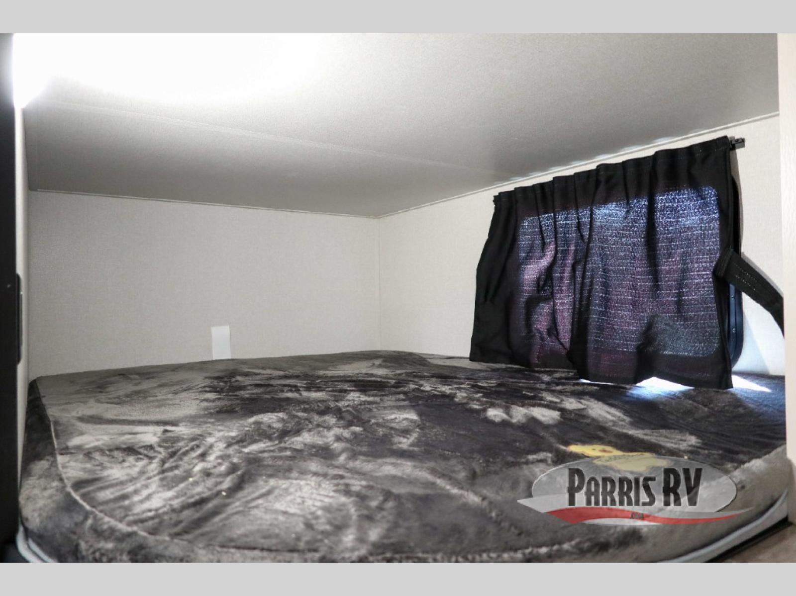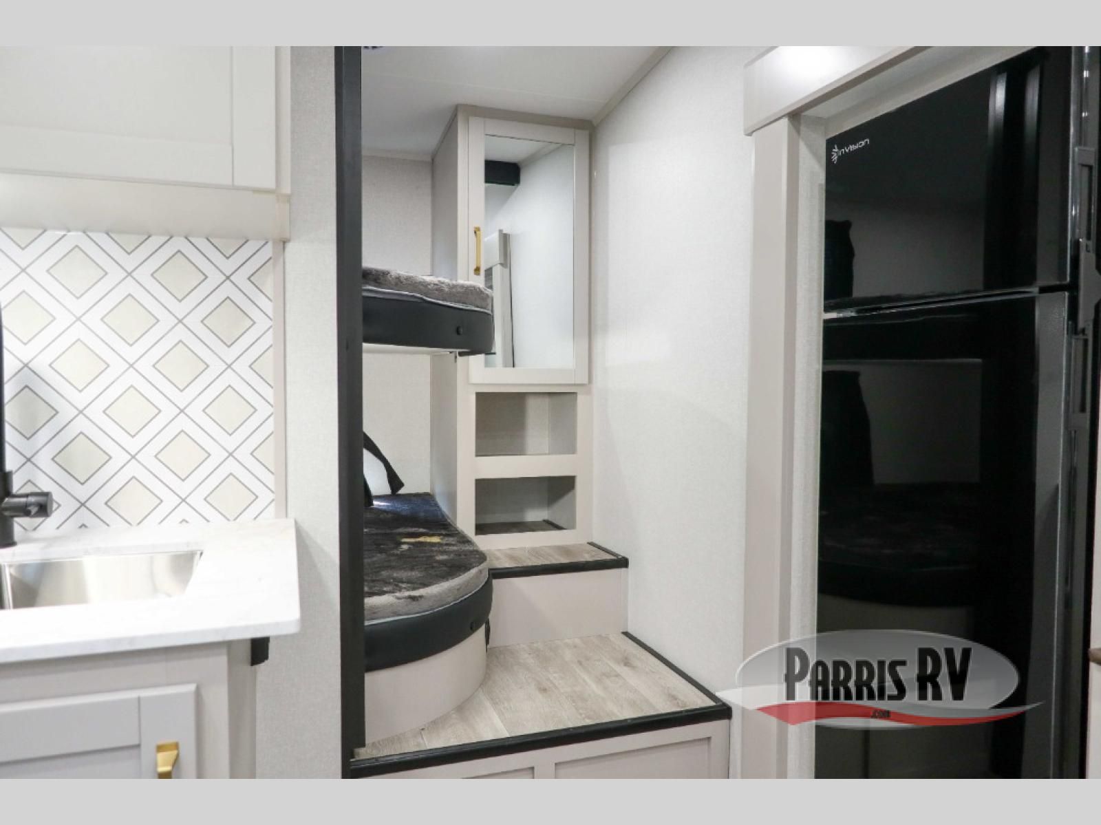 This fifth wheel's spacious interior boasts double-sized bunk beds designed for kids or guests, providing a comfortable sleeping space. A U-shaped dinette that offers ample seating and dining space for meals or even more sleeping space, as well as the 60" tri-fold sofa, which provides additional seating and can be converted into a comfortable sleeping area. In the kitchen area, you will find many amenities to cook delicious meals, such as a microwave, refrigerator, and overhead cabinets that will allow you to keep everything organized. The front bed is spacious, featuring a queen bed ideal for sleeping tight, and the full bath will complete the at-home experience since you will be able to take a refreshing shower on hot days!