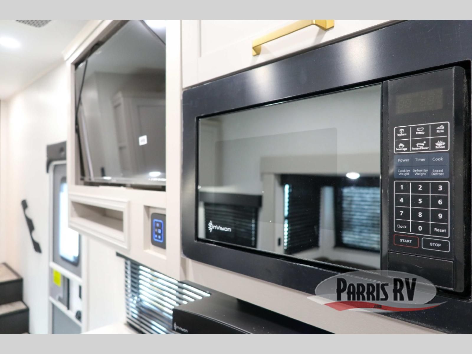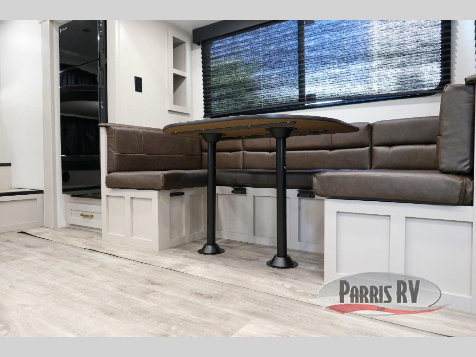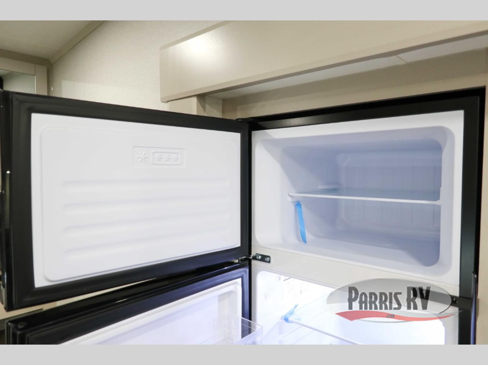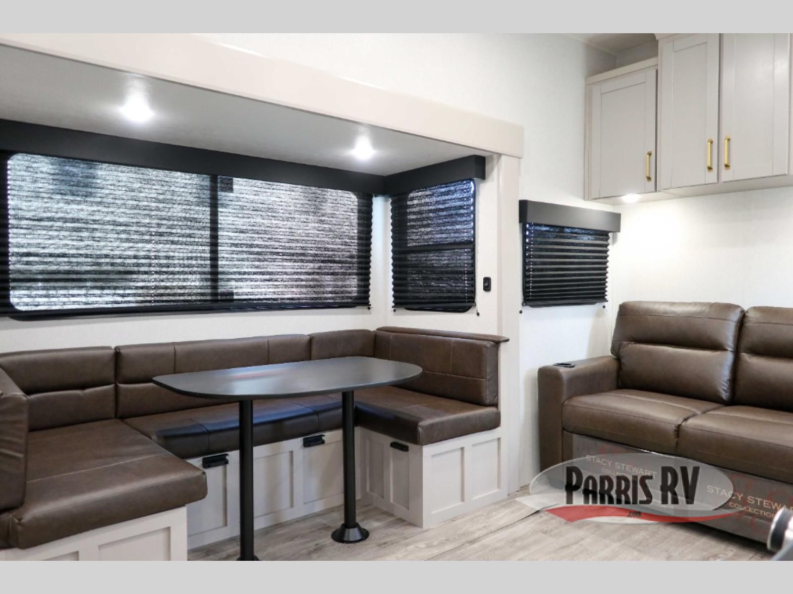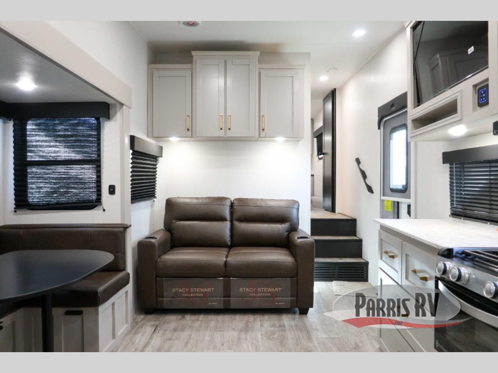 This fifth wheel's spacious interior boasts double-sized bunk beds designed for kids or guests, providing a comfortable sleeping space. A U-shaped dinette that offers ample seating and dining space for meals or even more sleeping space, as well as the 60" tri-fold sofa, which provides additional seating and can be converted into a comfortable sleeping area. In the kitchen area, you will find many amenities to cook delicious meals, such as a microwave, refrigerator, and overhead cabinets that will allow you to keep everything organized. The front bed is spacious, featuring a queen bed ideal for sleeping tight, and the full bath will complete the at-home experience since you will be able to take a refreshing shower on hot days!