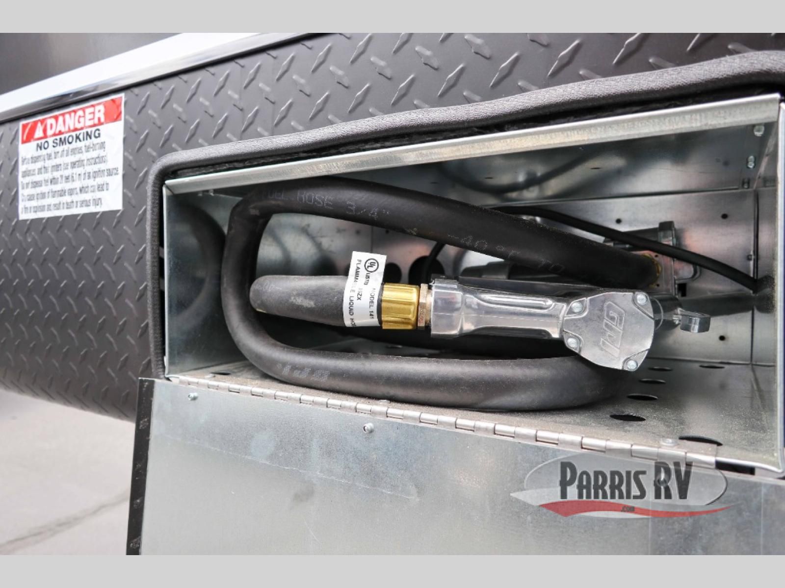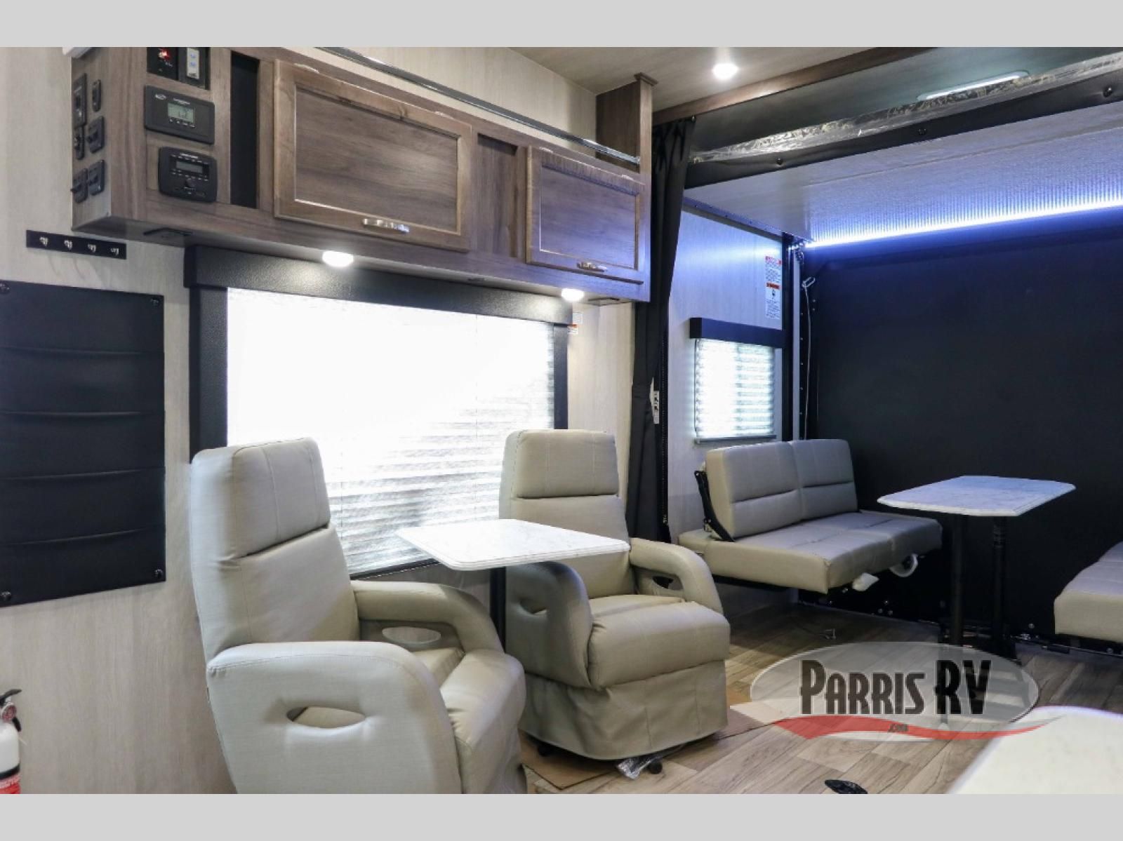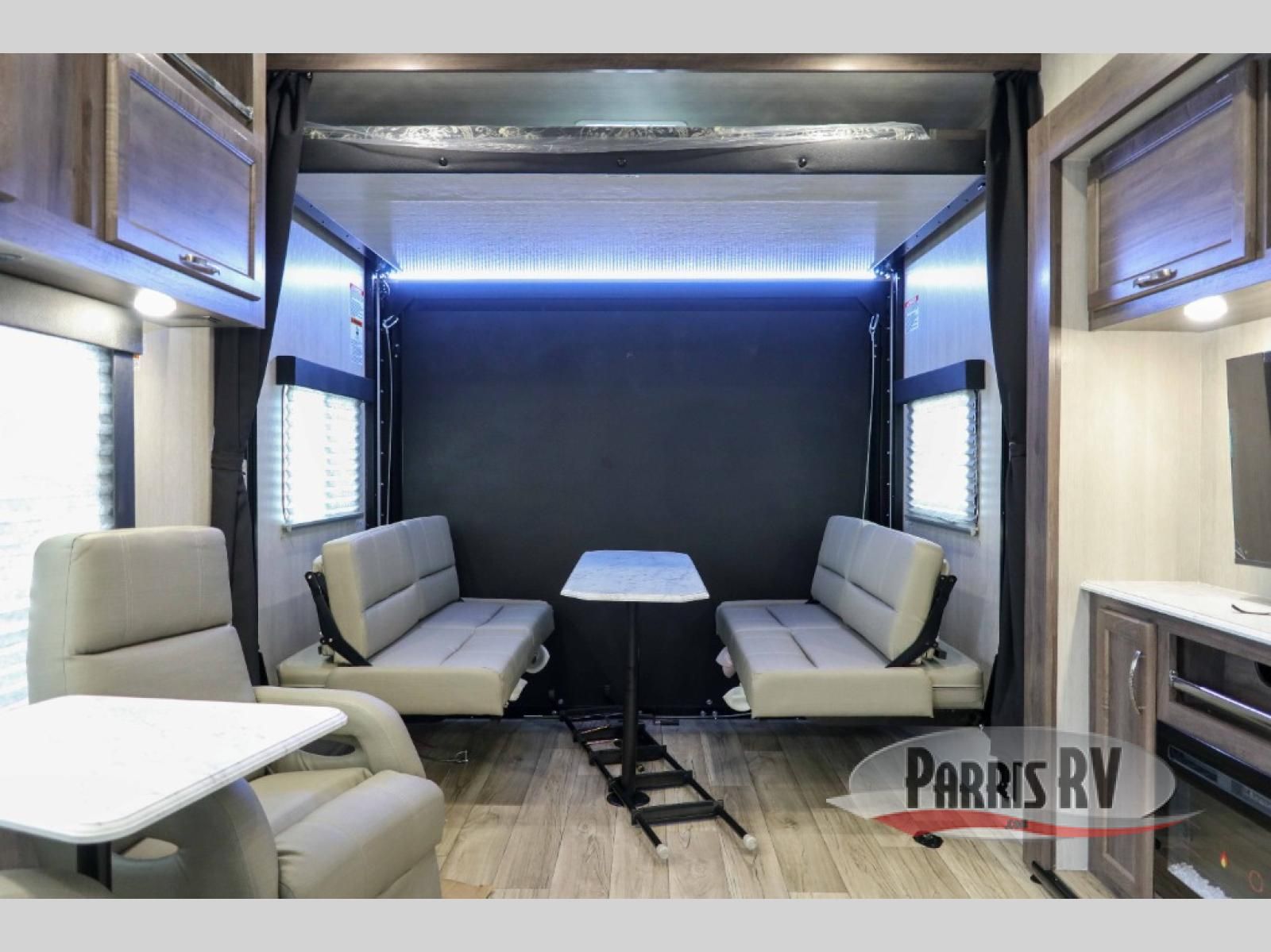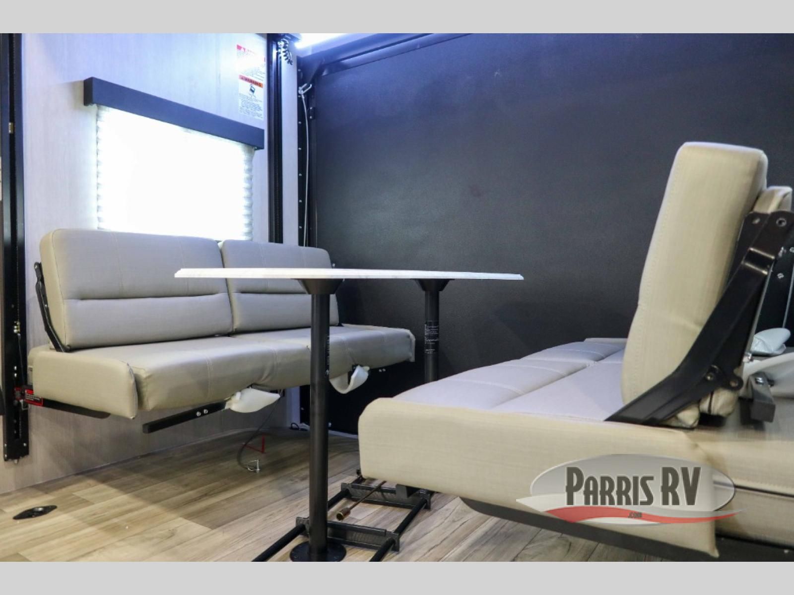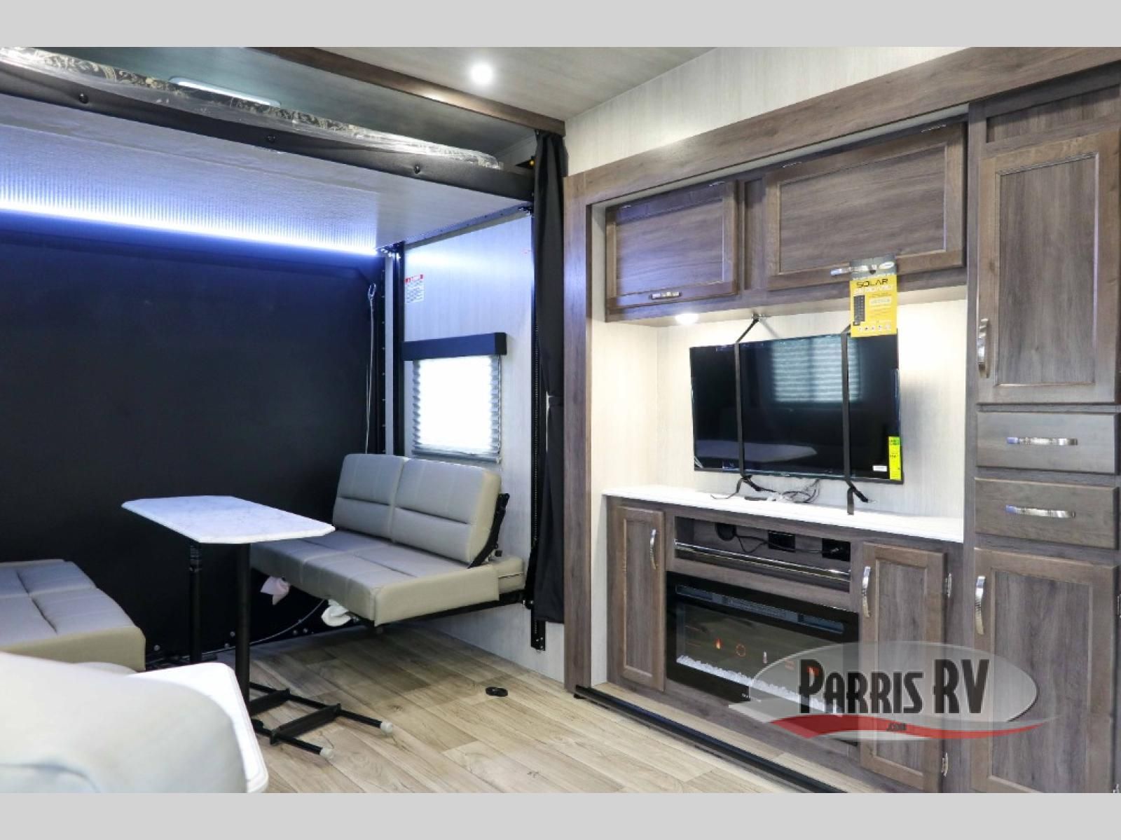 This toy hauler is ready for adventure when you are! There are two swivel/rocker chairs with a table and picture window where you can enjoy your coffee at each morning. The entertainment center slide out also includes a fireplace and pantry to keep dry goods. A 7' laminated ramp door will make it easy to unload your toys, and there is an opposing rear power dinette in the garage area that will provide more sleeping space for guests. The full kitchen and bath are sure to come in handy when you're camping all weekend, and you'll love having a private bedroom up front, complete with a queen bed, nightstand, and a dresser!