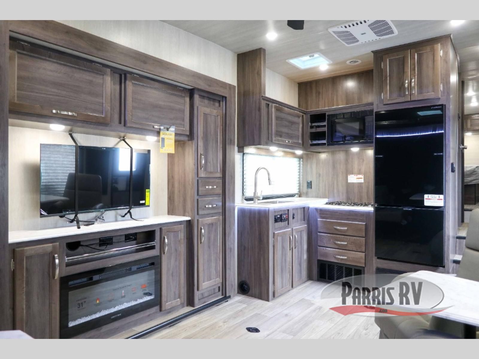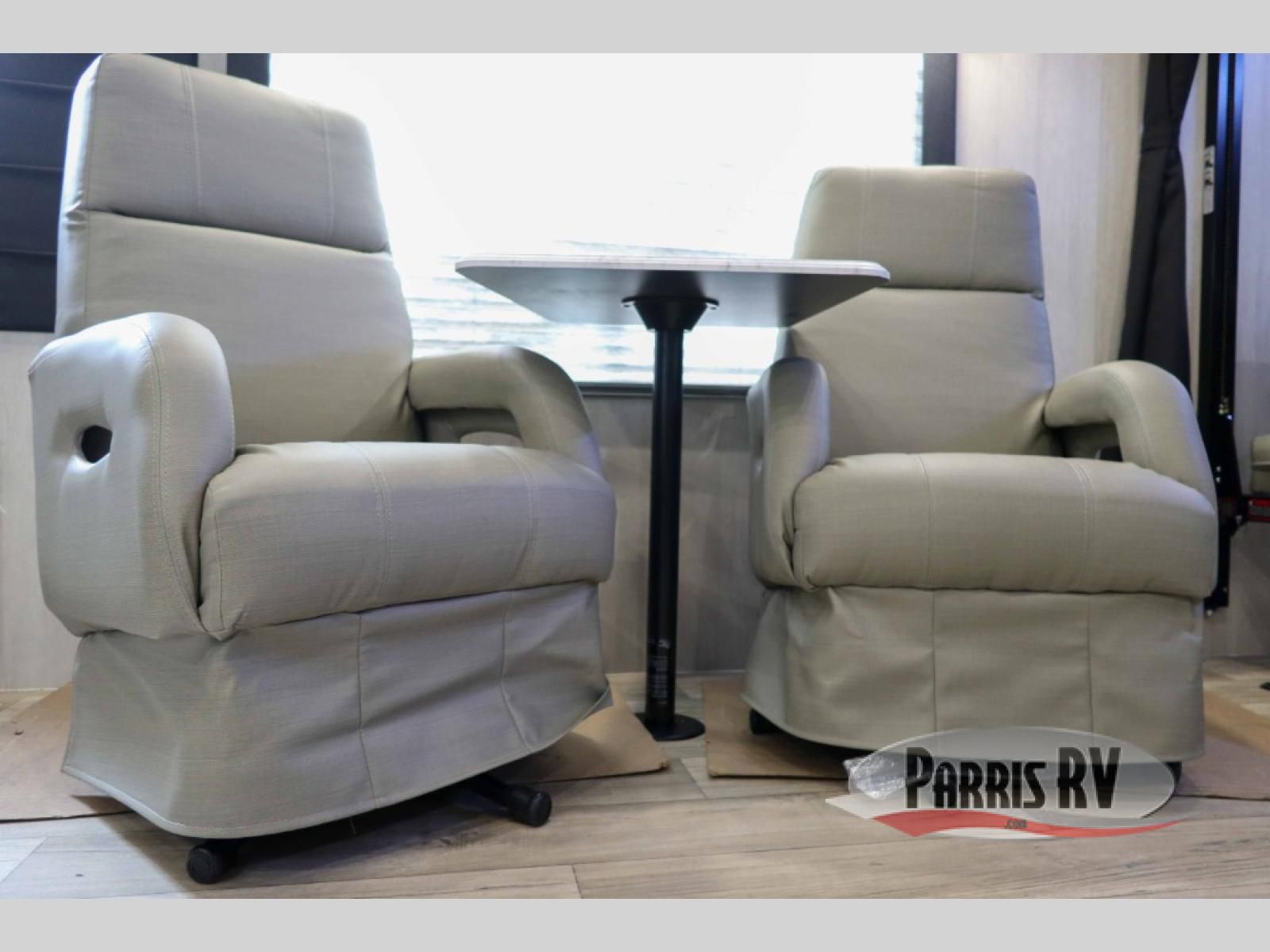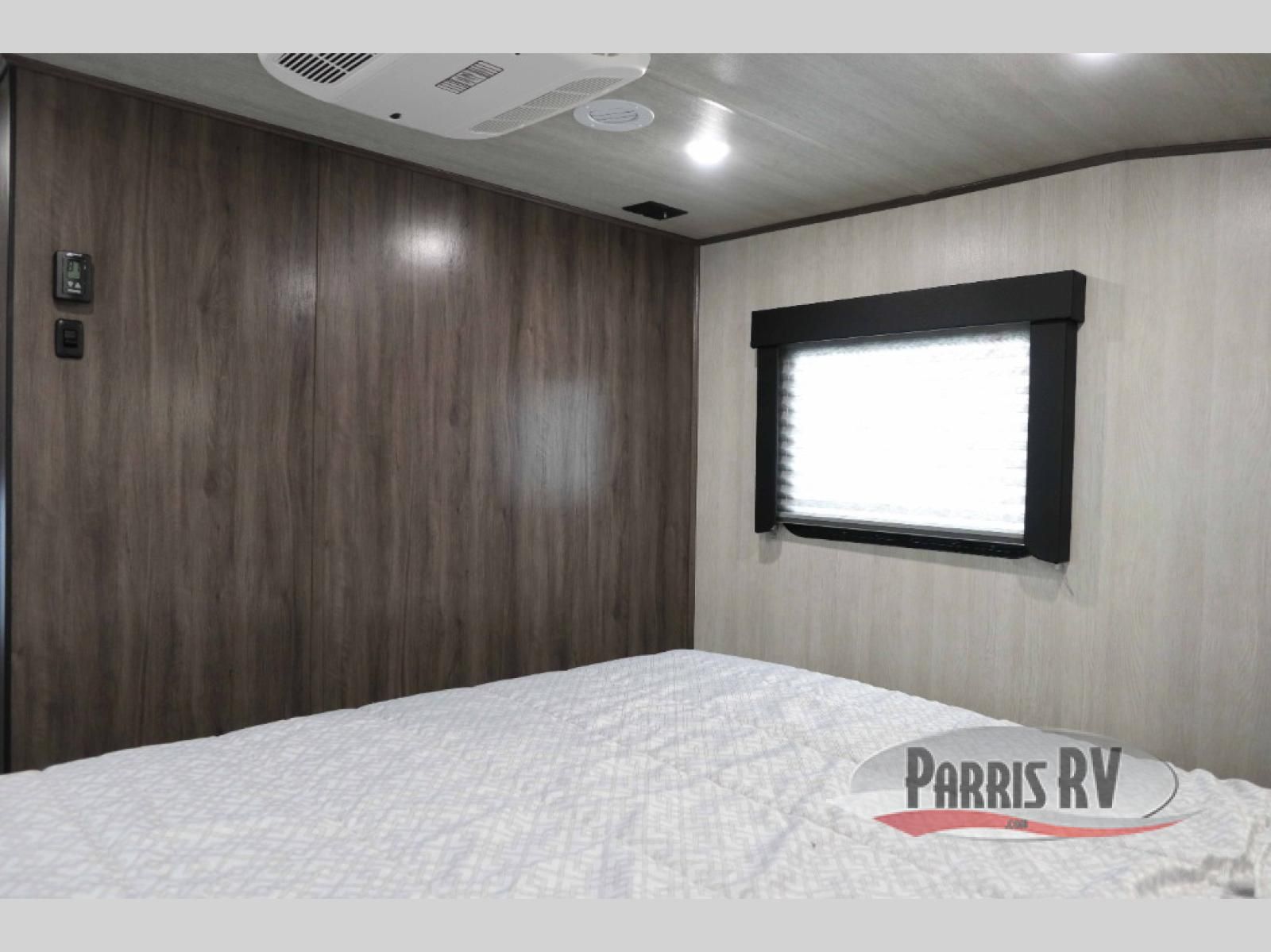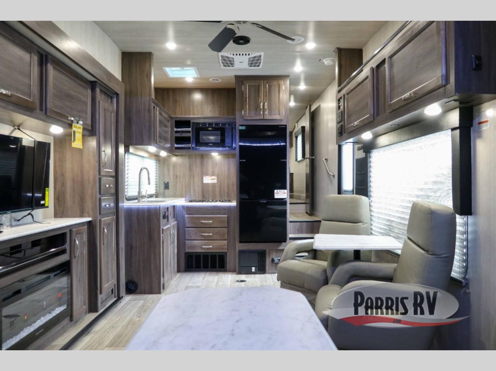 This toy hauler is ready for adventure when you are! There are two swivel/rocker chairs with a table and picture window where you can enjoy your coffee at each morning. The entertainment center slide out also includes a fireplace and pantry to keep dry goods. A 7' laminated ramp door will make it easy to unload your toys, and there is an opposing rear power dinette in the garage area that will provide more sleeping space for guests. The full kitchen and bath are sure to come in handy when you're camping all weekend, and you'll love having a private bedroom up front, complete with a queen bed, nightstand, and a dresser!