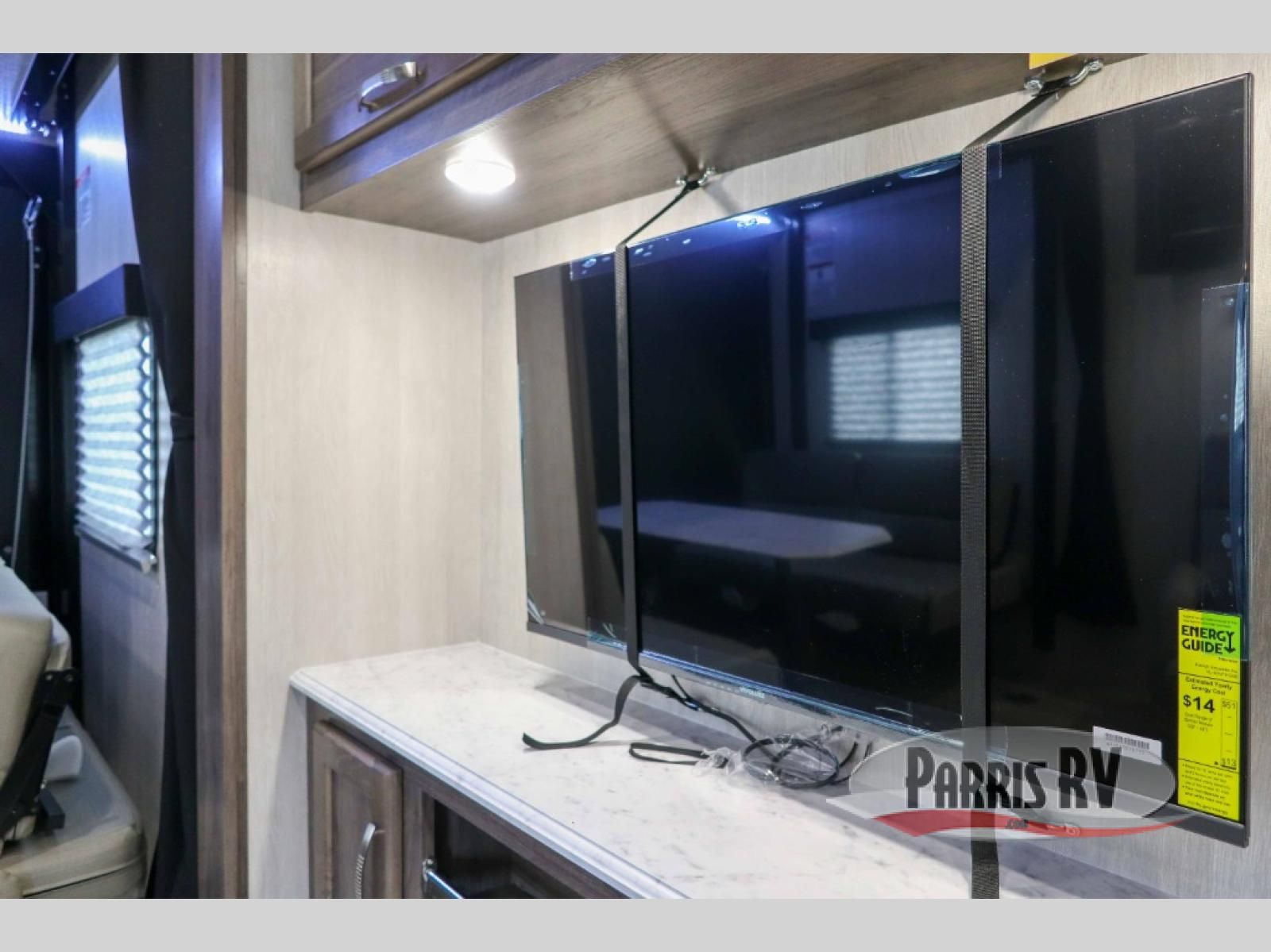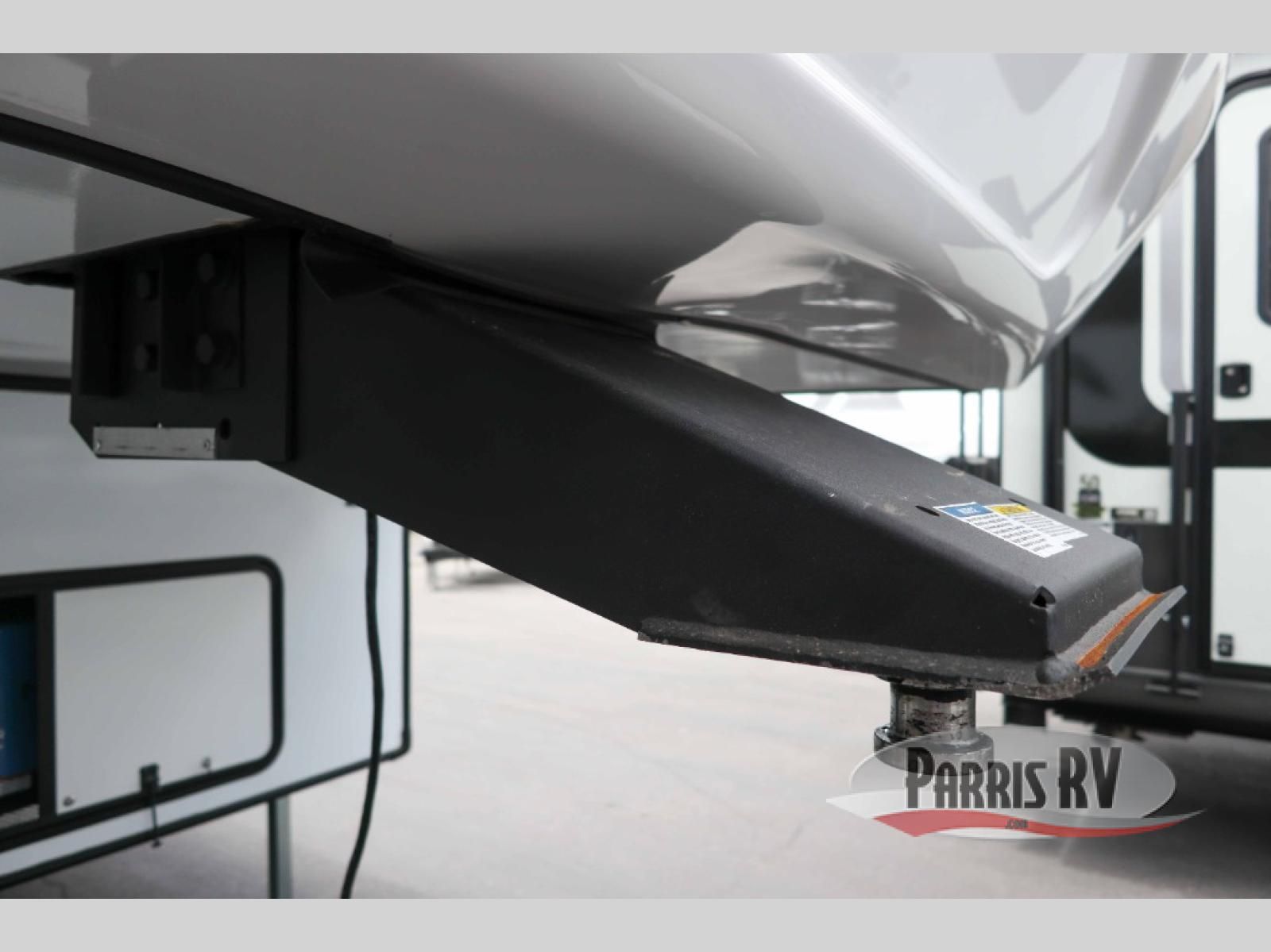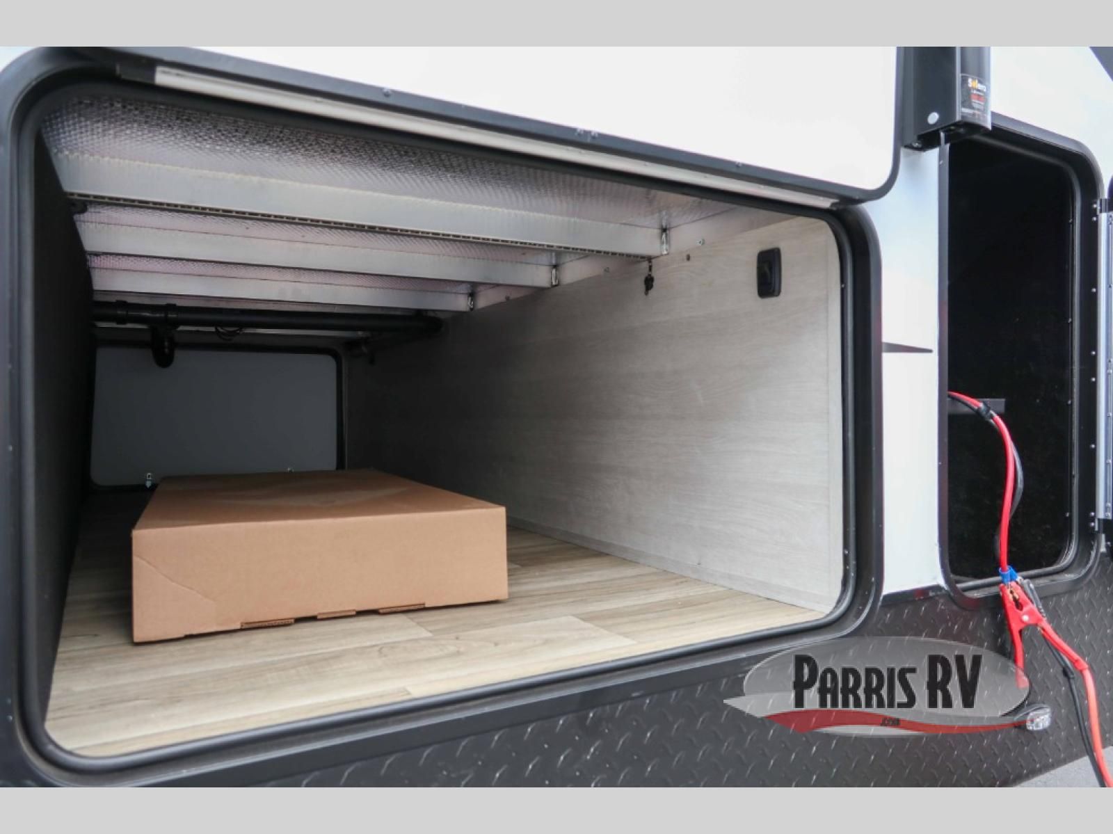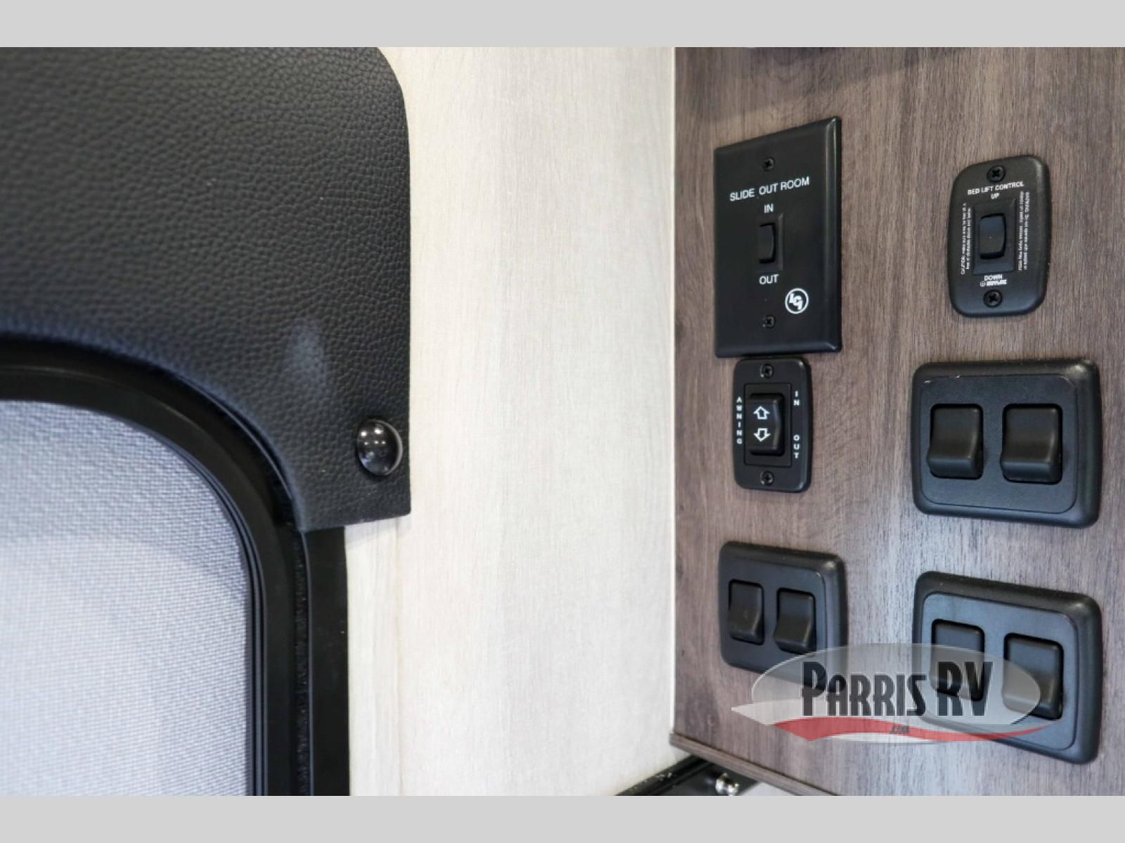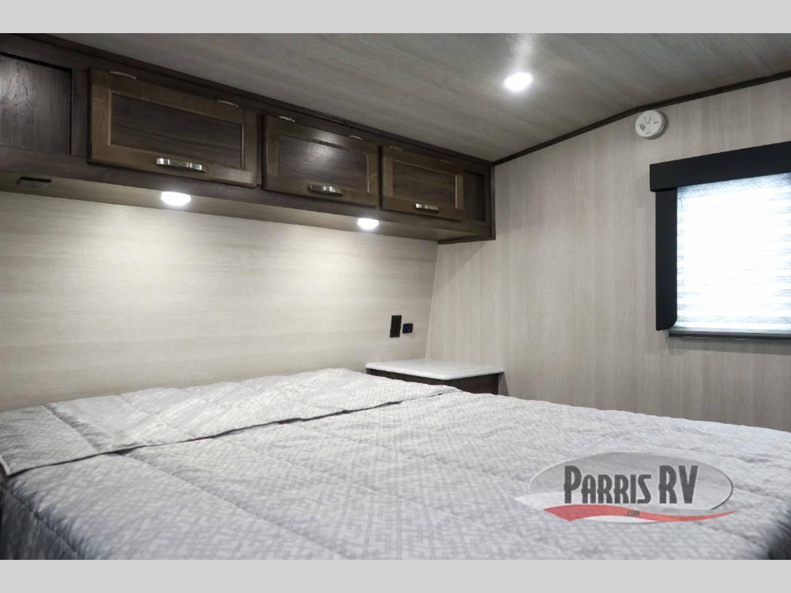 This toy hauler is ready for adventure when you are! There are two swivel/rocker chairs with a table and picture window where you can enjoy your coffee at each morning. The entertainment center slide out also includes a fireplace and pantry to keep dry goods. A 7' laminated ramp door will make it easy to unload your toys, and there is an opposing rear power dinette in the garage area that will provide more sleeping space for guests. The full kitchen and bath are sure to come in handy when you're camping all weekend, and you'll love having a private bedroom up front, complete with a queen bed, nightstand, and a dresser!
