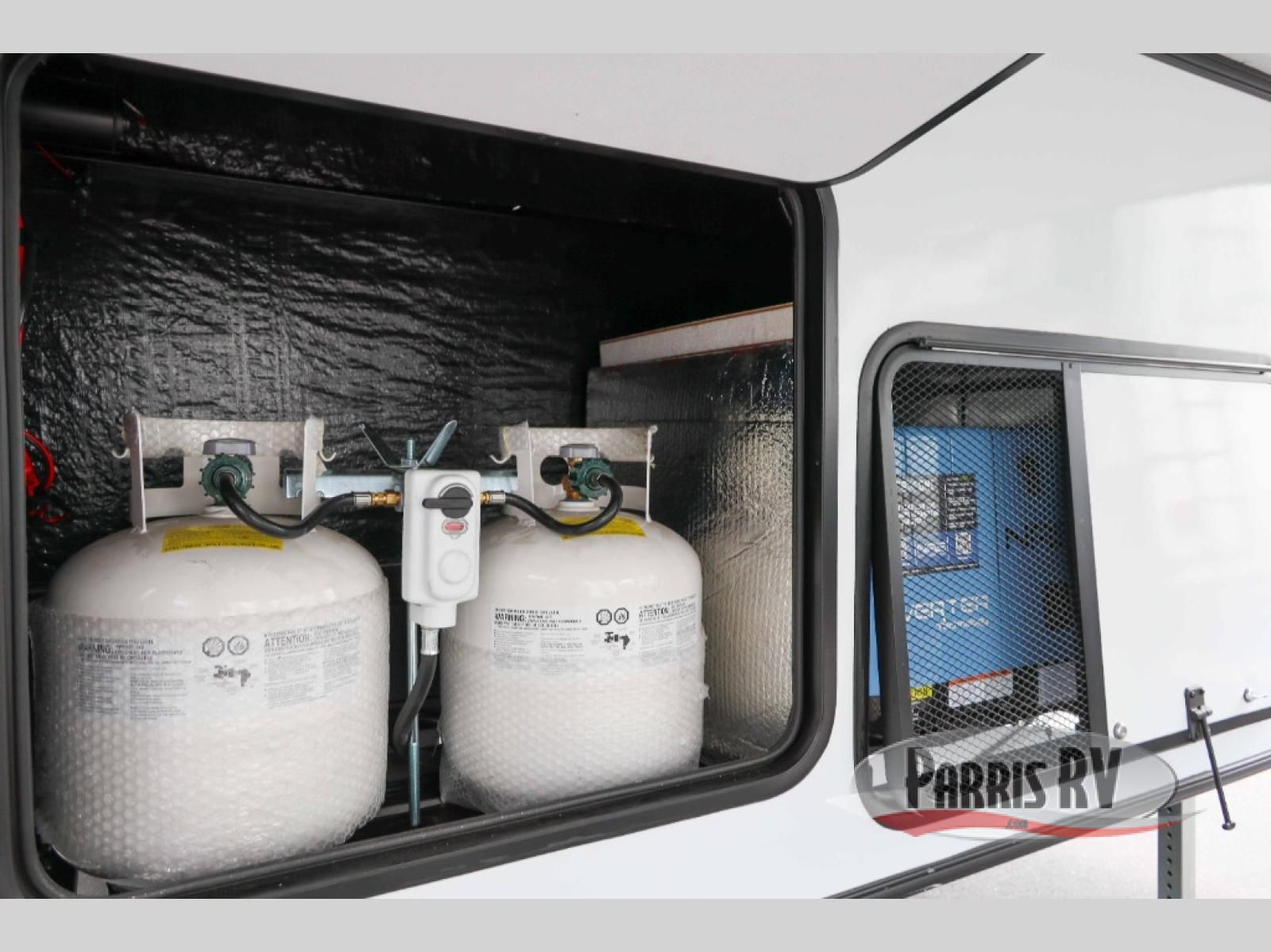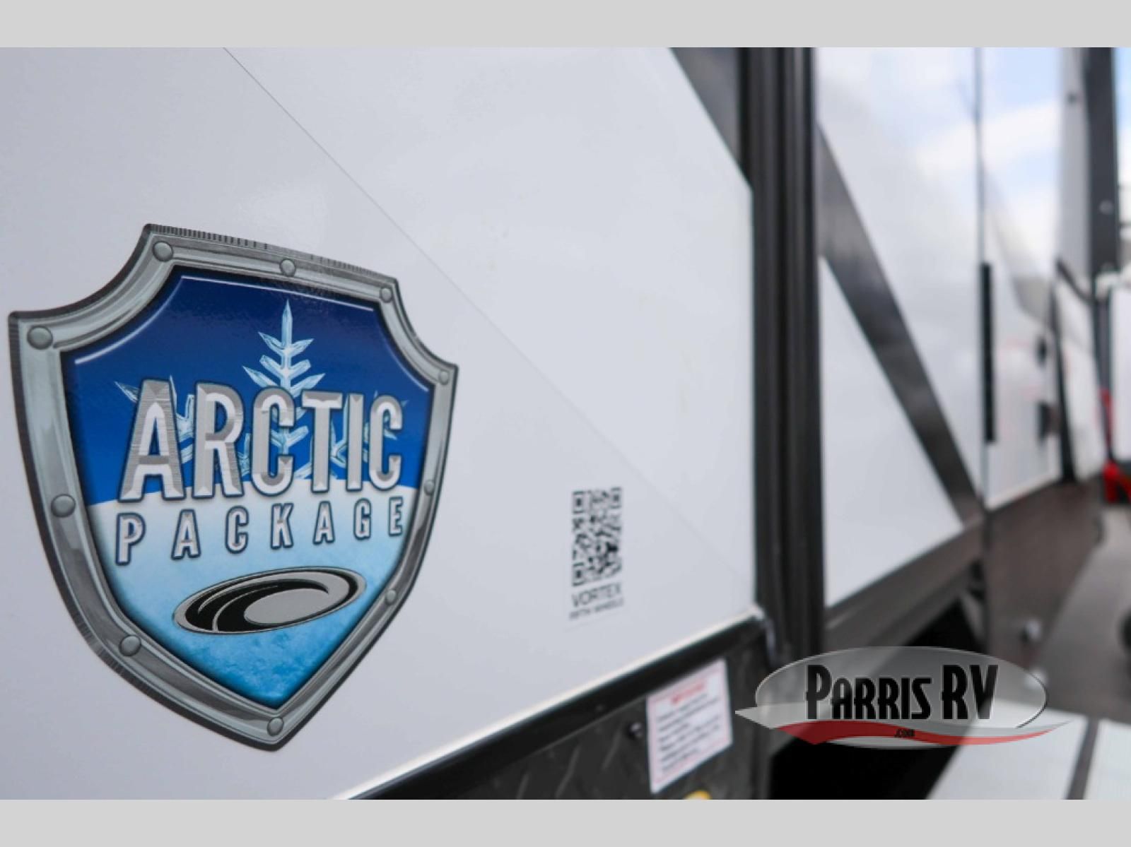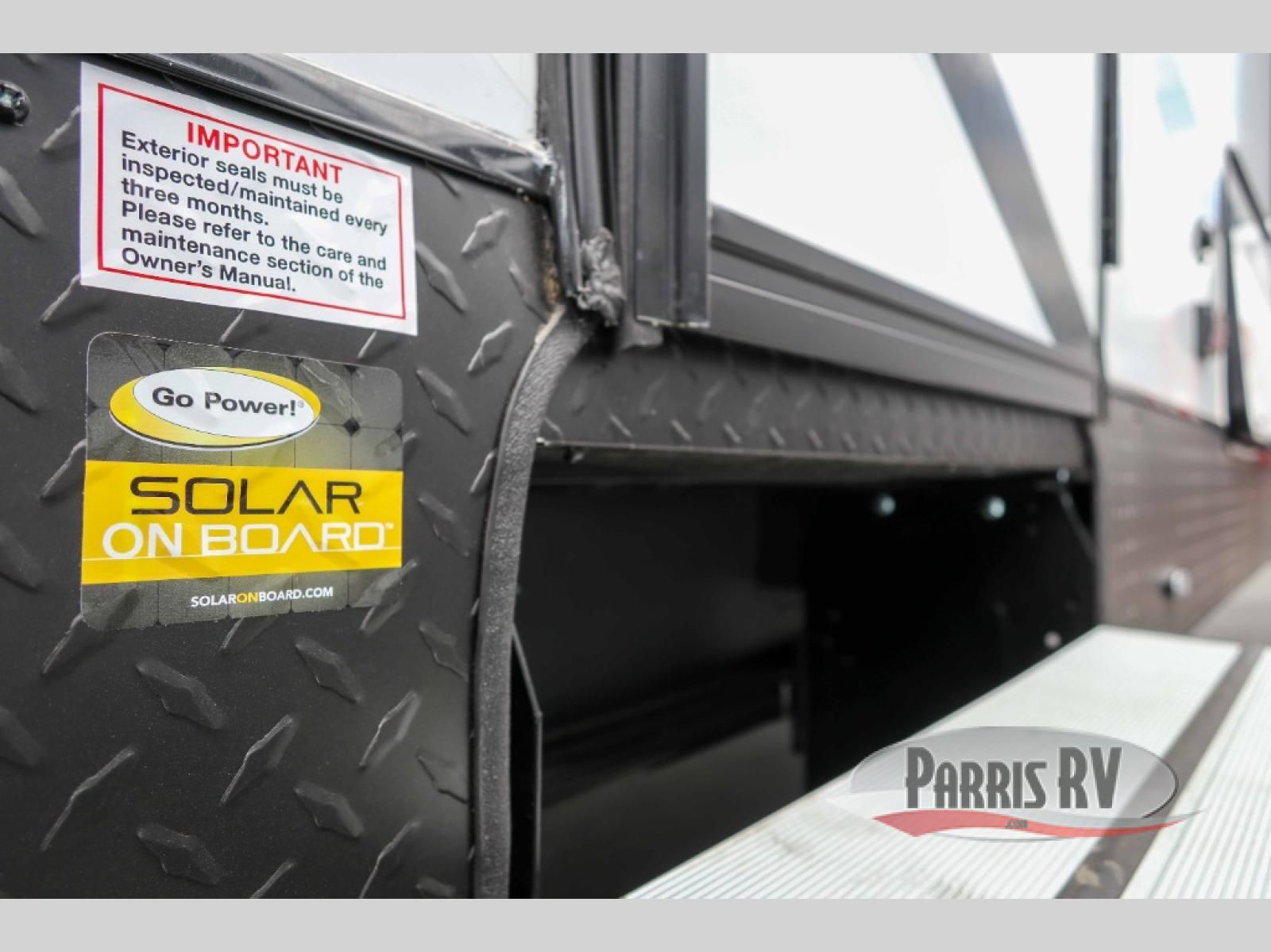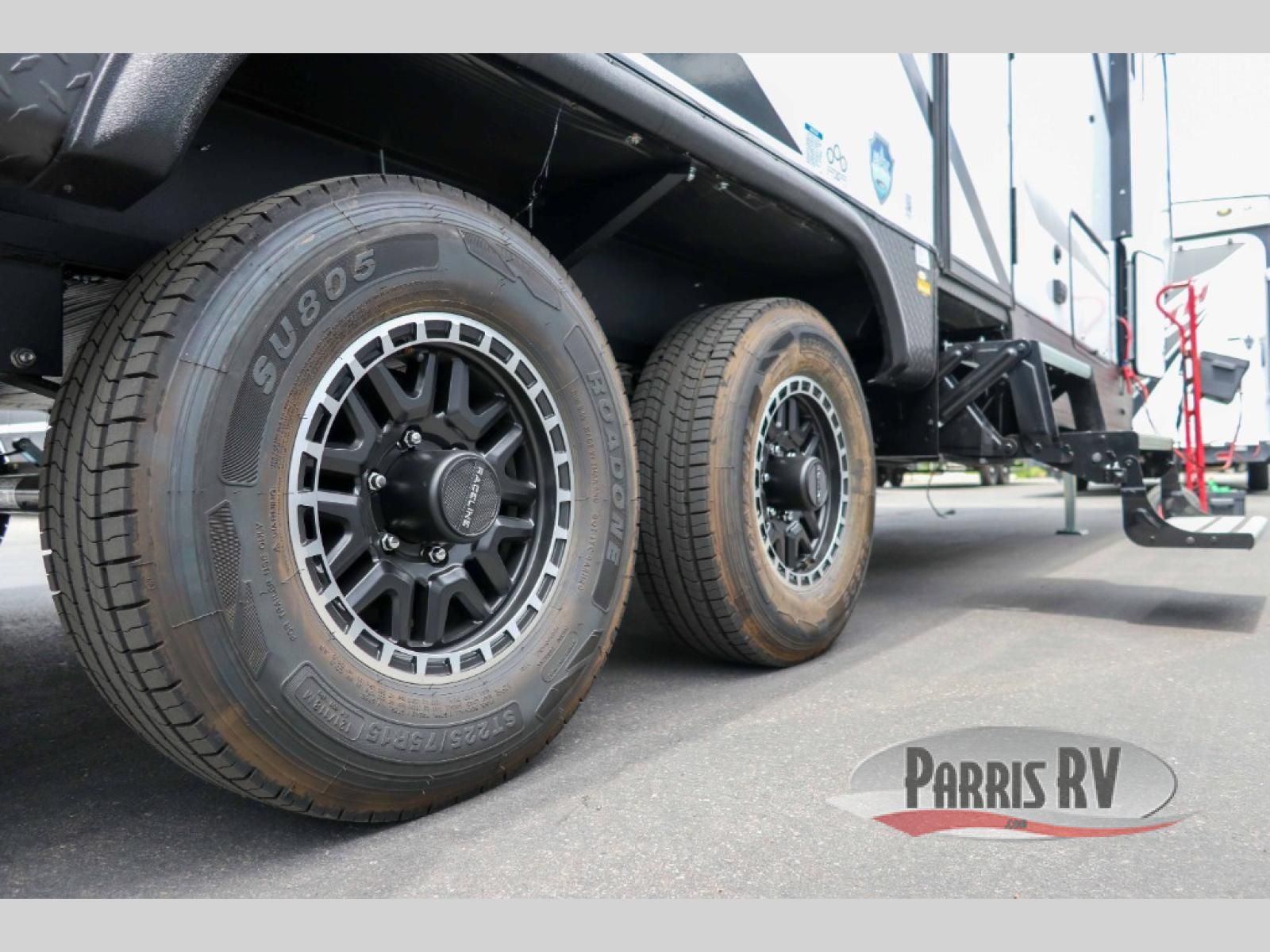 Your camping life is going to be a blast with the Genesis Supreme Vortex toy hauler! These work horses get the job done but also make it fun. You will be able to use the 40-gallon fuel station to gas up your toys when you come back from the trails, and the power awning with LED lights will give you protection as you use the exterior features. The 16" deluxe aluminum alloy wheels will get you to and from your destination with confidence, and the 30,000 or 35,000 BTU furnace will ensure that you don't freeze while you sleep on cool nights. You can keep power flowing with the 4.0kW generator with transfer switch, and you'll also enjoy the function and the style of the solid-surface countertops in the kitchen.