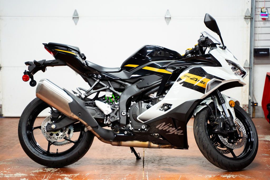 2026 Kawasaki Ninja® ZX™-4RR ABS AWAKEN YOUR SUPERSPORT Features may include: SUPERSPORT POWER CLASS-LEADING POWER Powered by a high-performance, in-line 4-cylinder 399cc engine with advanced racing-inspired technology, the Ninja® ZX™-4R supersport is a force to be reckoned with both on and off the track. HANDLING LEGENDARY HANDLING The Ninja® ZX™-4R supersport offers the best of both worlds with light maneuverability when riding in the city, and high-level supersport handling when sport or track riding. Key chassis dimensions were inspired by the Kawasaki Racing Team’s WorldSBK Ninja® ZX™-10RR race bike. ELECTRONICS ADVANCED RIDER SUPPORT SYSTEMS Next-level electronics offer the ability to harness the power and performance of the Ninja® ZX™-4R supersport in a way that delivers confidence over a wide range of riding situations and rider preferences. ERGONOMICS CONTROL & COMFORT A naturally aggressive yet slightly relaxed riding position lets you take greater advantage of the Ninja® ZX™-4R supersport bike's nimble handling while also providing a balance of wind protection and aerodynamics. STYLING STANDOUT DESIGN The Ninja® ZX™-4R supersport motorcycle stands out with aggressive Ninja® styling that exudes confidence and explosive power. ADDITIONAL: High-grade front fork with adjustable spring preload High-grade Showa BFRC lite rear shock Kawasaki Quick Shifter (KQS) (Dual-Direction)