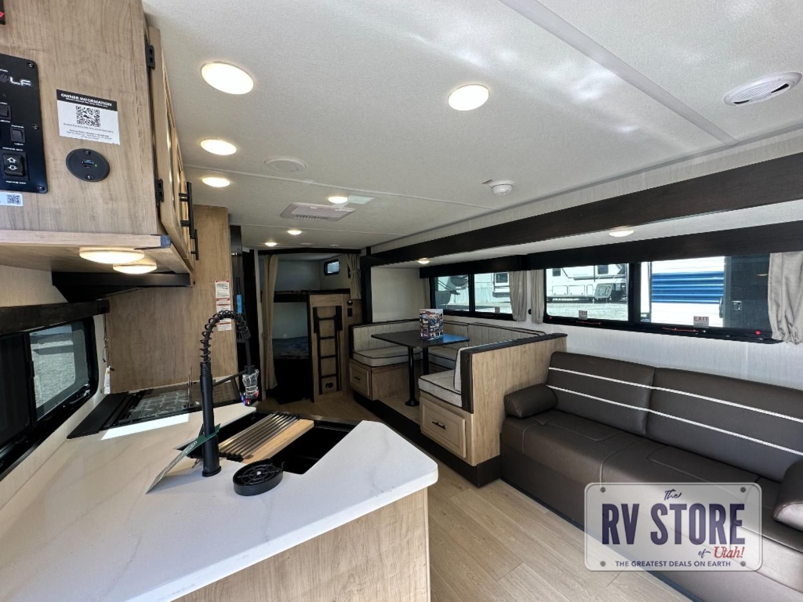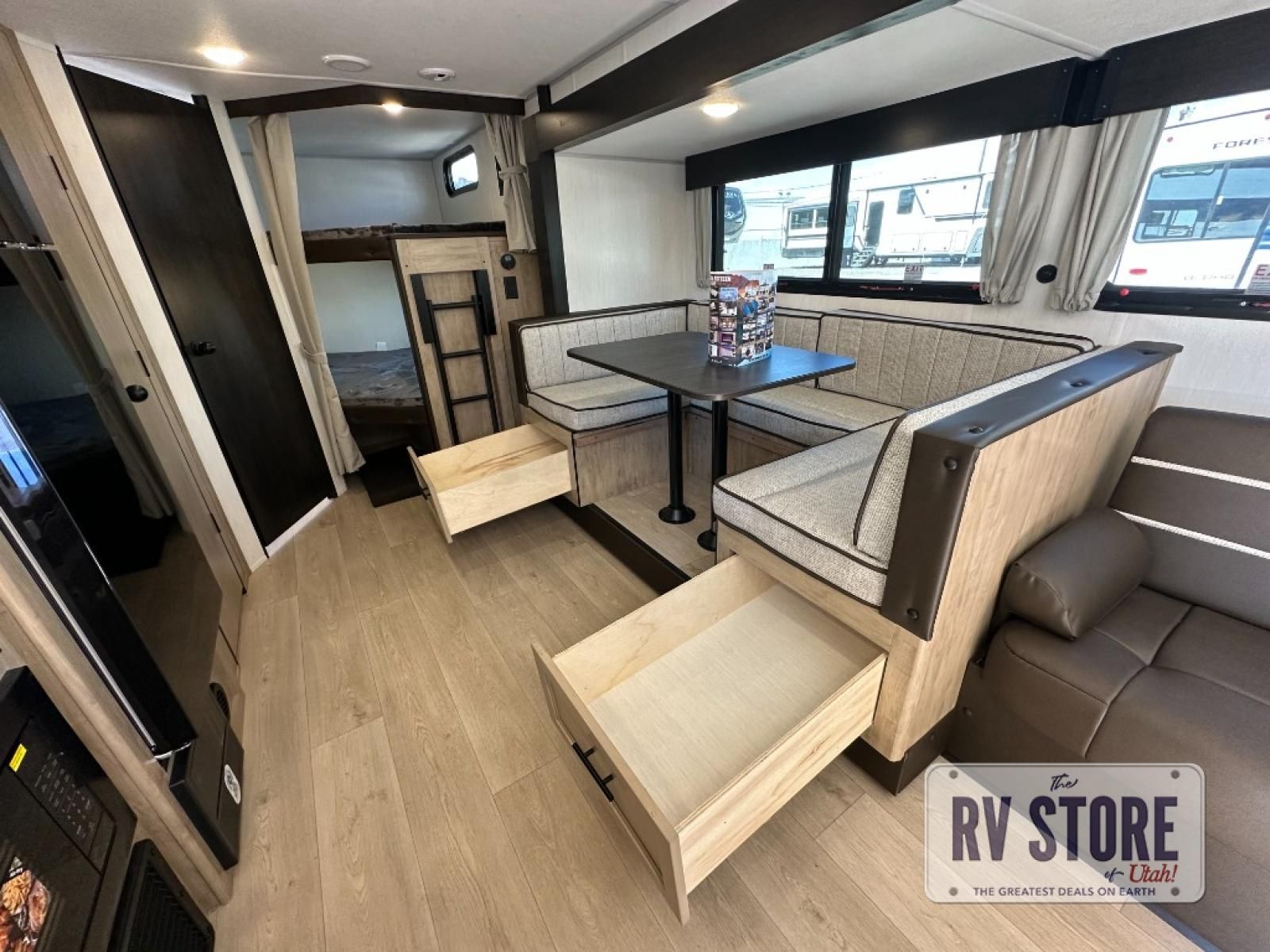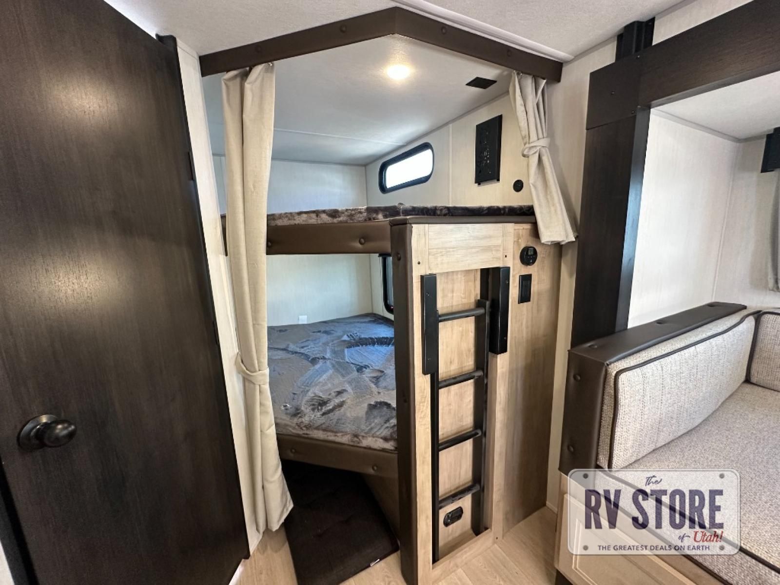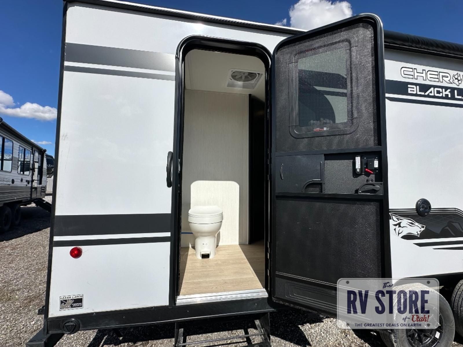 Come on inside this Cherokee Grey Wolf Black Label travel trailer and experience the convenience of a smooth flow of traffic in and out with two entry doors. The rear door leads into a full bath which is great for accessibility when outside and when you need to use the bathroom. Once inside, you will notice the large U-shaped dinette and the sofa which sit on the slide and create a spacious footprint for moving about, as well as great places to play games and socialize with your friends and family. A large pantry provides plenty of storage allowing you to stock up on your favorite snacks and dry goods for your family adventure. At night, there is sleeping space for everyone between the double-size bunks and the RV king bed, plus the furniture.