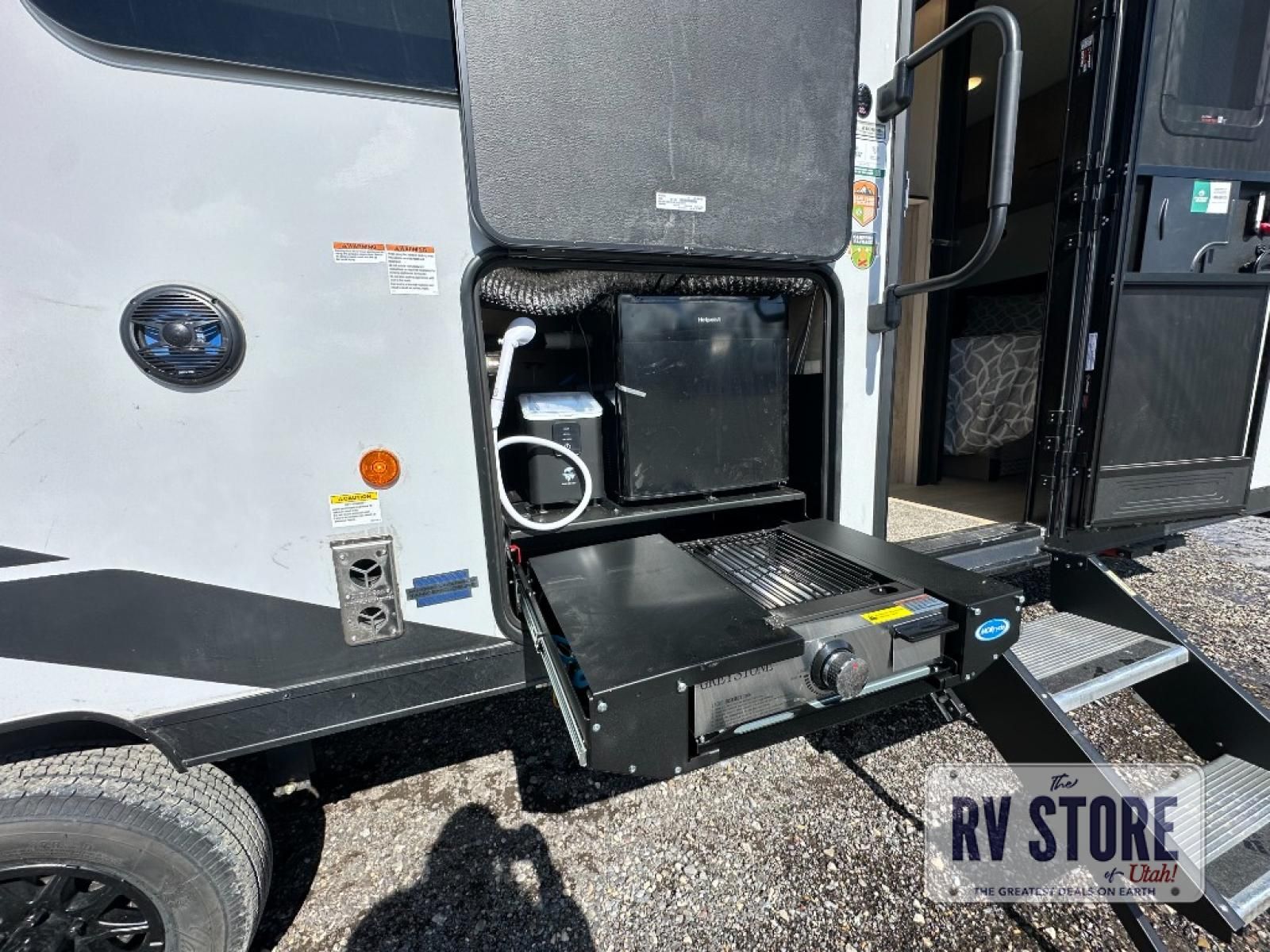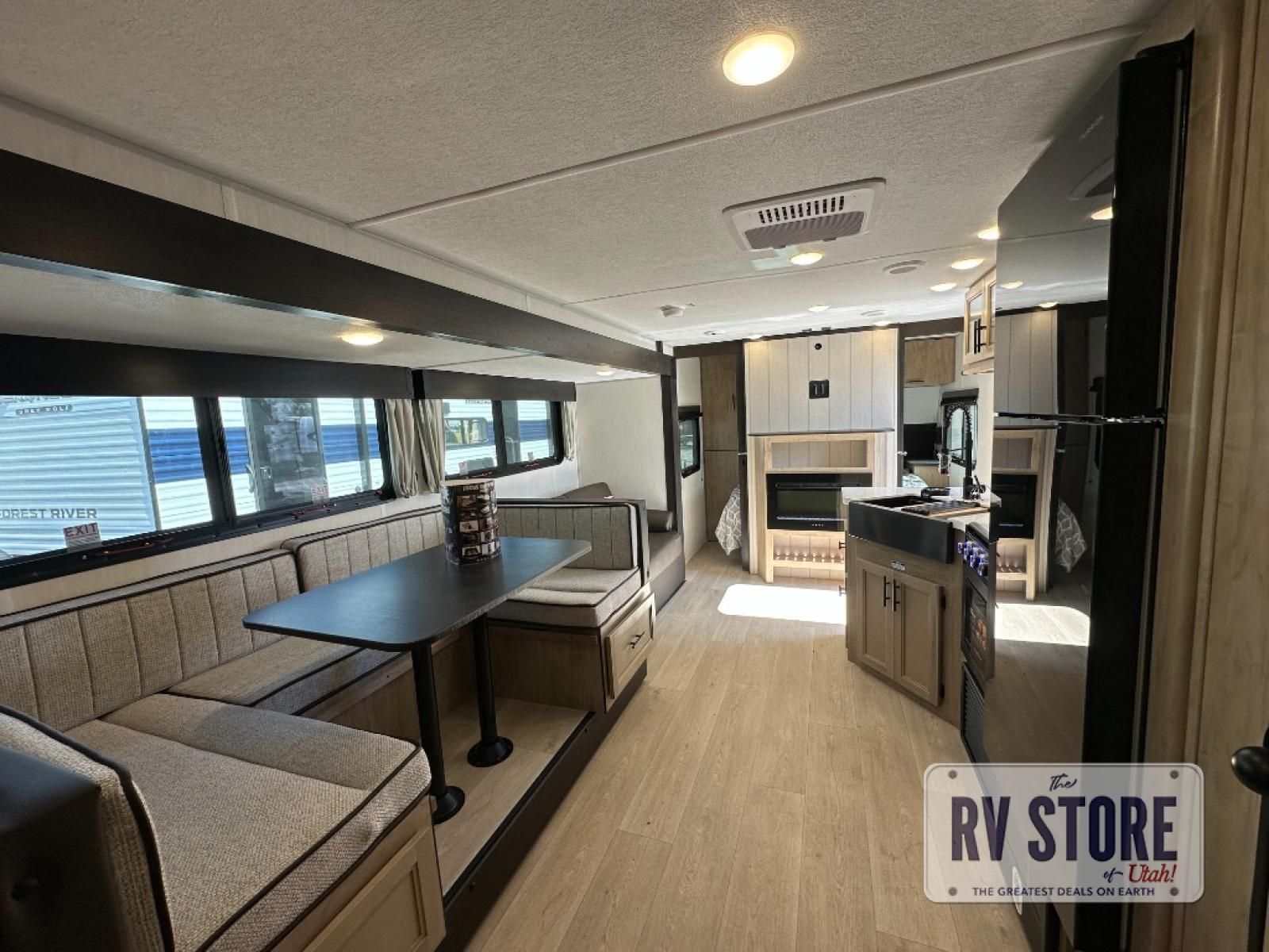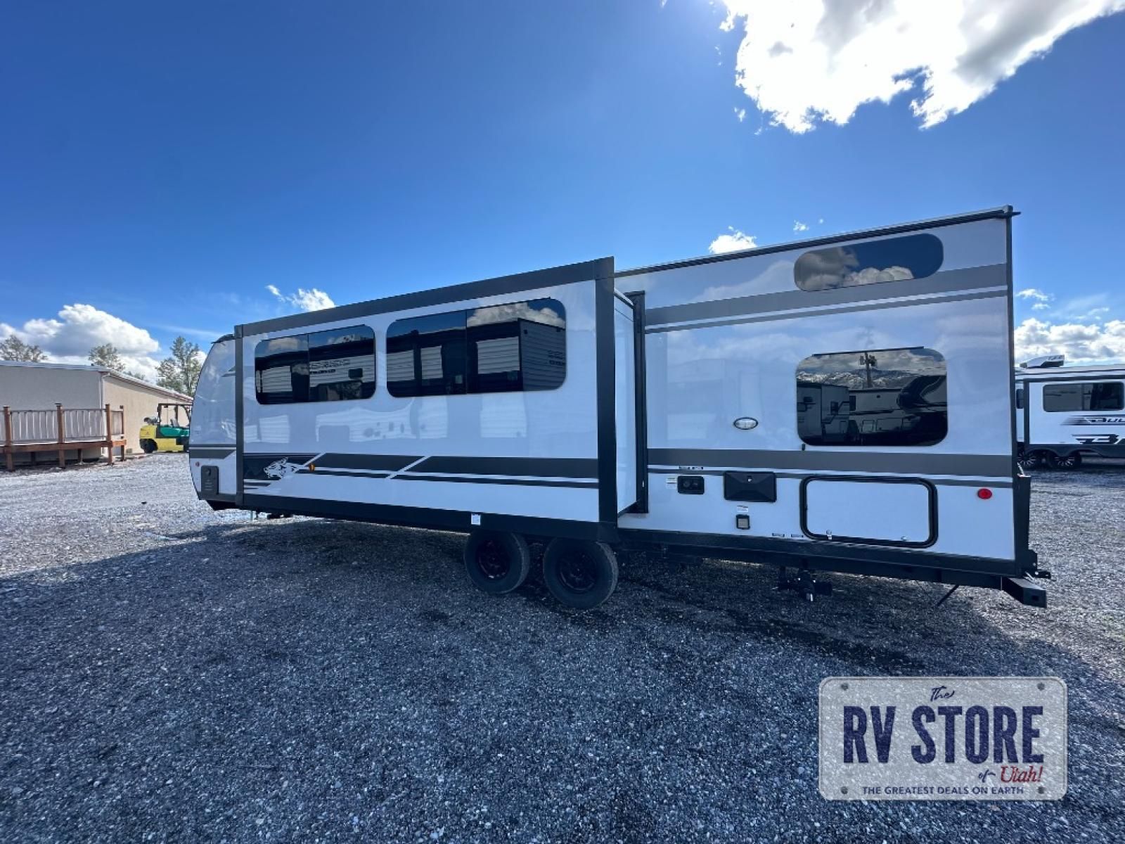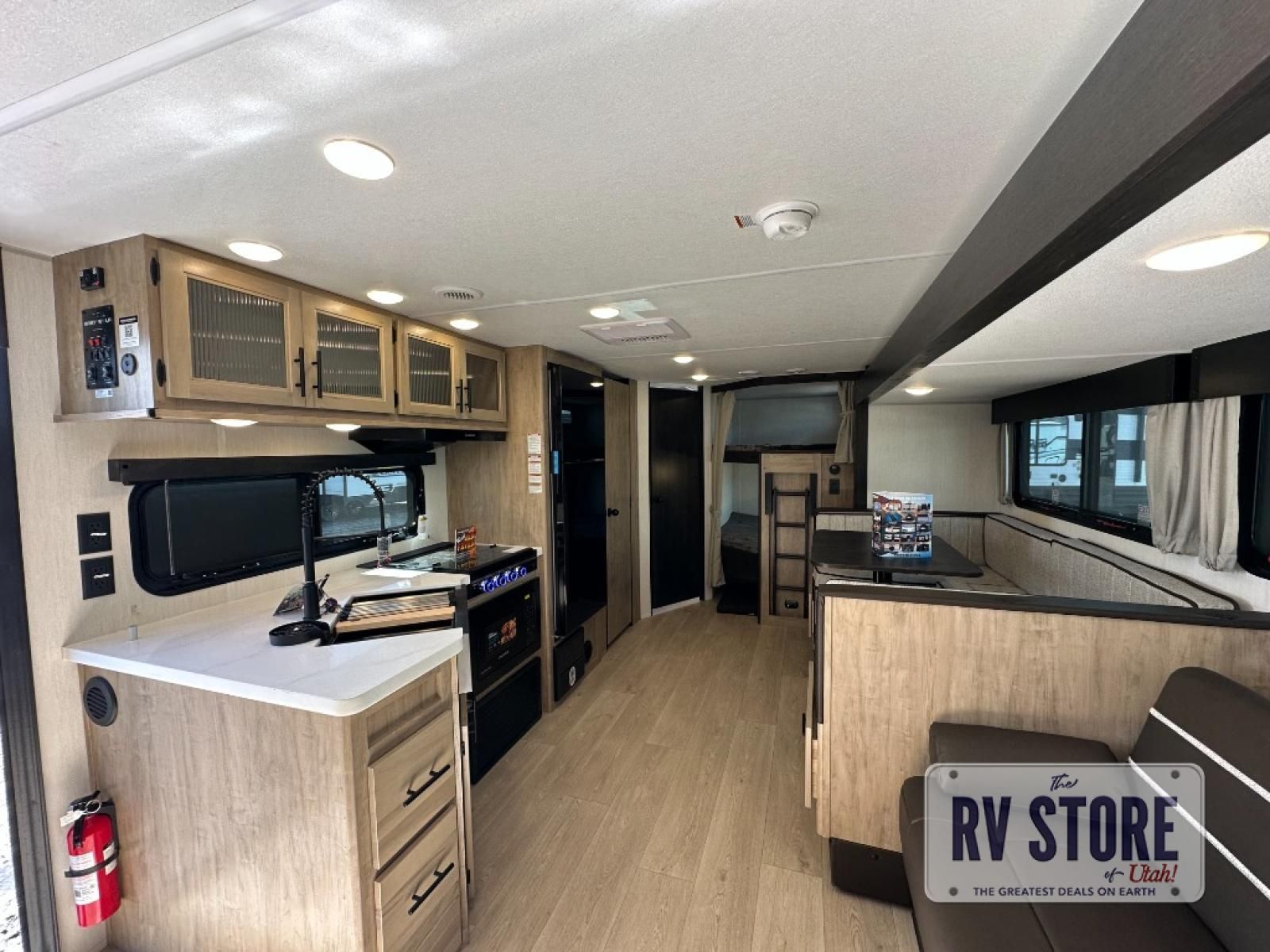 Come on inside this Cherokee Grey Wolf Black Label travel trailer and experience the convenience of a smooth flow of traffic in and out with two entry doors. The rear door leads into a full bath which is great for accessibility when outside and when you need to use the bathroom. Once inside, you will notice the large U-shaped dinette and the sofa which sit on the slide and create a spacious footprint for moving about, as well as great places to play games and socialize with your friends and family. A large pantry provides plenty of storage allowing you to stock up on your favorite snacks and dry goods for your family adventure. At night, there is sleeping space for everyone between the double-size bunks and the RV king bed, plus the furniture.