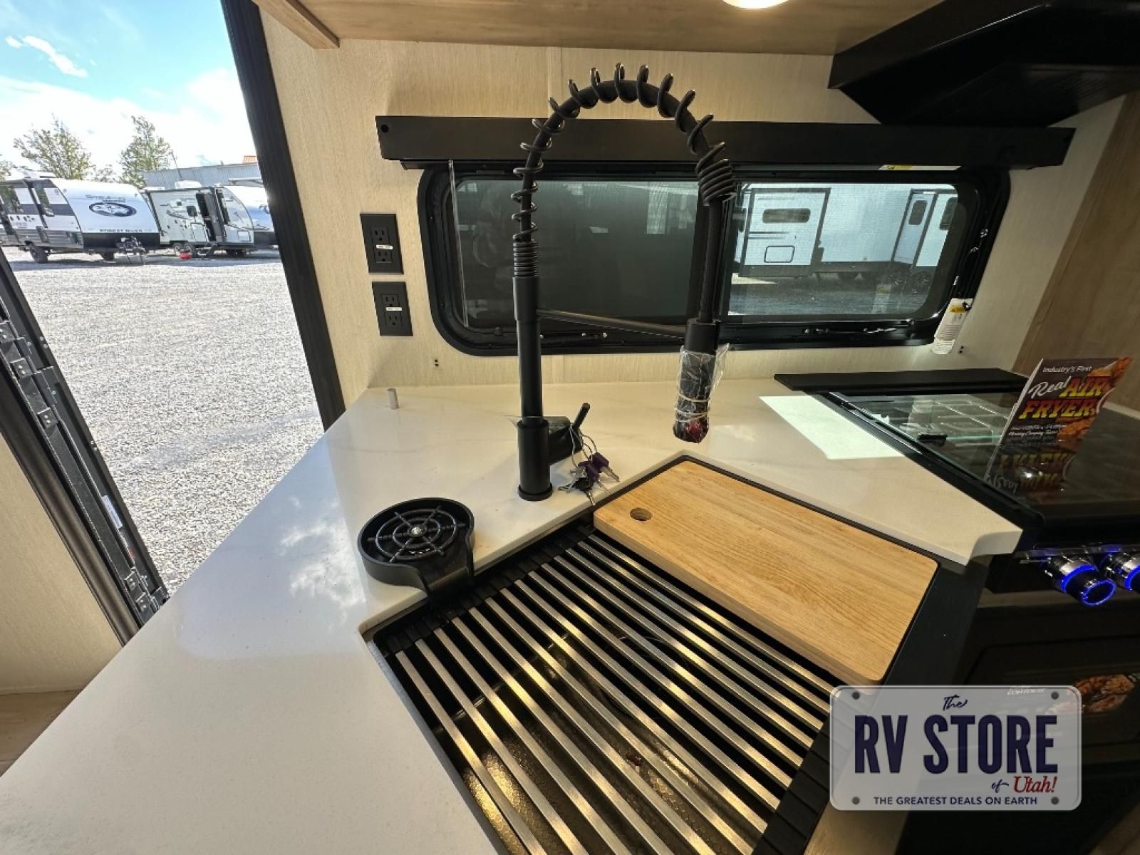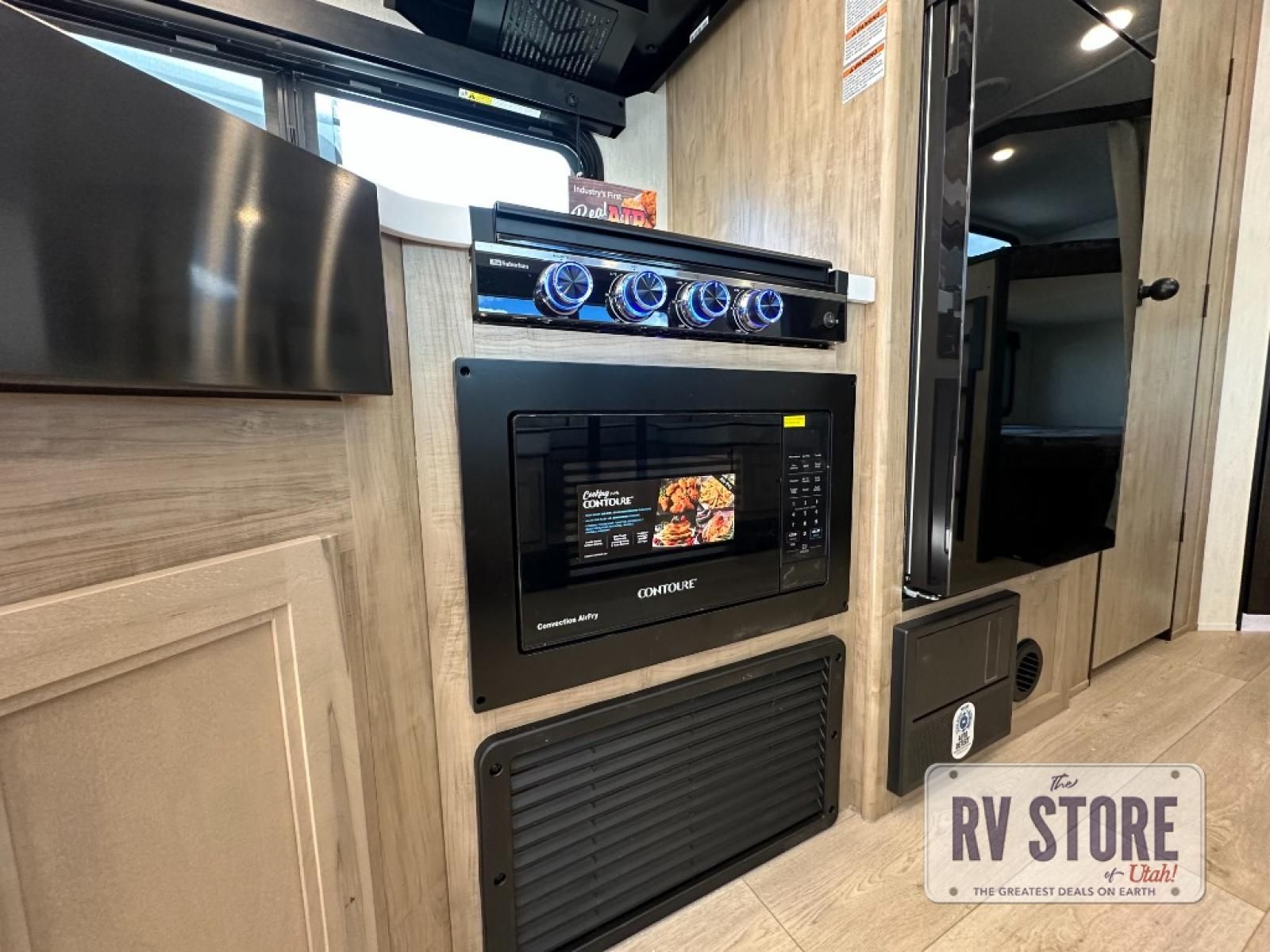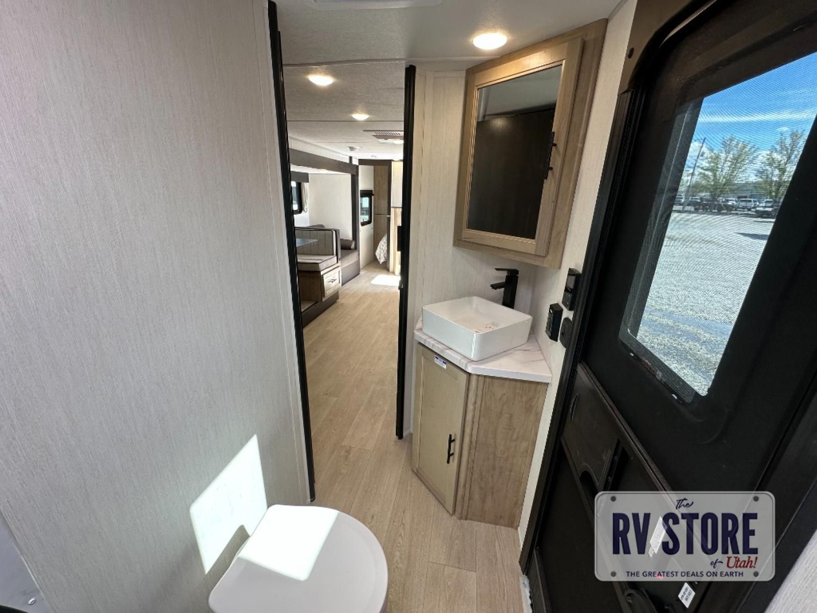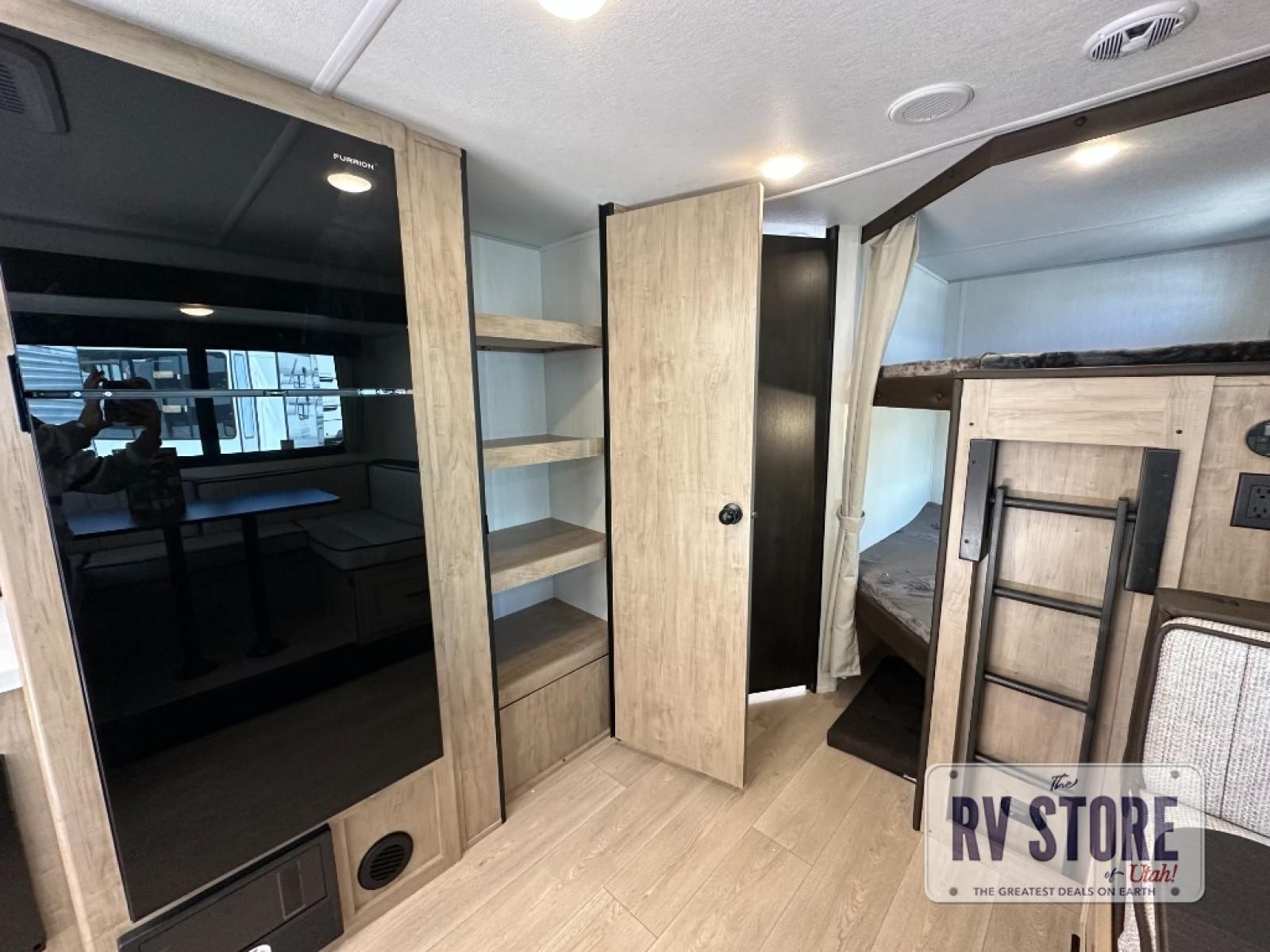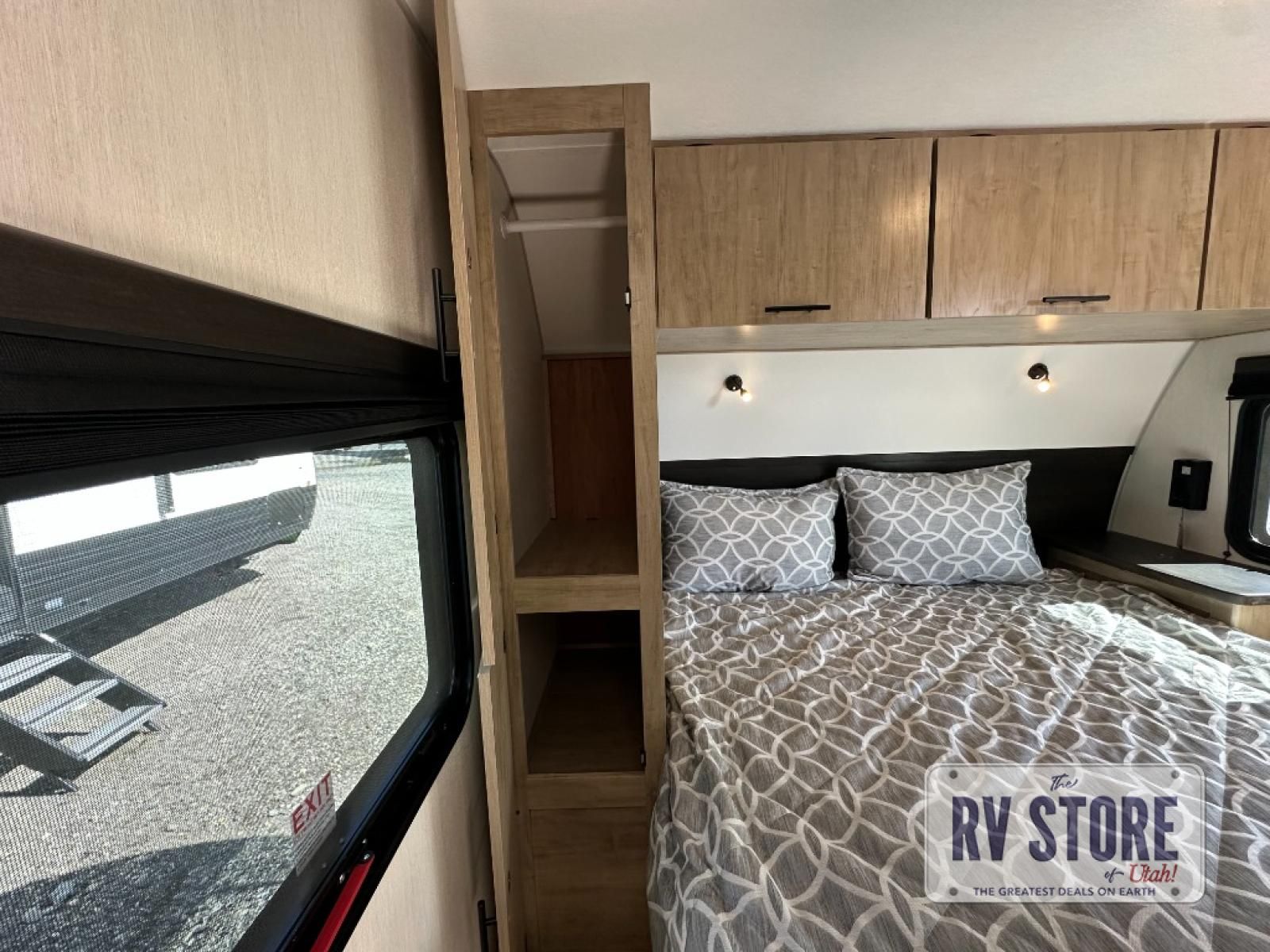Come on inside this Cherokee Grey Wolf Black Label travel trailer and experience the convenience of a smooth flow of traffic in and out with two entry doors. The rear door leads into a full bath which is great for accessibility when outside and when you need to use the bathroom. Once inside, you will notice the large U-shaped dinette and the sofa which sit on the slide and create a spacious footprint for moving about, as well as great places to play games and socialize with your friends and family. A large pantry provides plenty of storage allowing you to stock up on your favorite snacks and dry goods for your family adventure. At night, there is sleeping space for everyone between the double-size bunks and the RV king bed, plus the furniture.