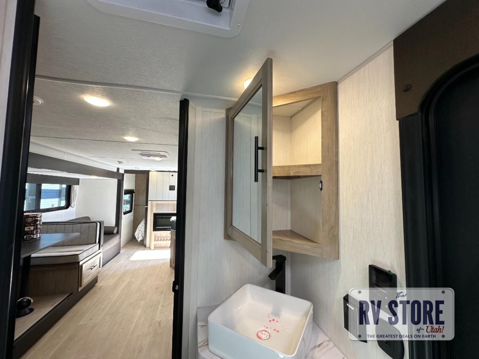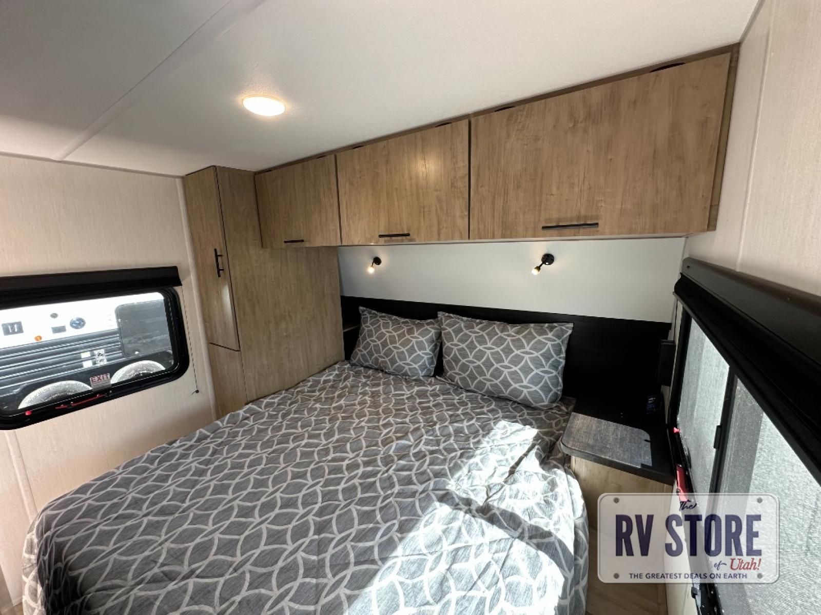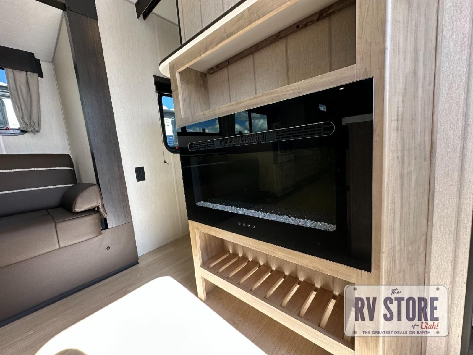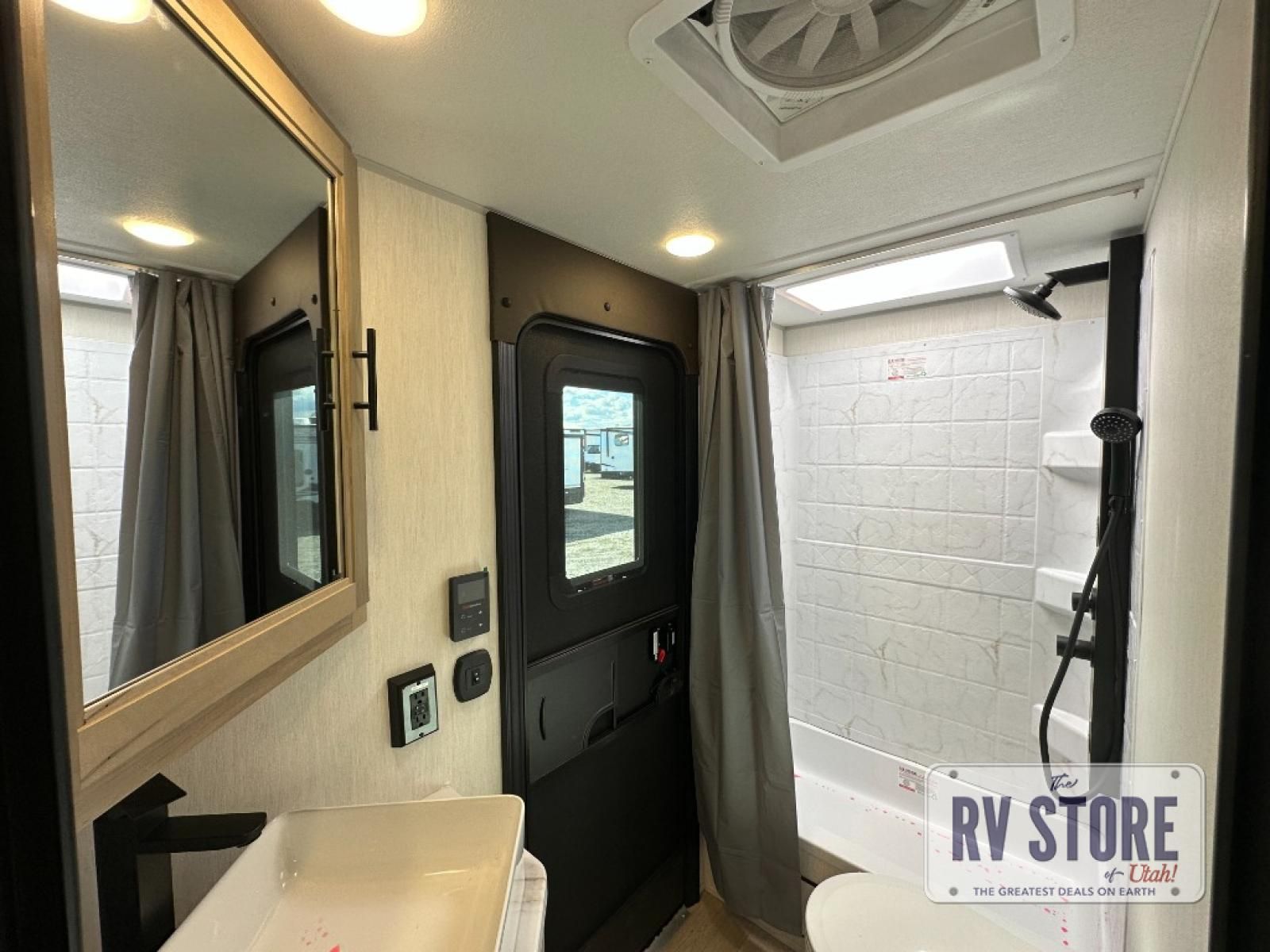 Come on inside this Cherokee Grey Wolf Black Label travel trailer and experience the convenience of a smooth flow of traffic in and out with two entry doors. The rear door leads into a full bath which is great for accessibility when outside and when you need to use the bathroom. Once inside, you will notice the large U-shaped dinette and the sofa which sit on the slide and create a spacious footprint for moving about, as well as great places to play games and socialize with your friends and family. A large pantry provides plenty of storage allowing you to stock up on your favorite snacks and dry goods for your family adventure. At night, there is sleeping space for everyone between the double-size bunks and the RV king bed, plus the furniture.