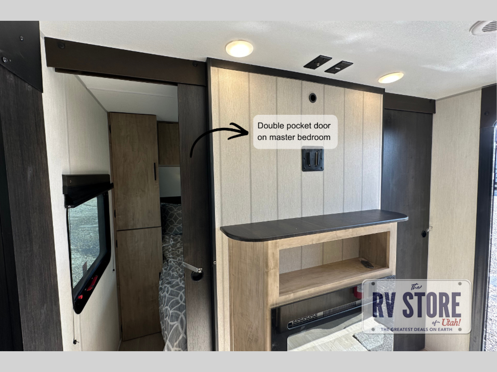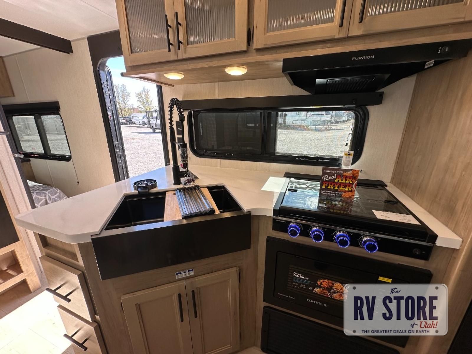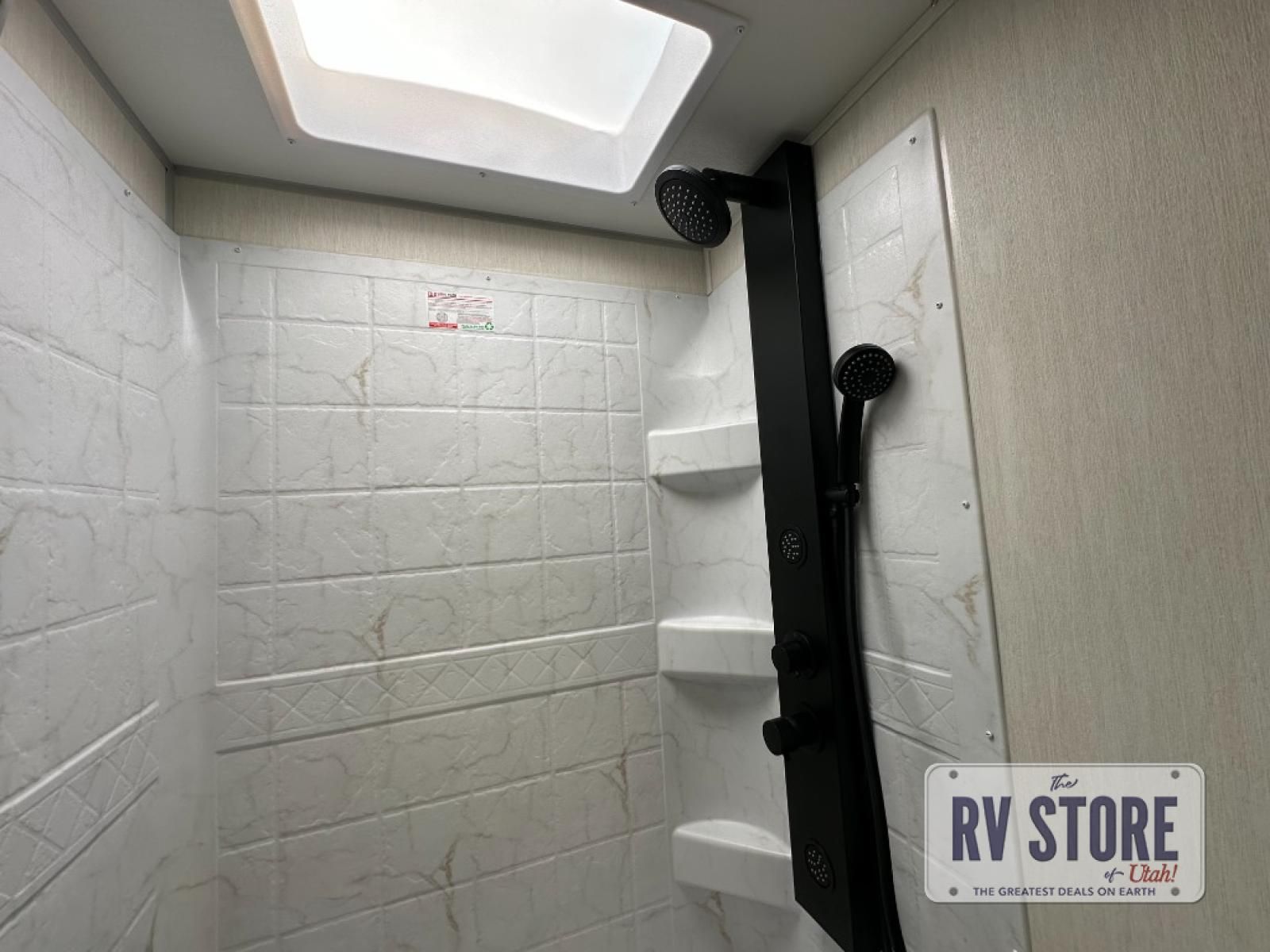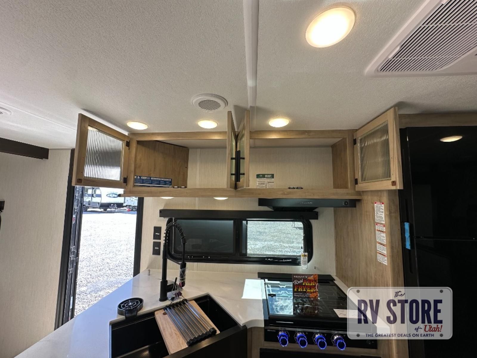 Come on inside this Cherokee Grey Wolf Black Label travel trailer and experience the convenience of a smooth flow of traffic in and out with two entry doors. The rear door leads into a full bath which is great for accessibility when outside and when you need to use the bathroom. Once inside, you will notice the large U-shaped dinette and the sofa which sit on the slide and create a spacious footprint for moving about, as well as great places to play games and socialize with your friends and family. A large pantry provides plenty of storage allowing you to stock up on your favorite snacks and dry goods for your family adventure. At night, there is sleeping space for everyone between the double-size bunks and the RV king bed, plus the furniture.