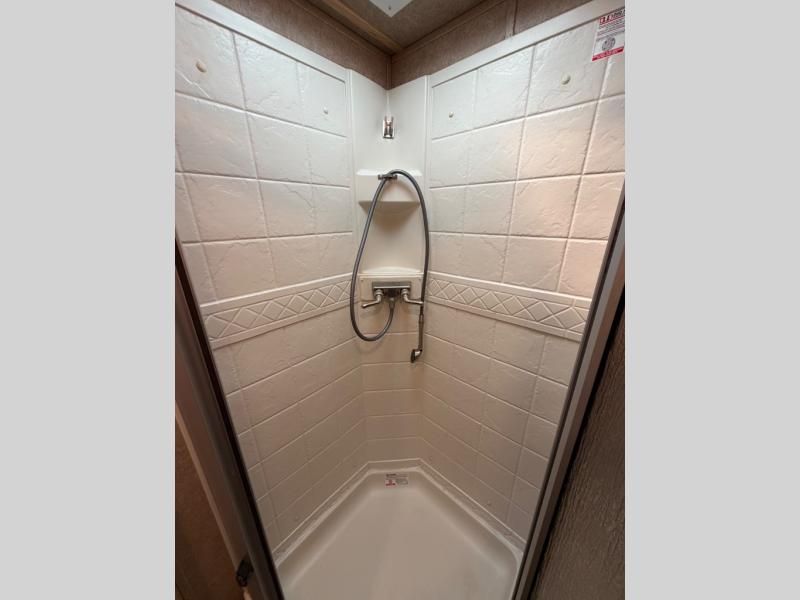 Bathroom: Private bath with a radius shower, porcelain foot-flush toilet, and vanity