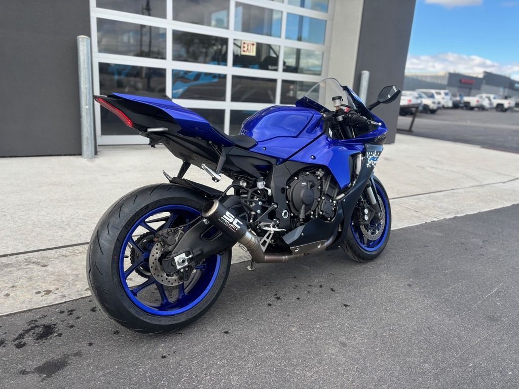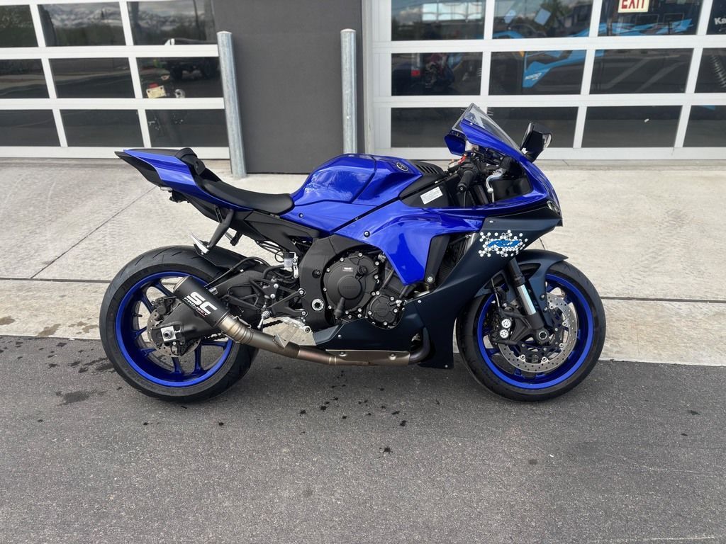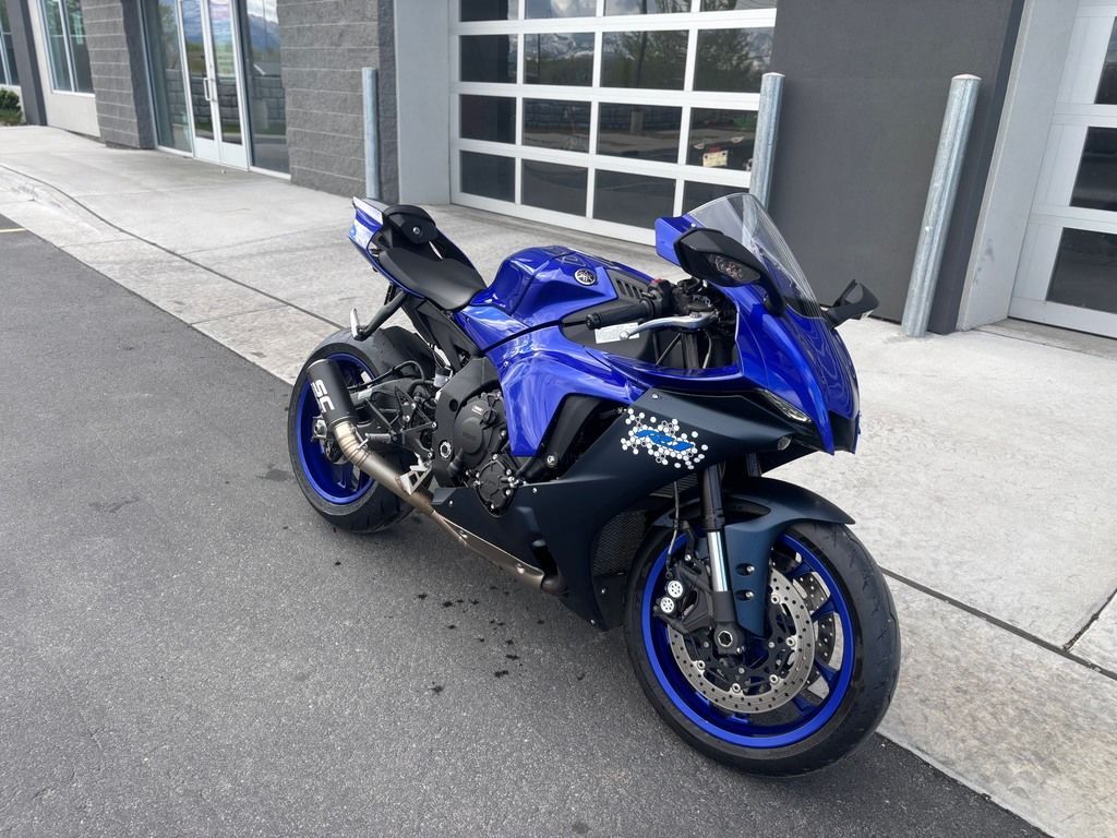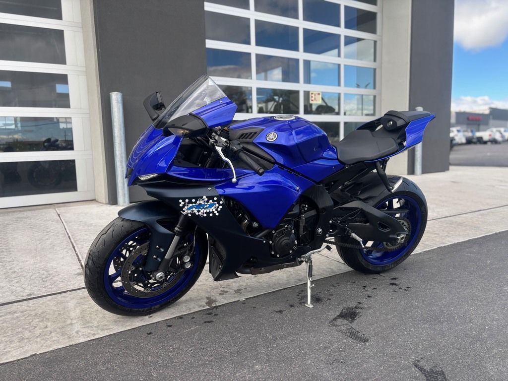 2023 Yamaha YZF-R1 R HISTORY. YOUR FUTURE. WE R1. Featuring next-generation R-Series styling, sophisticated electronic control, supersport braking and suspension performance and a high-performance crossplane engine. Features may include: TOP FEATURES MotoGP®-Derived Crossplane Crankshaft Engine The 998cc inline-four-cylinder engine features Yamaha’s exclusive crossplane crankshaft technology derived from Yamaha's YZR-M1 MotoGP® race bike. Every aspect of this unique engine is built to thrill. ENGINE Cutting-Edge CP4® Engine The R1’s 998cc inline-four-cylinder engine features Yamaha’s exclusive crossplane crankshaft technology derived from Yamaha's YZR-M1 MotoGP® race bike. By equalizing inertial forces at the crankshaft, the CP4 motor delivers a direct feeling of linear torque, giving the rider the ultimate connection between throttle grip and the rear wheel. High-Output Engine Technology Titanium connecting rods use Yamaha’s precision fracture-split method to ensure maximum reliability with minimal weight. Combined with titanium intake valves and forged pistons, these lightweight parts help achieve the CP4’s high redline and over-rev capability. The cylinder block is also offset from the crankshaft, reducing friction loads on the pistons and bores. CHASSIS/SUSPENSION Brake Control (BC) System with ABS Developed on racetracks around the world, Yamaha’s Brake Control (BC) System works with an Anti-lock Braking System (ABS) to minimize brake slip under aggressive braking or on less than ideal surfaces. The adjustable BC System uses the IMU to provide progressive brake force intervention as lean angle increases which boosts rider confidence when braking mid-corner. ADDITIONAL FEATURES Sleek Styling The YZF-R1 features beautifully integrated bodywork and sleek, stylish lines which create an unmistakably aggressive, aerodynamic profile. ELECTRONICS Ride-by-Wire Throttle System The R1 features a ride-by-wire Yamaha Chip Controlled Throttle (YCC-T®) system built around the Accelerator Position Sensor with Grip (APSG), which eliminates the throttle cables. As before, YCC-T precisely senses throttle input by the rider and actuates the throttle valves to actively control intake volume, allowing for cutting-edge computerized engine management but in a lighter package. This model comes equipped all ready with a full system SC Project exhaust and a NRC tail tidy!