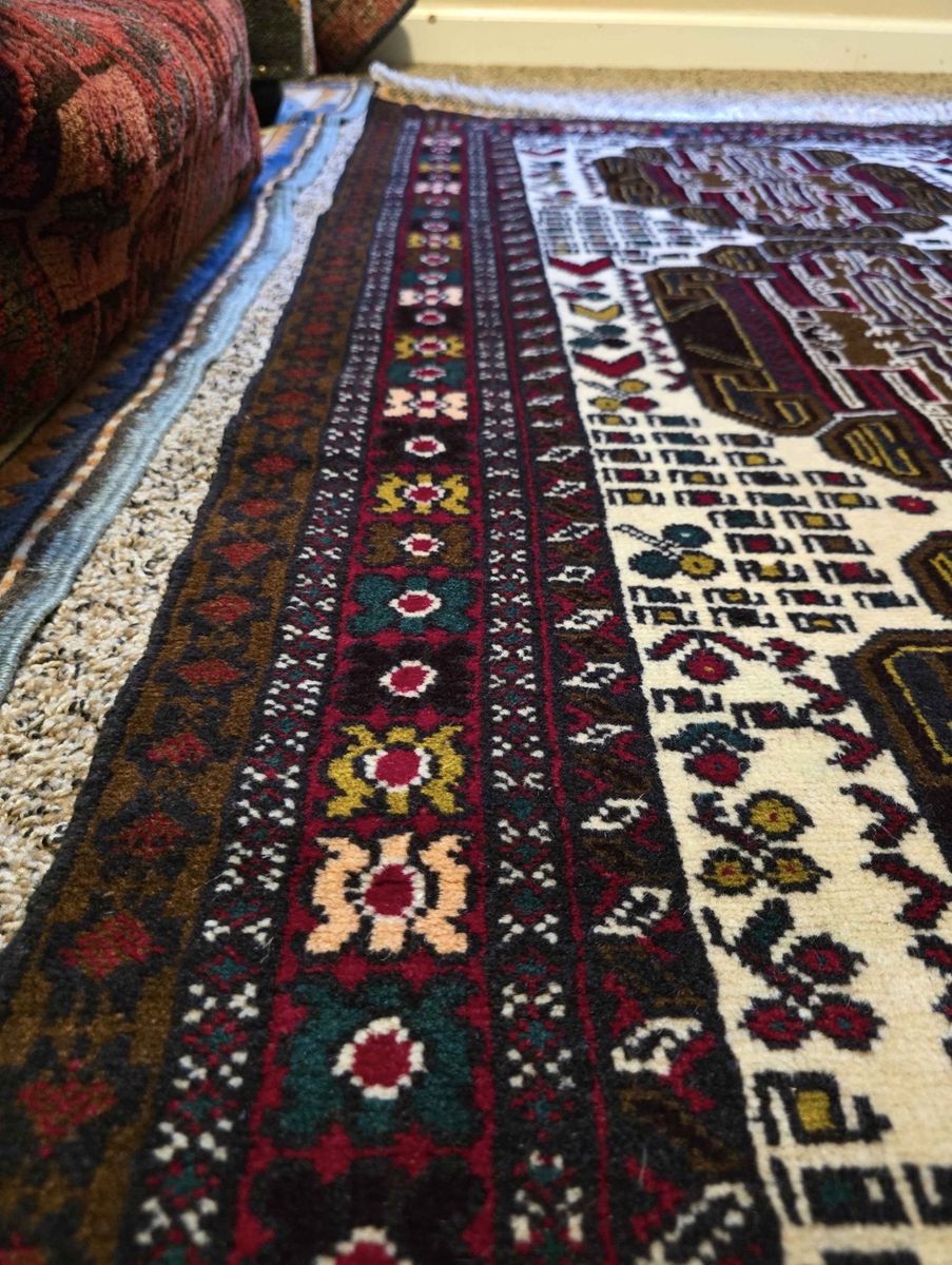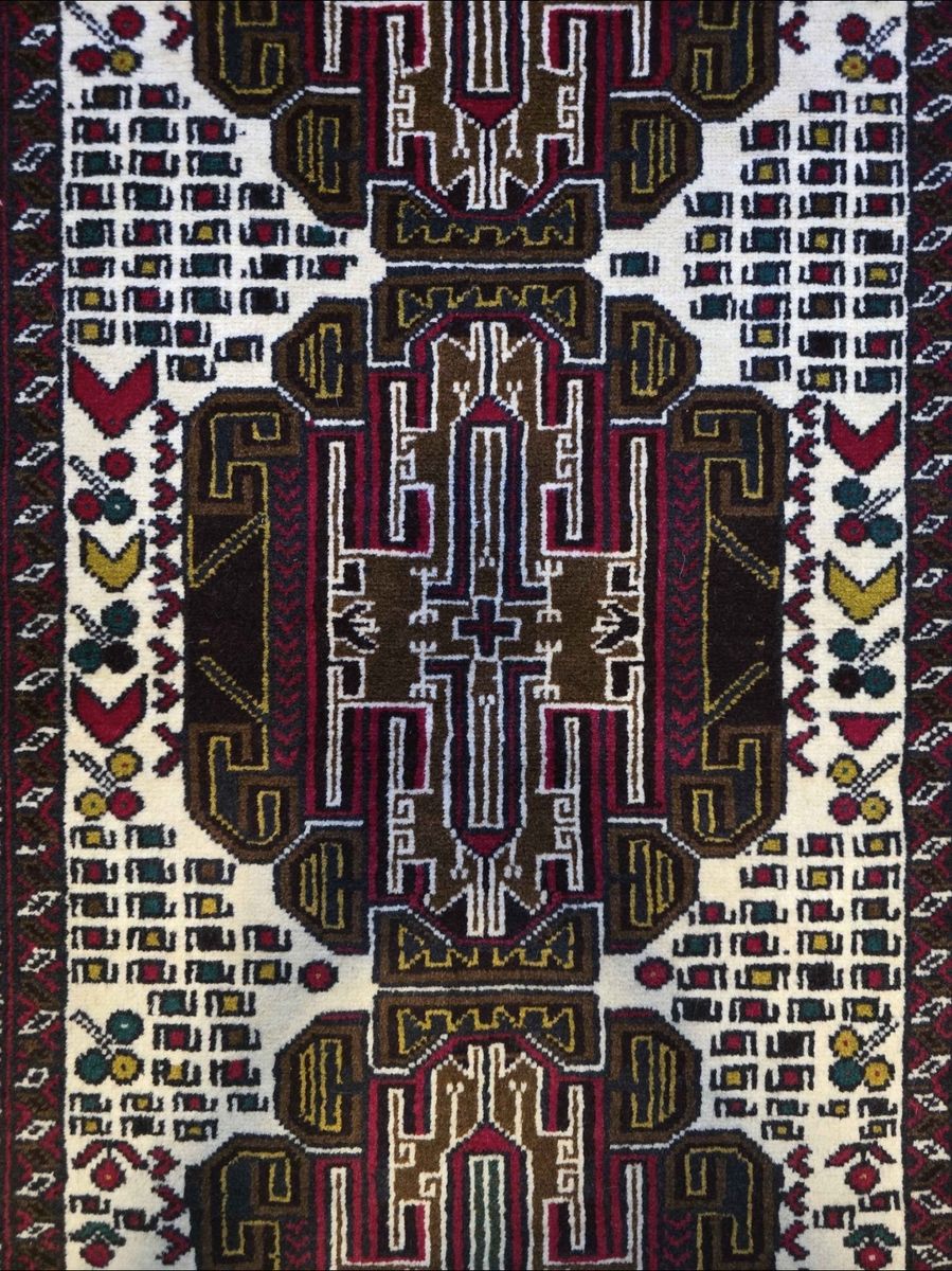 ZelleVintage Afghan Baluchi rug from the 1980s. This piece features deep wines, earthy browns, mustard gold, and an ivory field that makes the geometric medallions pop. The borders are full of floral motifs in a dark background, drawing your eye inward. Beautiful rug!