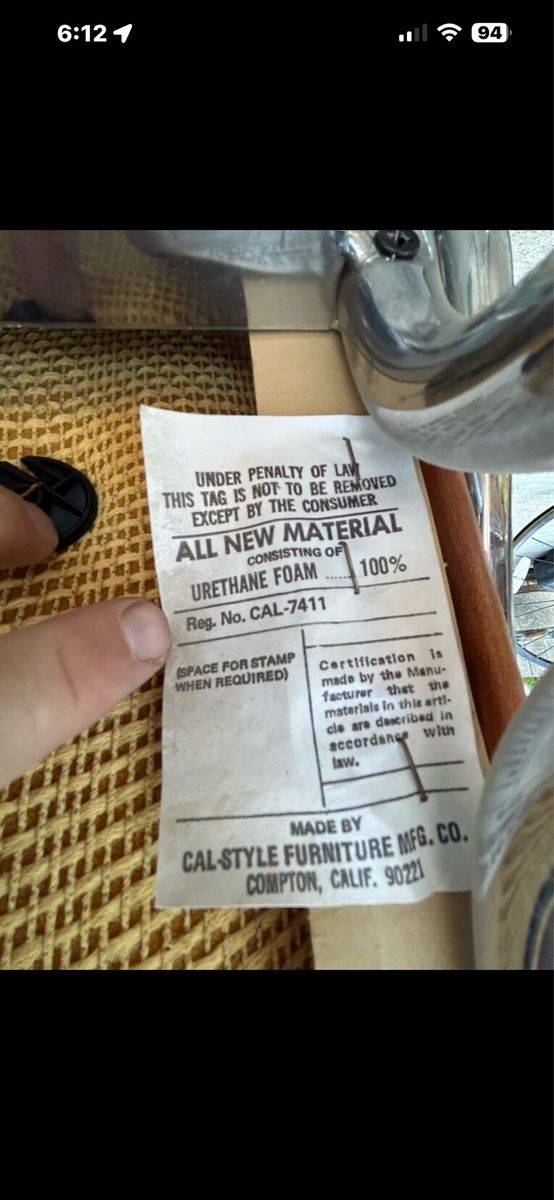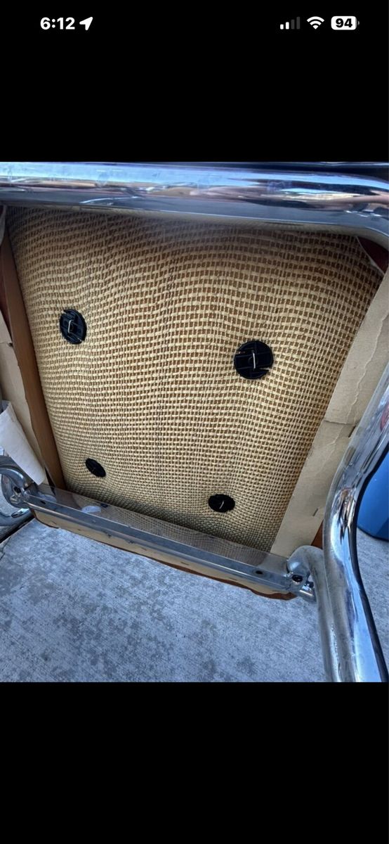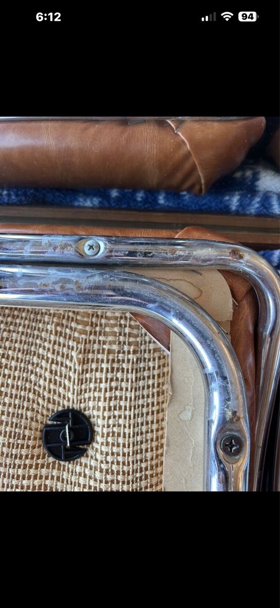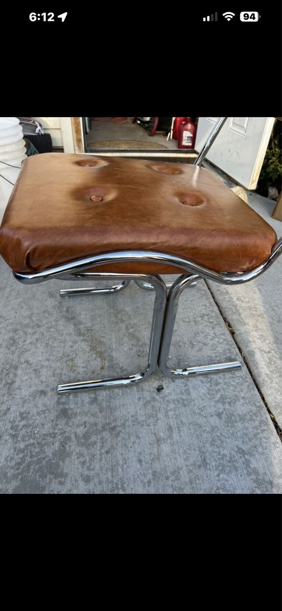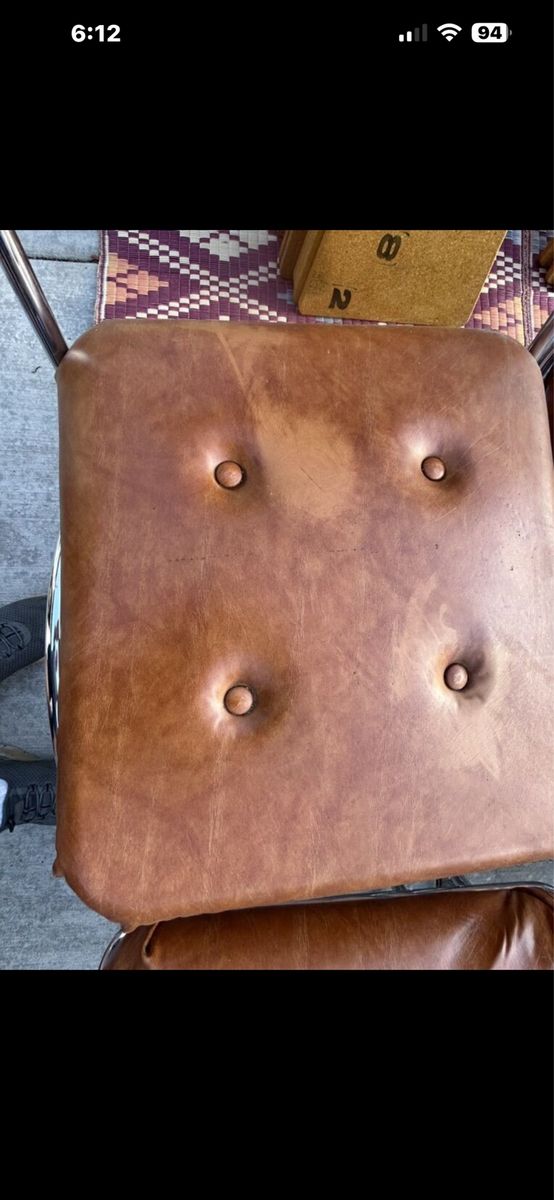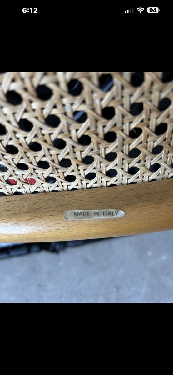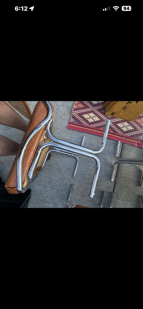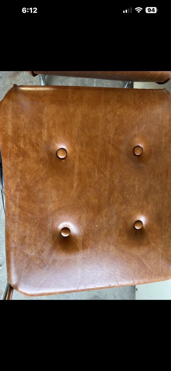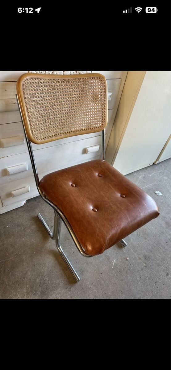 VenmoThese are harder to find these days, Mid Century Modern Cal-Style or Retro Chrome and Brown Naugahyde Side Chairs. These were made in Italy in 1976, they are the Marcel Breuer Francesca style looking dining chairs composed out of steel tubular structure, chromium-plated. Lot of 6 identical chairs, no table. The back rest I believe is natural cane and stained beech edge and has the rattan looks, the seat features an upholstered polyurethane faux leather. One seat has some fading in spots and one button on one chair had pushed through but overall in great condition for the age. Some light surface rust on the bottom below the seat, see pictures. Make me an offer. Cash or Venmo only.