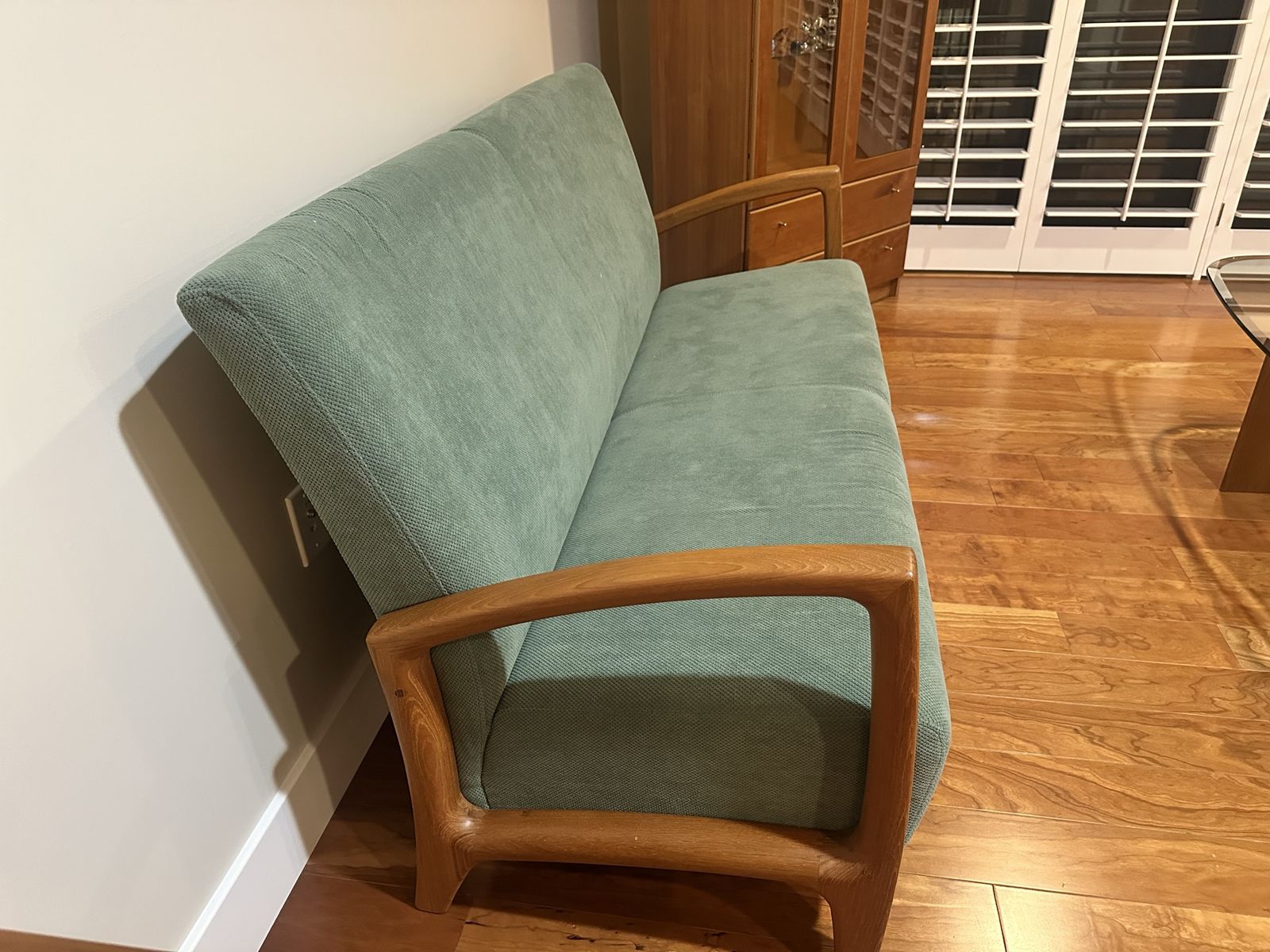 VenmoMid century style Danish teak sofa with soft colored green fabric. 66.75 inches wide 28 inches deep and 35 inches tall
