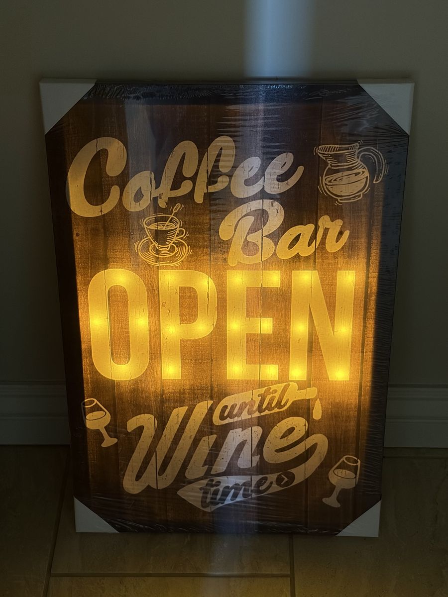 ApplePayAdd some personality to your kitchen or home bar with this brand-new, battery-operated LED canvas! It features a rustic wood-plank design with the fun phrase: "Coffee Bar Open until Wine Time." This is perfect for home decor or as a housewarming gift. Since it’s battery-powered, you can hang it anywhere without worrying about messy cords or needing to be near an outlet. Details: • Condition: Brand New (still in original plastic wrap with corner protectors). • Features: Integrated LED backlighting that illuminates the text. • Mounting: Pre-installed hanging wire on the back for easy setup. • Power: Battery operated