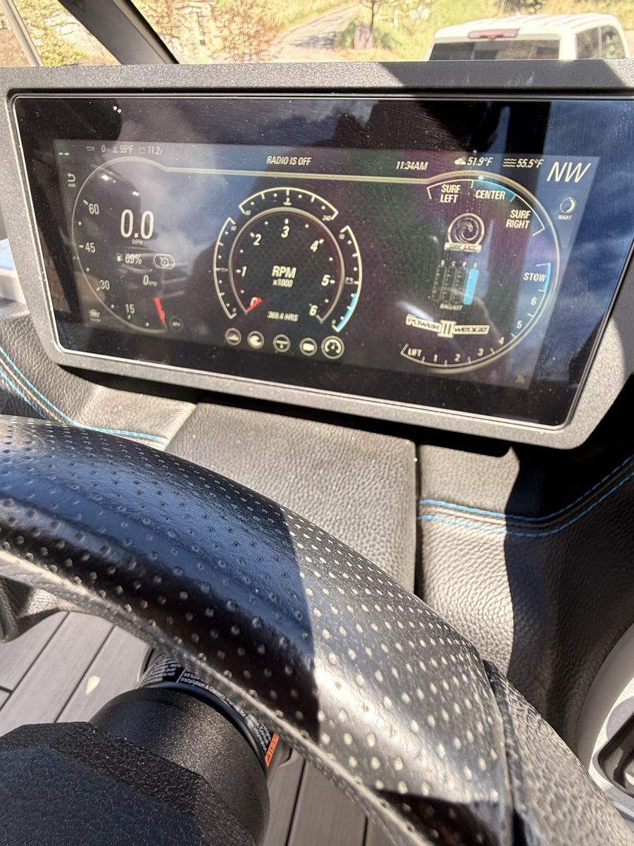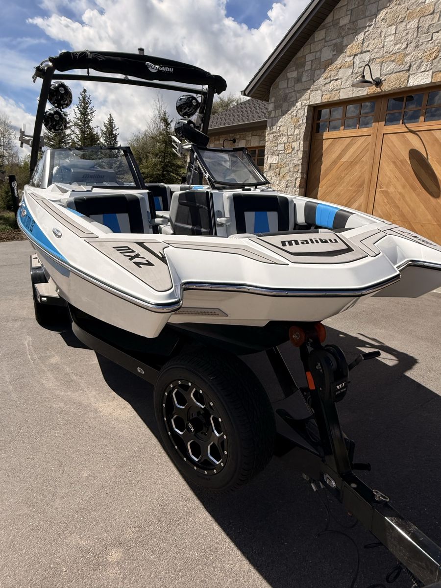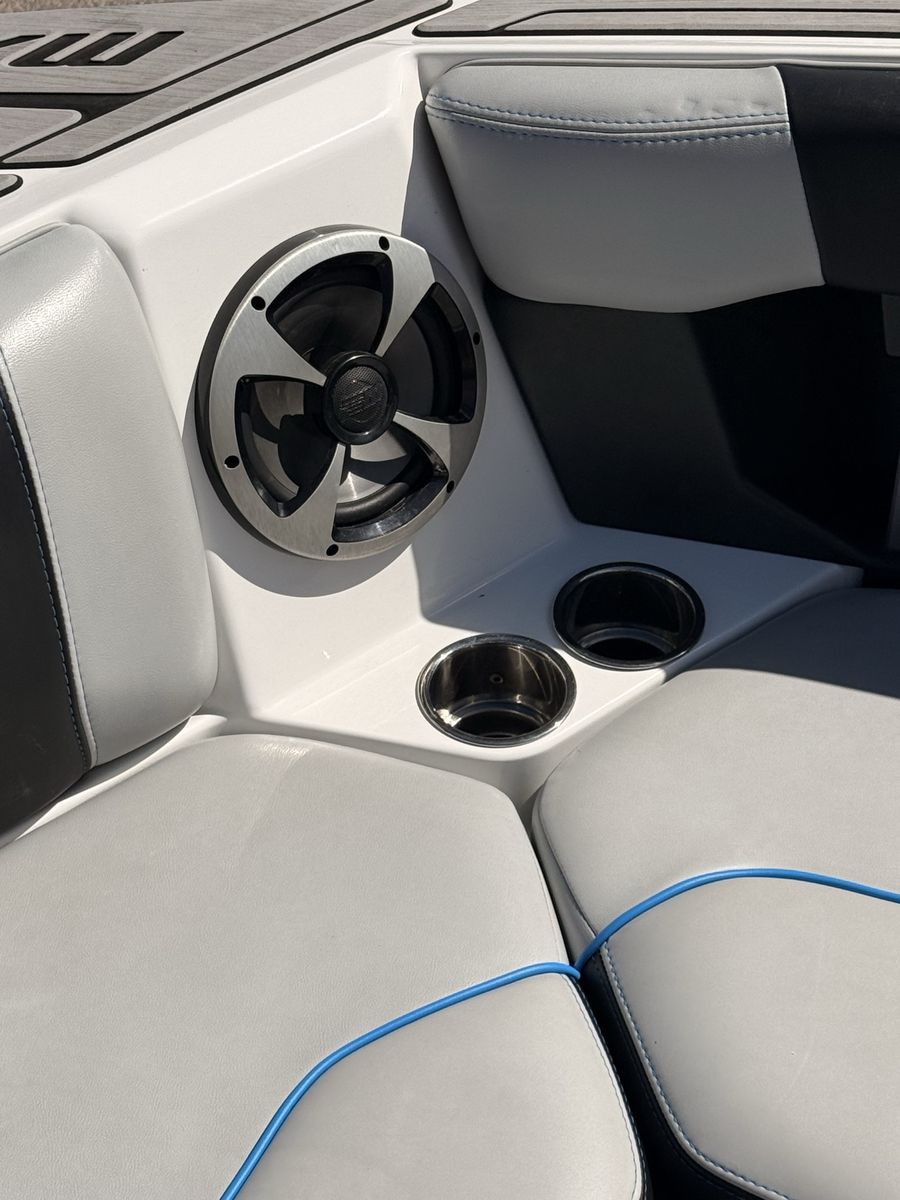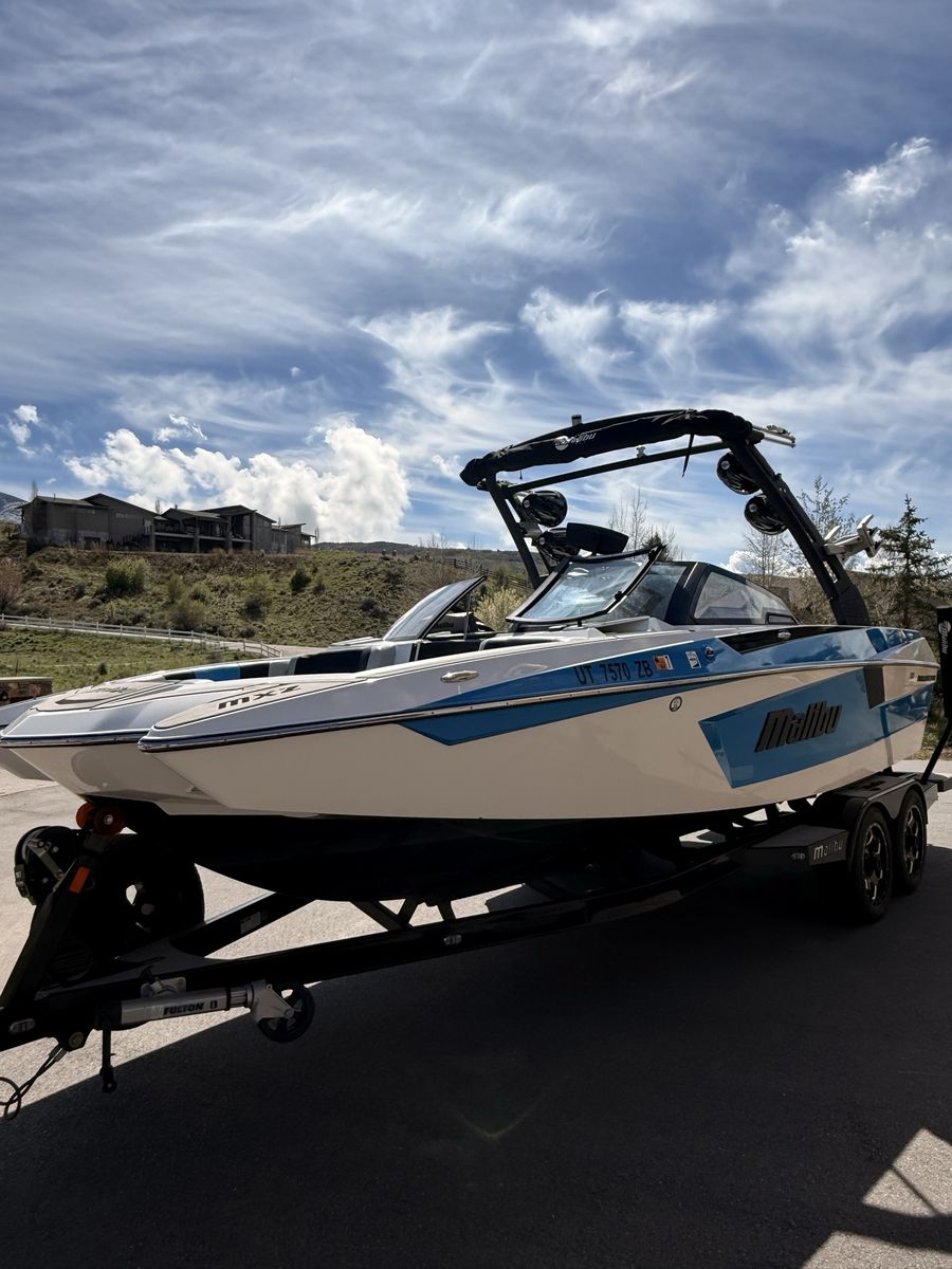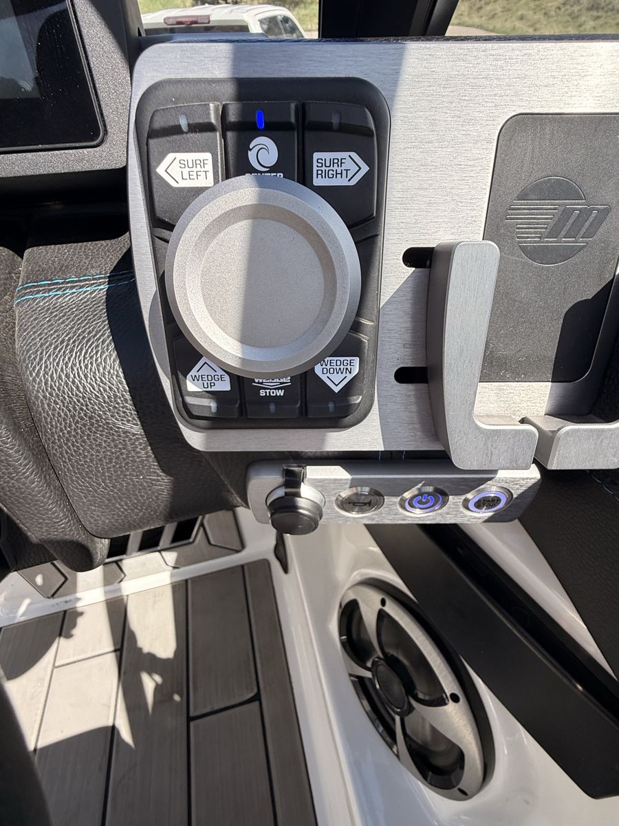 M6Di surf boat. Stored year round in climate control. Up on all service. Auto everything. Extra ballasts. Wave adjust and audio wrist control. Extra props as part of “weekend wrecker kit”. Trailer included.